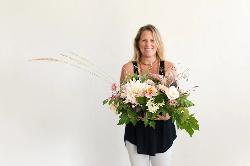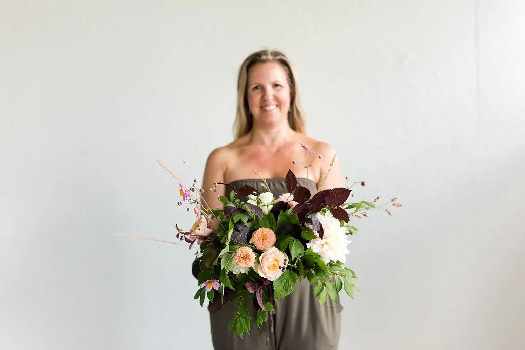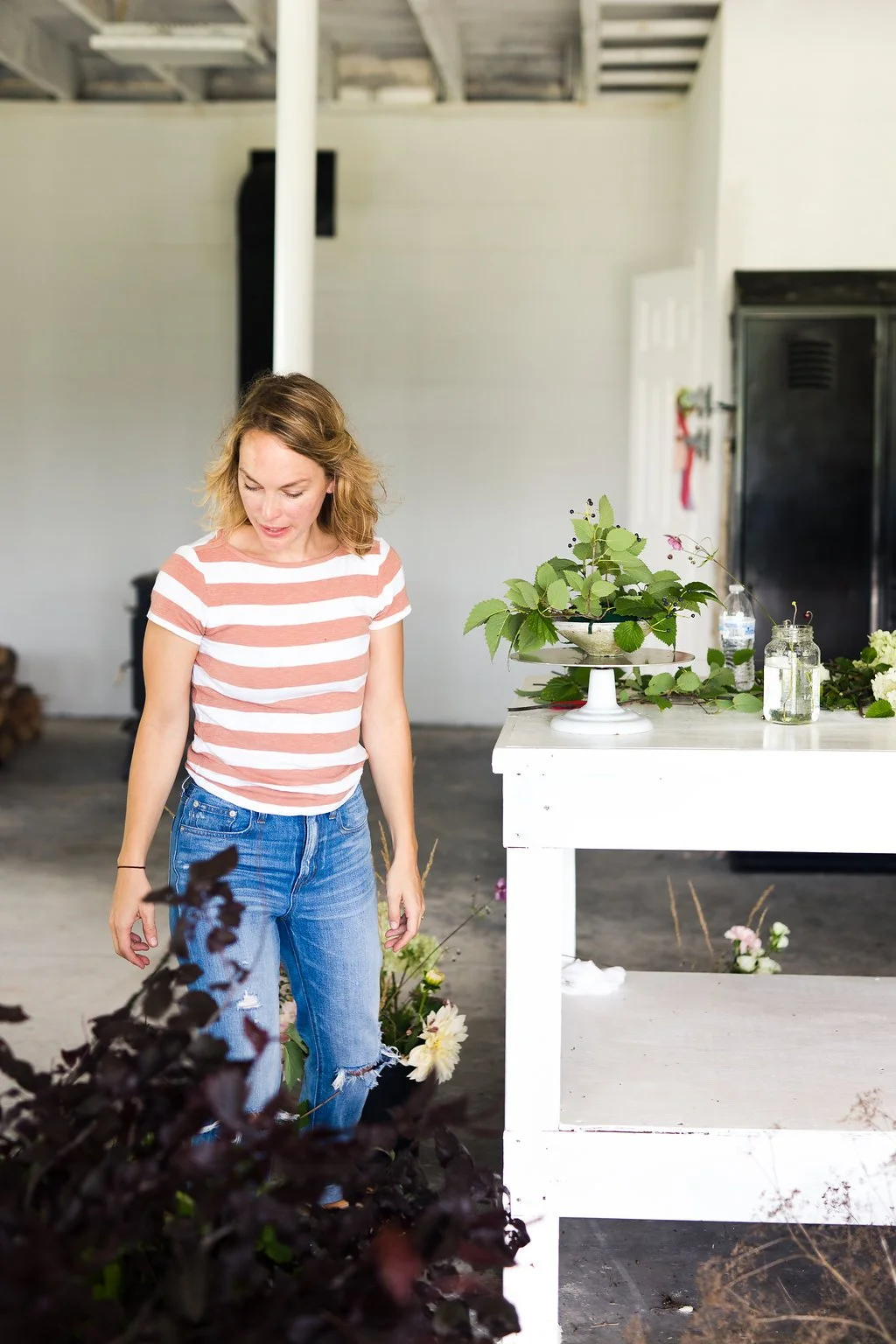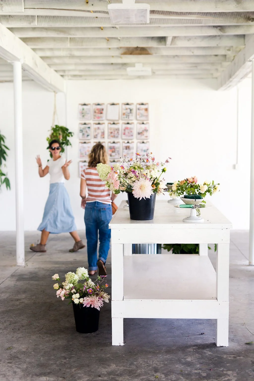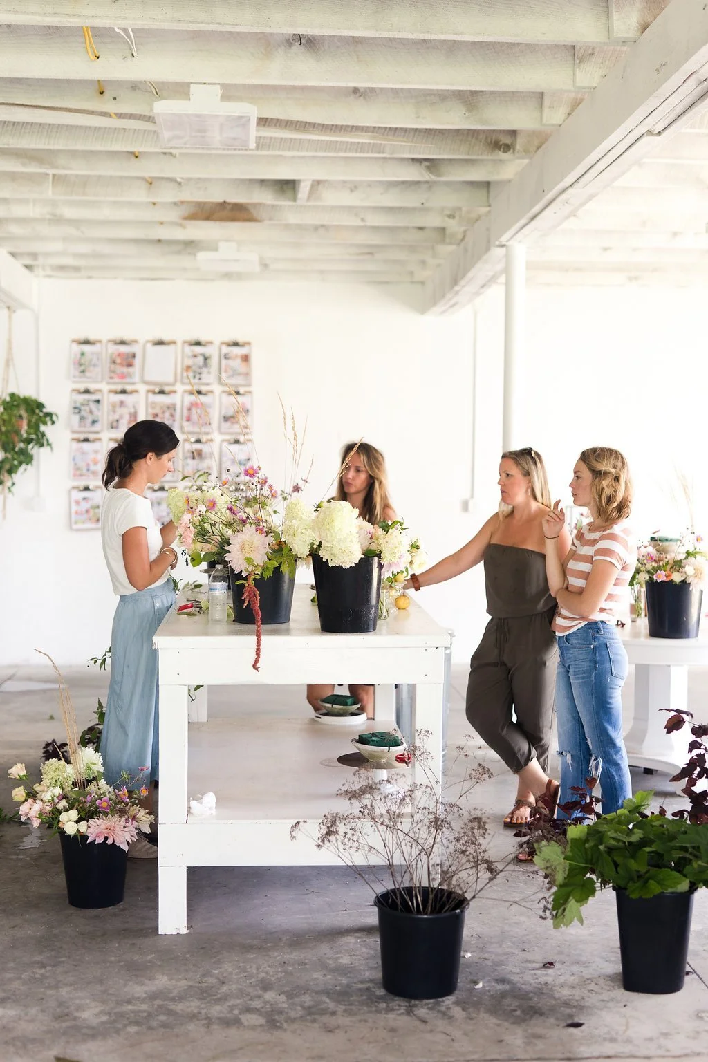In addition to working with Sophie at Blossom and Vine, I also work at Sol Yoga in Frederick, MD. One day over the summer, I was talking to Erin, a yoga teacher, and she suggested we do a staff flower workshop because yoga and flowers clearly go hand-in-hand. So we set a date and invited the staff out to Daphne Hill for a floral design workshop. We asked Jen of Jen S Photography to come take photos and create an arrangement with us (she turned out to be one heck of a designer!). The day was warm and lovely and we had a blast getting to arrange just for fun and share the beauty of flowers with the Sol team. The icing on the cake, though, was when studio founder, Dorcas McWilliams, surprised us all and showed up at the workshop straight from the airport. She lives in New Caledonia and runs the studio remotely. She had secretly made plans to be in town during the workshop and to be present for the 300 hour teacher graduation, taking place the same weekend. The BEST surprise and the best day.