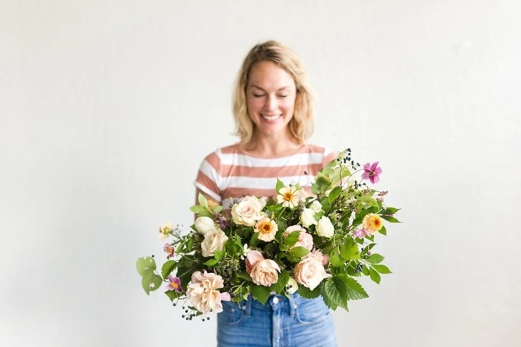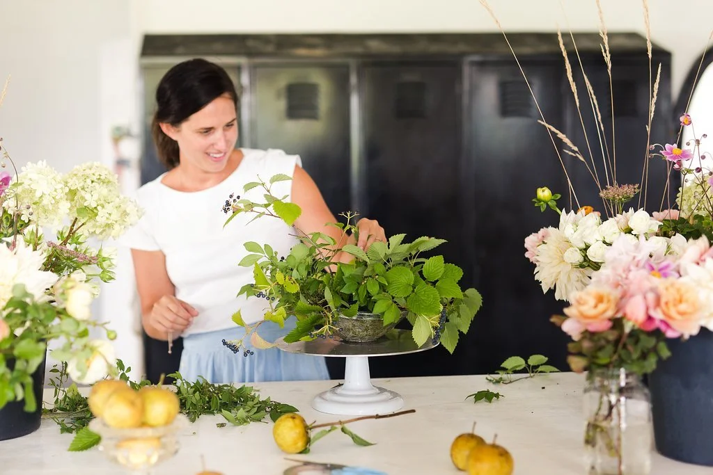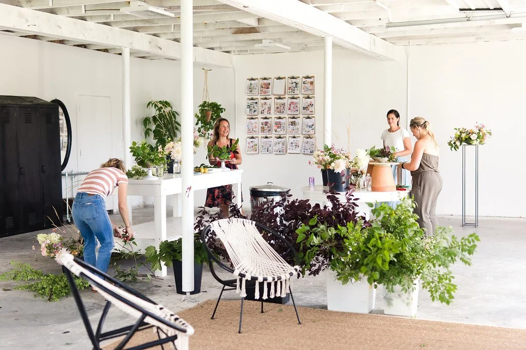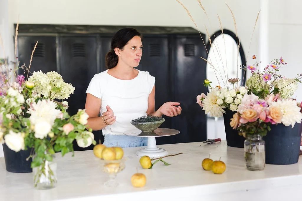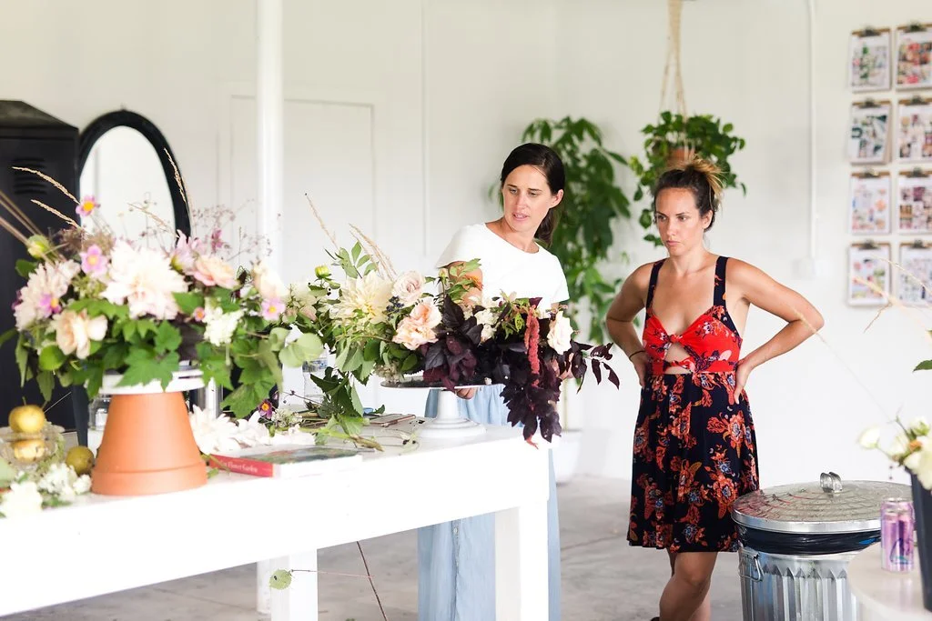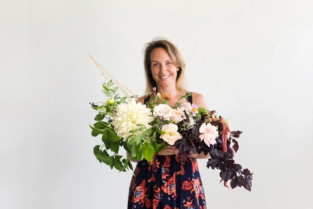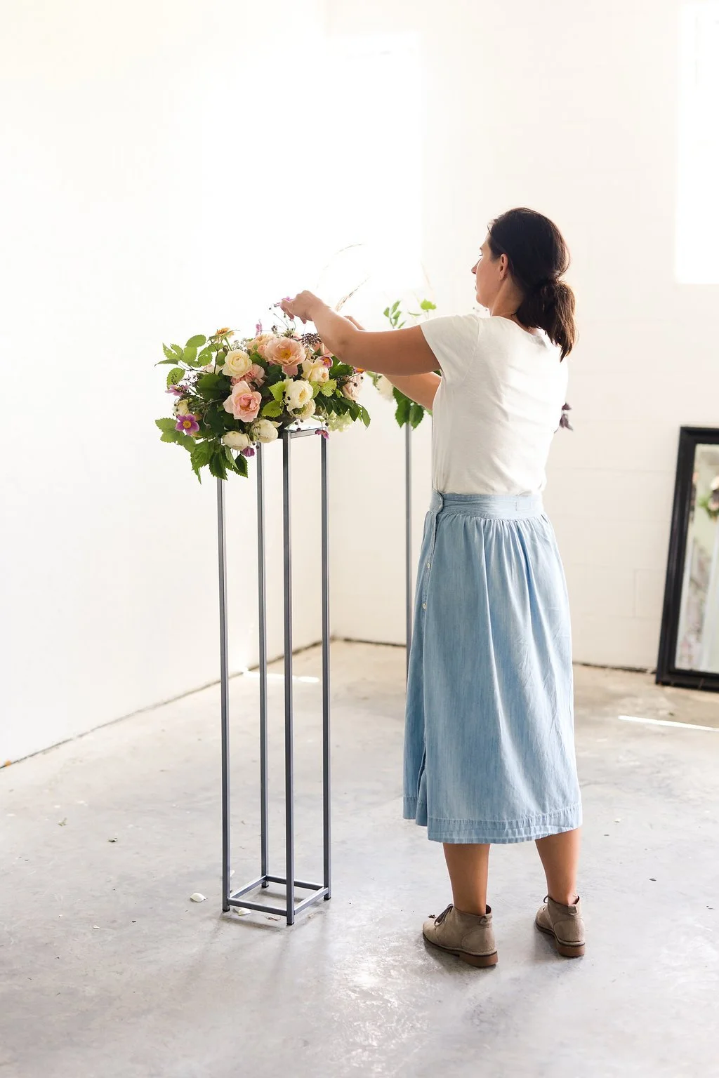In addition to working with Sophie at Blossom and Vine, I also work at Sol Yoga in Frederick, MD. One day over the summer, I was talking to Erin, a yoga teacher, and she suggested we do a staff flower workshop because yoga and flowers clearly go hand-in-hand. So we set a date and invited the staff out to Daphne Hill for a floral design workshop. We asked Jen of Jen S Photography to come take photos and create an arrangement with us (she turned out to be one heck of a designer!). The day was warm and lovely and we had a blast getting to arrange just for fun and share the beauty of flowers with the Sol team. The icing on the cake, though, was when studio founder, Dorcas McWilliams, surprised us all and showed up at the workshop straight from the airport. She lives in New Caledonia and runs the studio remotely. She had secretly made plans to be in town during the workshop and to be present for the 300 hour teacher graduation, taking place the same weekend. The BEST surprise and the best day.