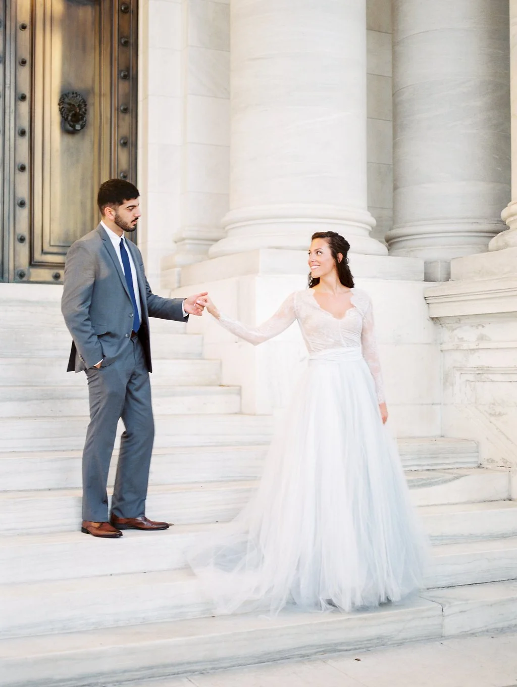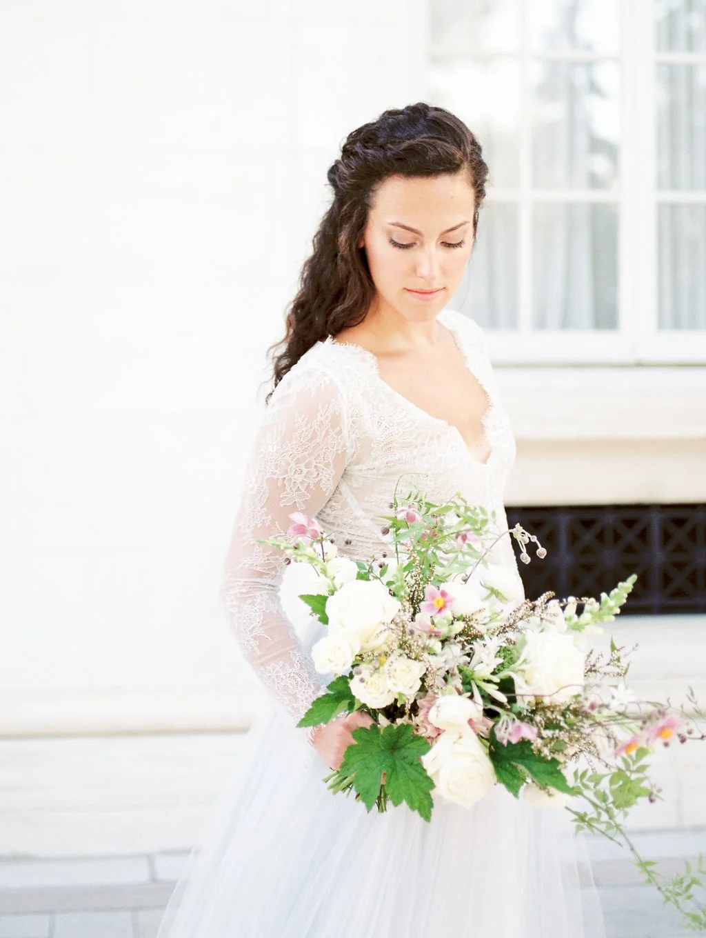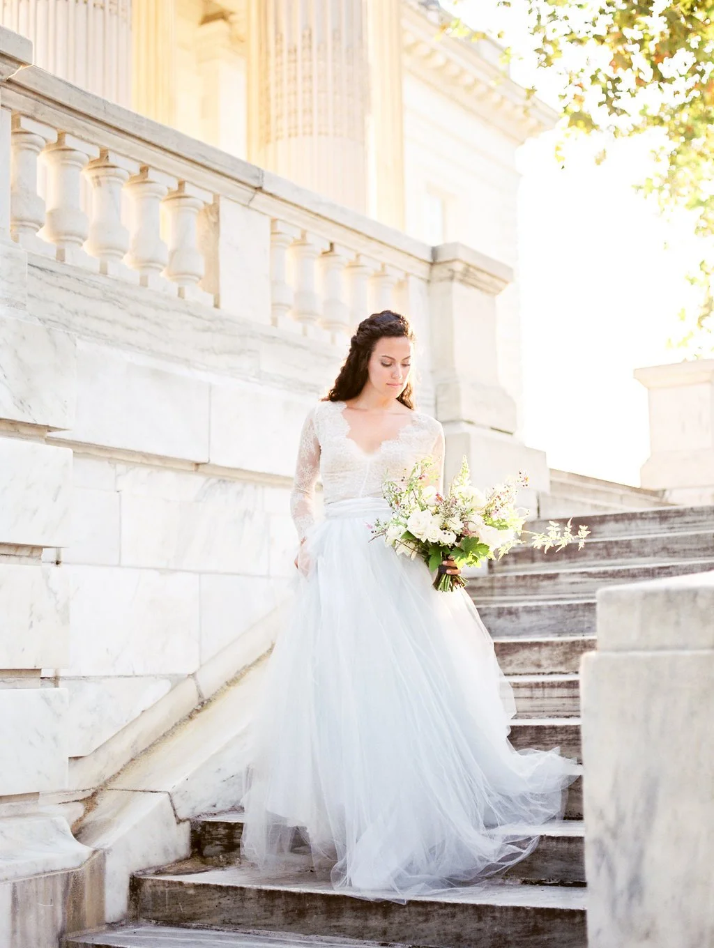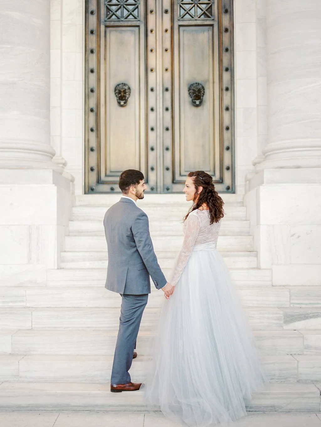 When Alicia Lacey approached me about this DC elopement shoot, at DAR Constitution Hall, I was SO excited to work with the amazing vendors and colonial exterior of the building. The building is rich in history and aesthetic and the light blue tulle gown by Sweet Caroline Styles was a perfect contrast to the grandiose white columns.