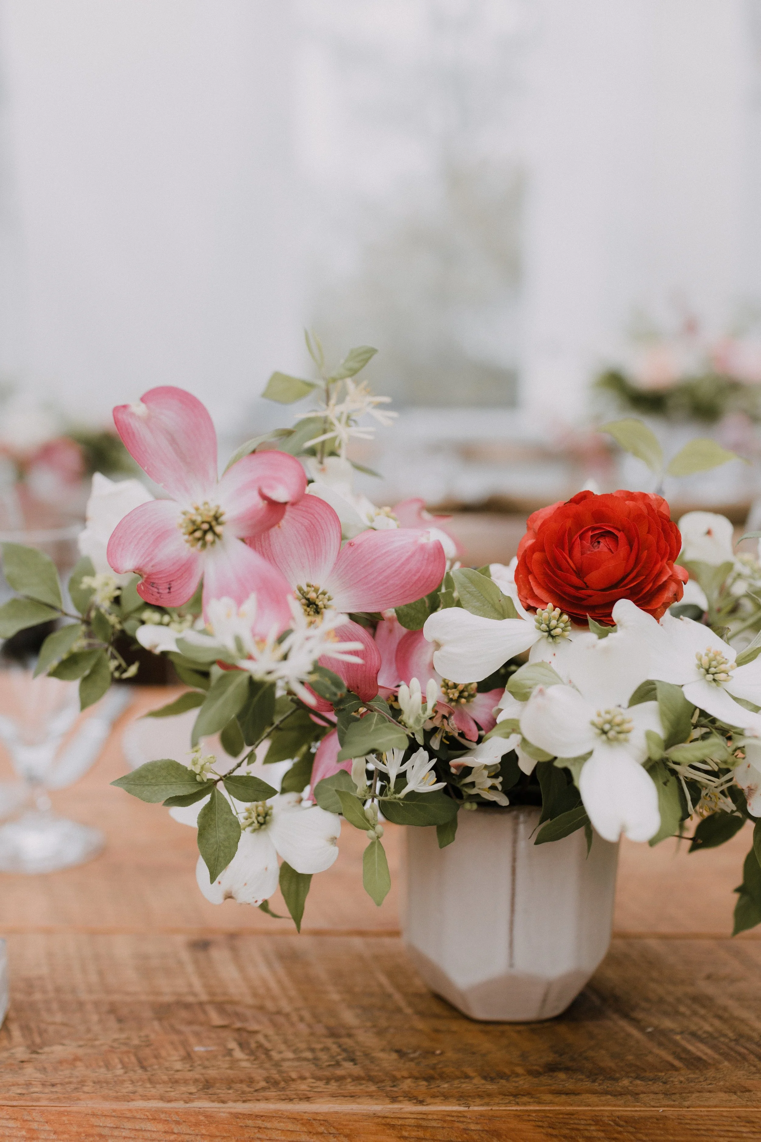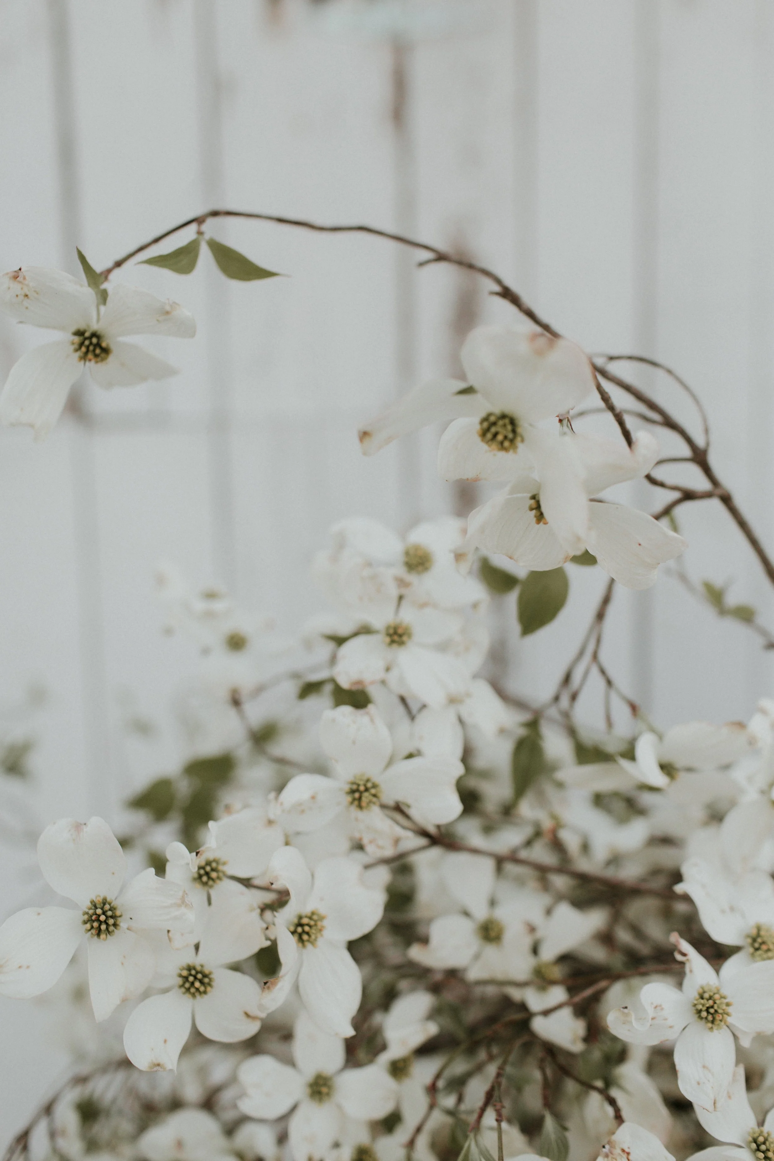 We used dogwood blossoms in just about every wedding this spring. The delicate, 4 pronged flowers add beautiful lines to any floral arrangement large or small. We used long, arching pink branches for statement pieces in one of our April weddings and complimented the large arrangements by featuring the flowers in satellite arrangements as well. We are already missing these gorgeous, fragrant blooms as blossoming branch season gives way to a summer full of flowers!