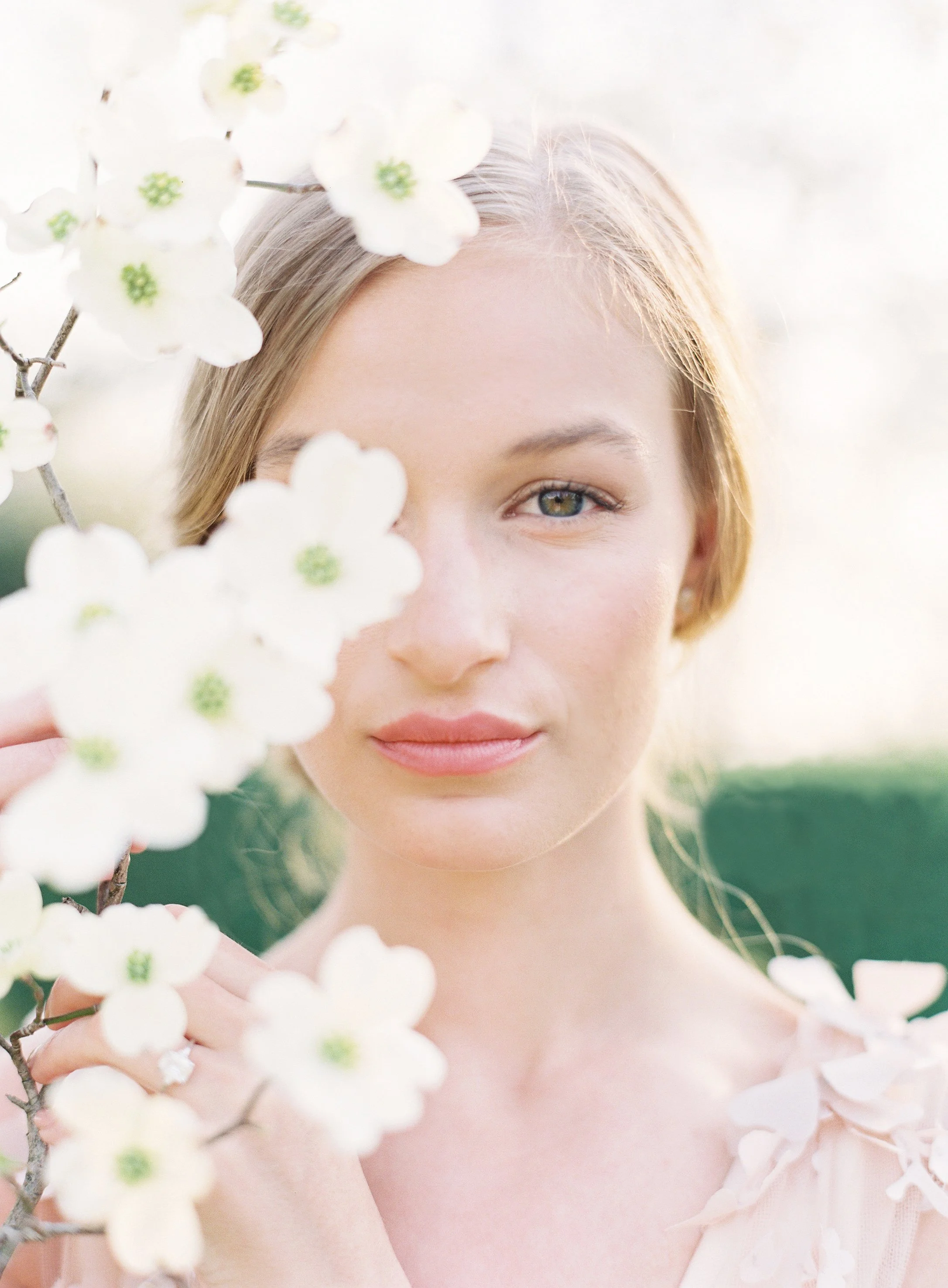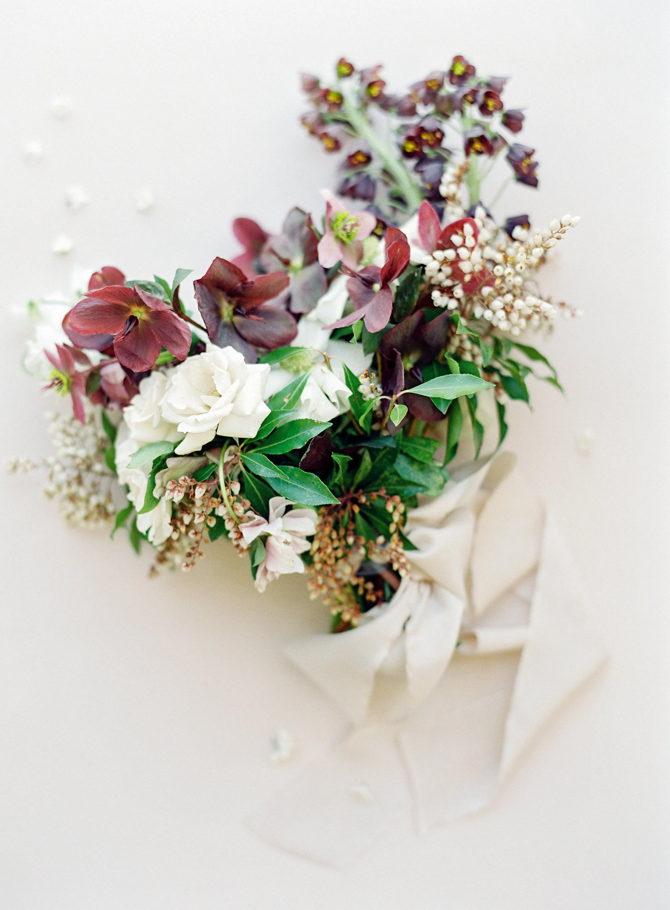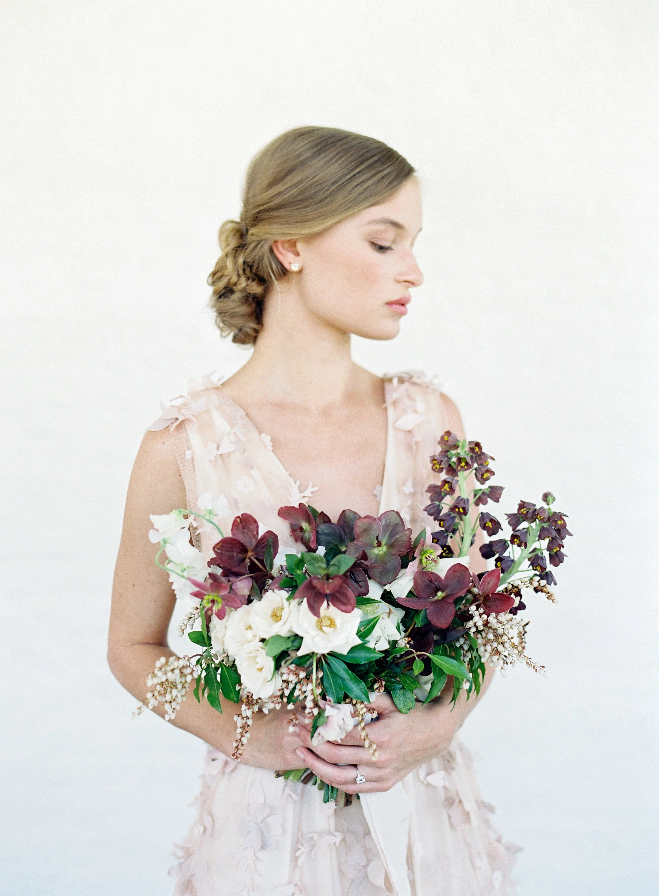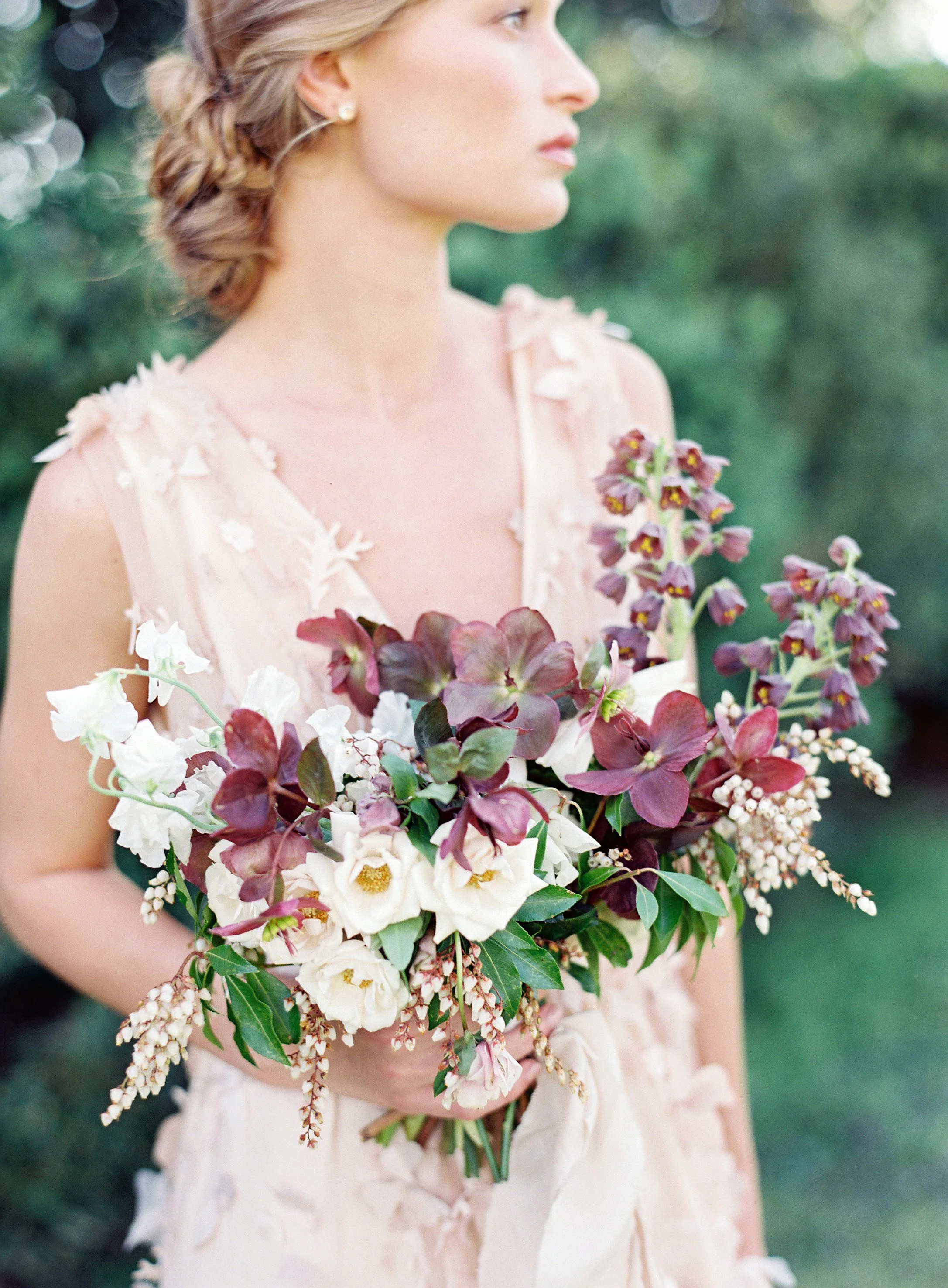 When Elizabeth of East Made Event Company asks me to work on a styled shoot with her, I know it's going to be perfection down to every last detail. She is just so meticulous and has a fantastic eye for elegance and beauty. This shoot was planned around the old dogwood tree that sits on the property at North Point Plantation near Richmond, VA. Our textural bridal bouquet and arrangement were inspired by spring blooms including dogwood and locally foraged hellebore. We crossed our fingers in hopes that the dogwood tree would be in bloom in time for this shoot - and it was. Rachel May captured the entire day perfectly, and we were completely thrilled when we found out this was featured on Once Wed.