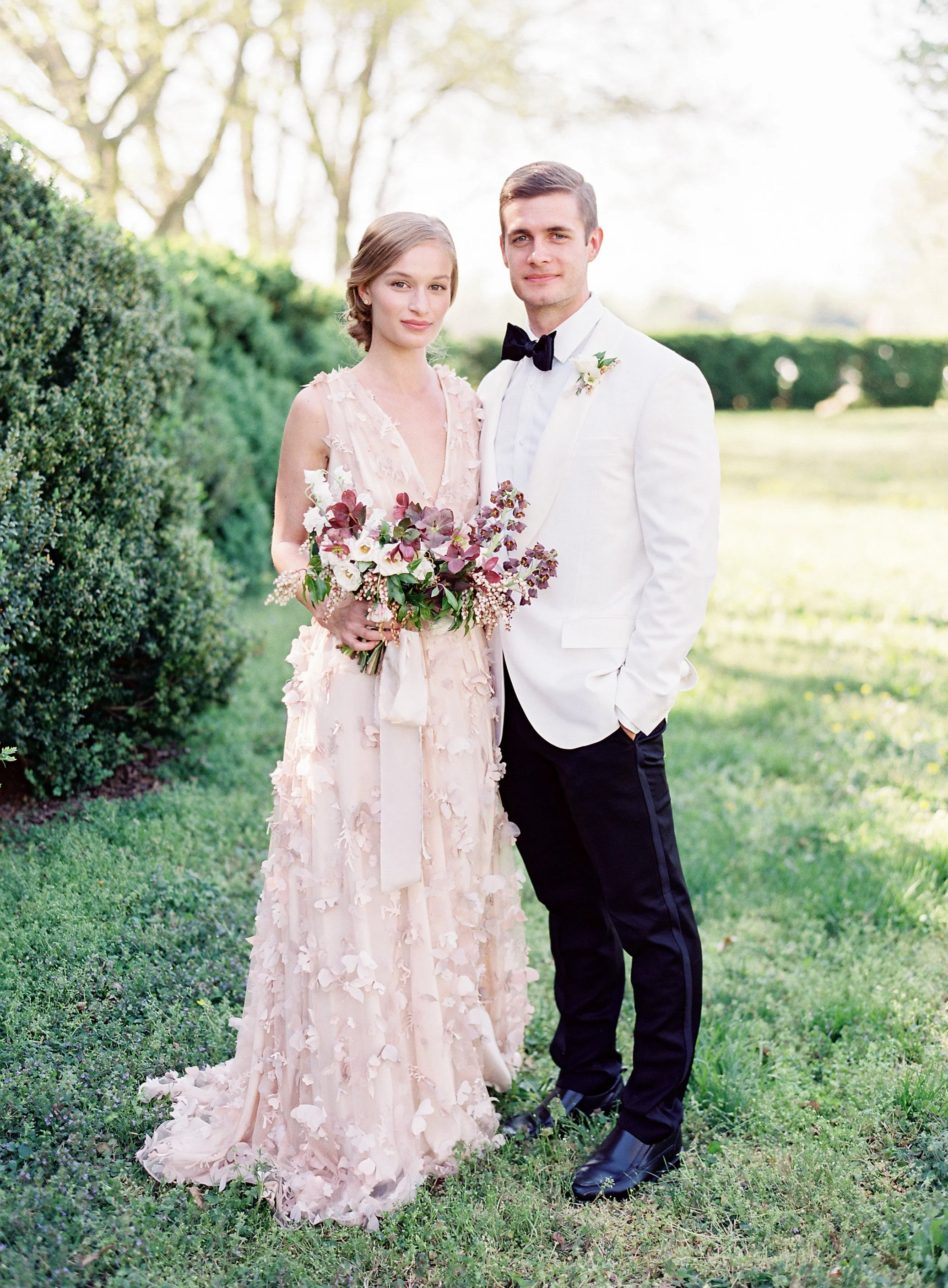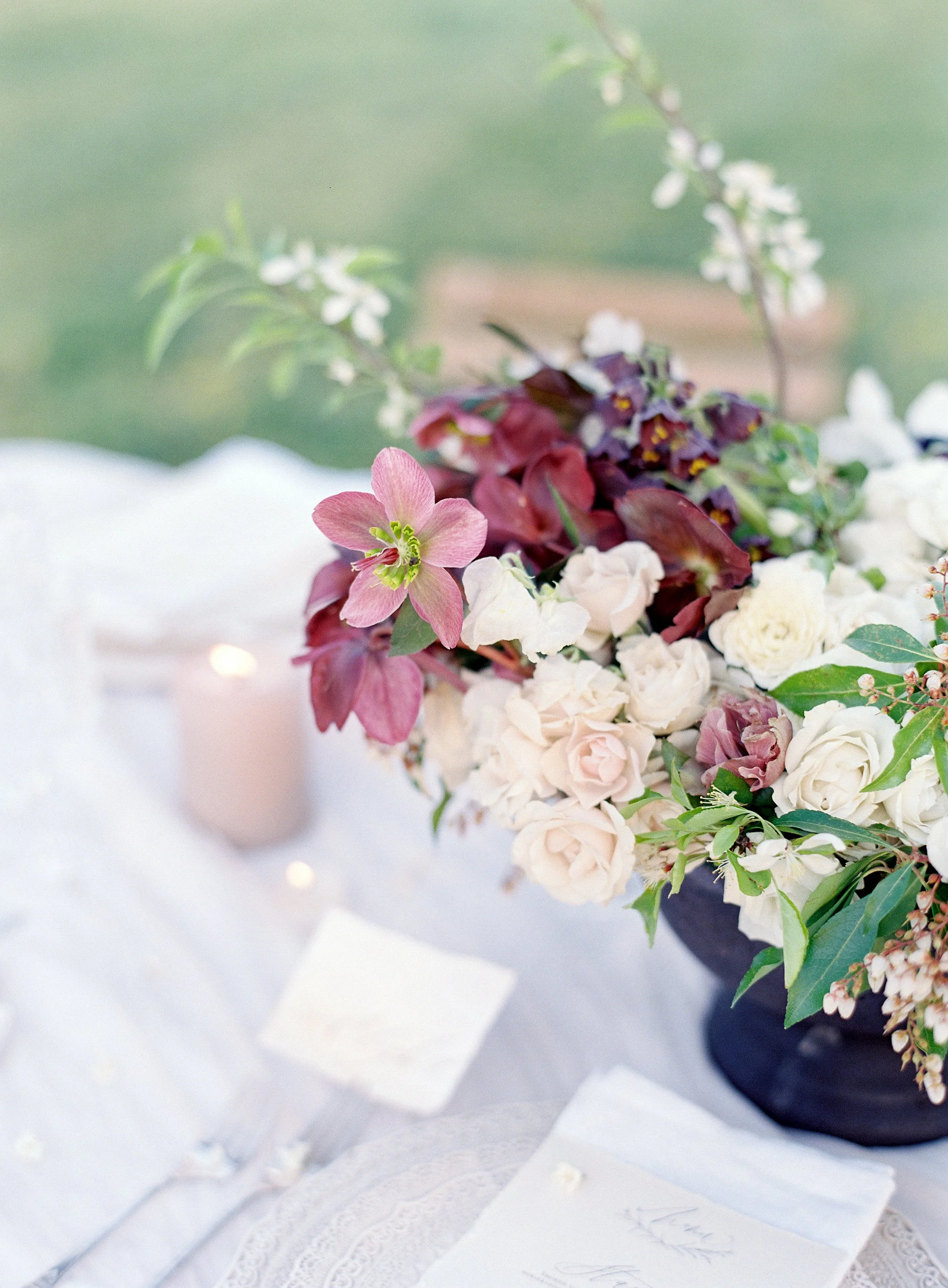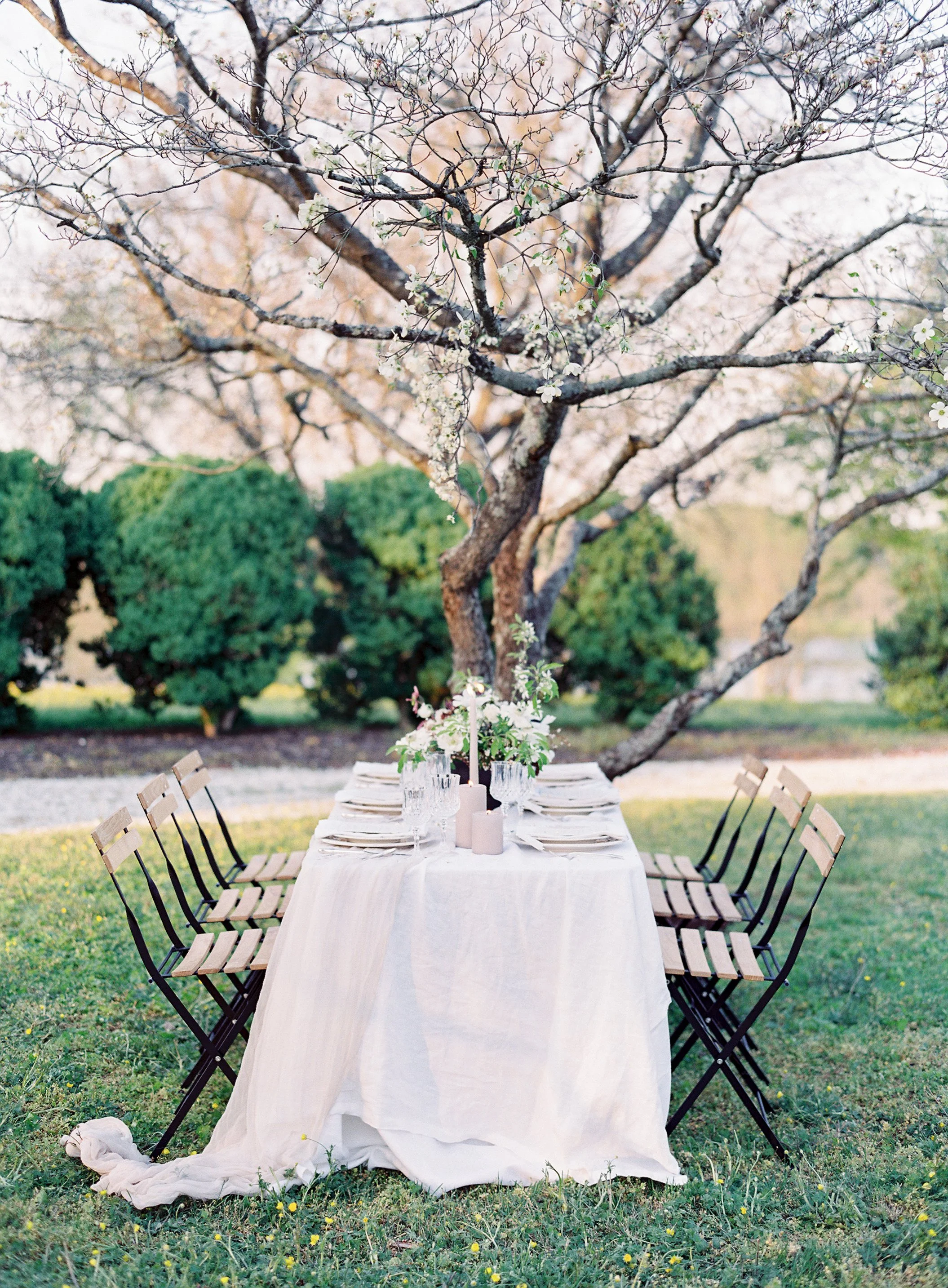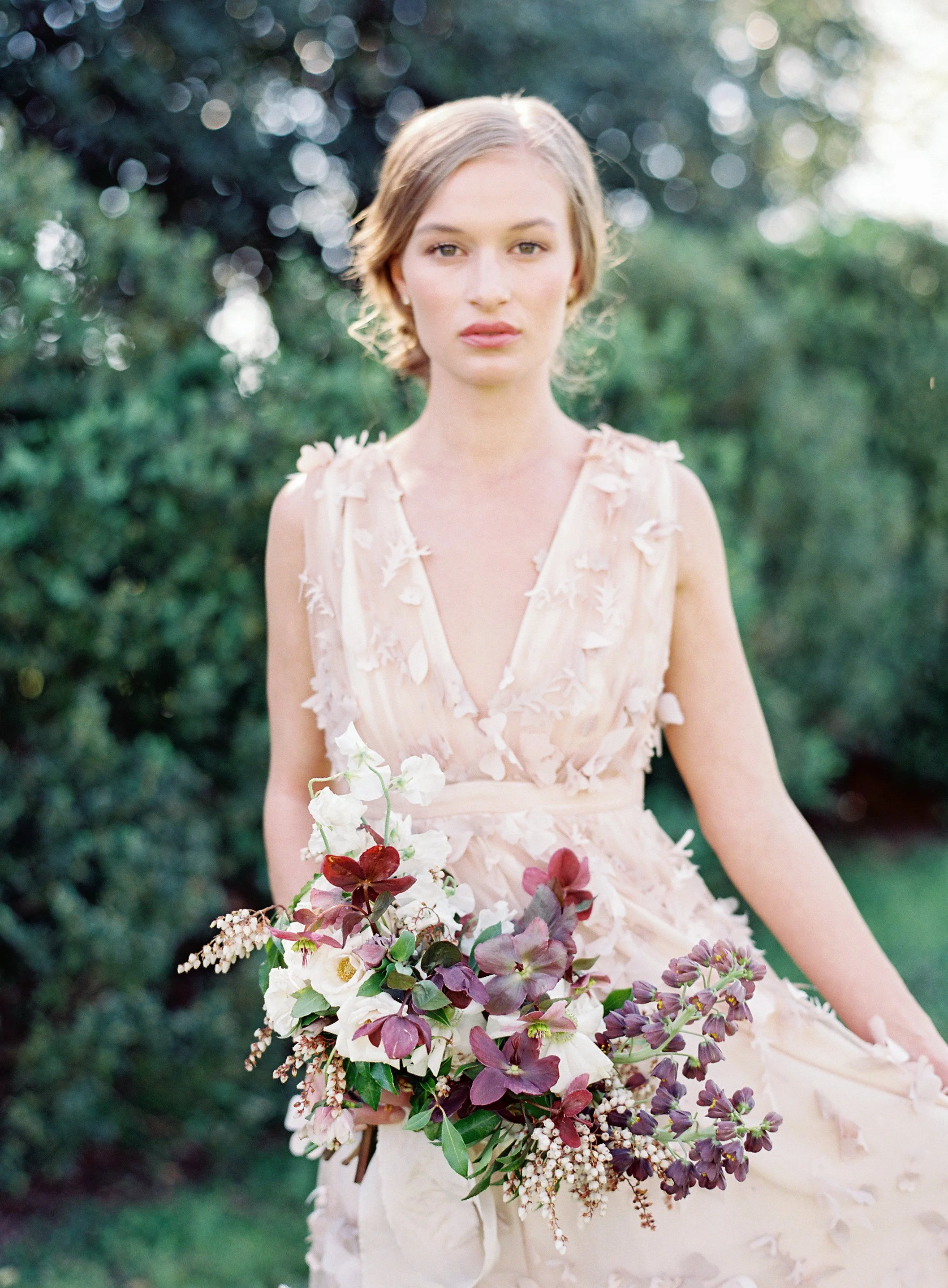 When Elizabeth of East Made Event Company asks me to work on a styled shoot with her, I know it's going to be perfection down to every last detail. She is just so meticulous and has a fantastic eye for elegance and beauty. This shoot was planned around the old dogwood tree that sits on the property at North Point Plantation near Richmond, VA. Our textural bridal bouquet and arrangement were inspired by spring blooms including dogwood and locally foraged hellebore. We crossed our fingers in hopes that the dogwood tree would be in bloom in time for this shoot - and it was. Rachel May captured the entire day perfectly, and we were completely thrilled when we found out this was featured on Once Wed.