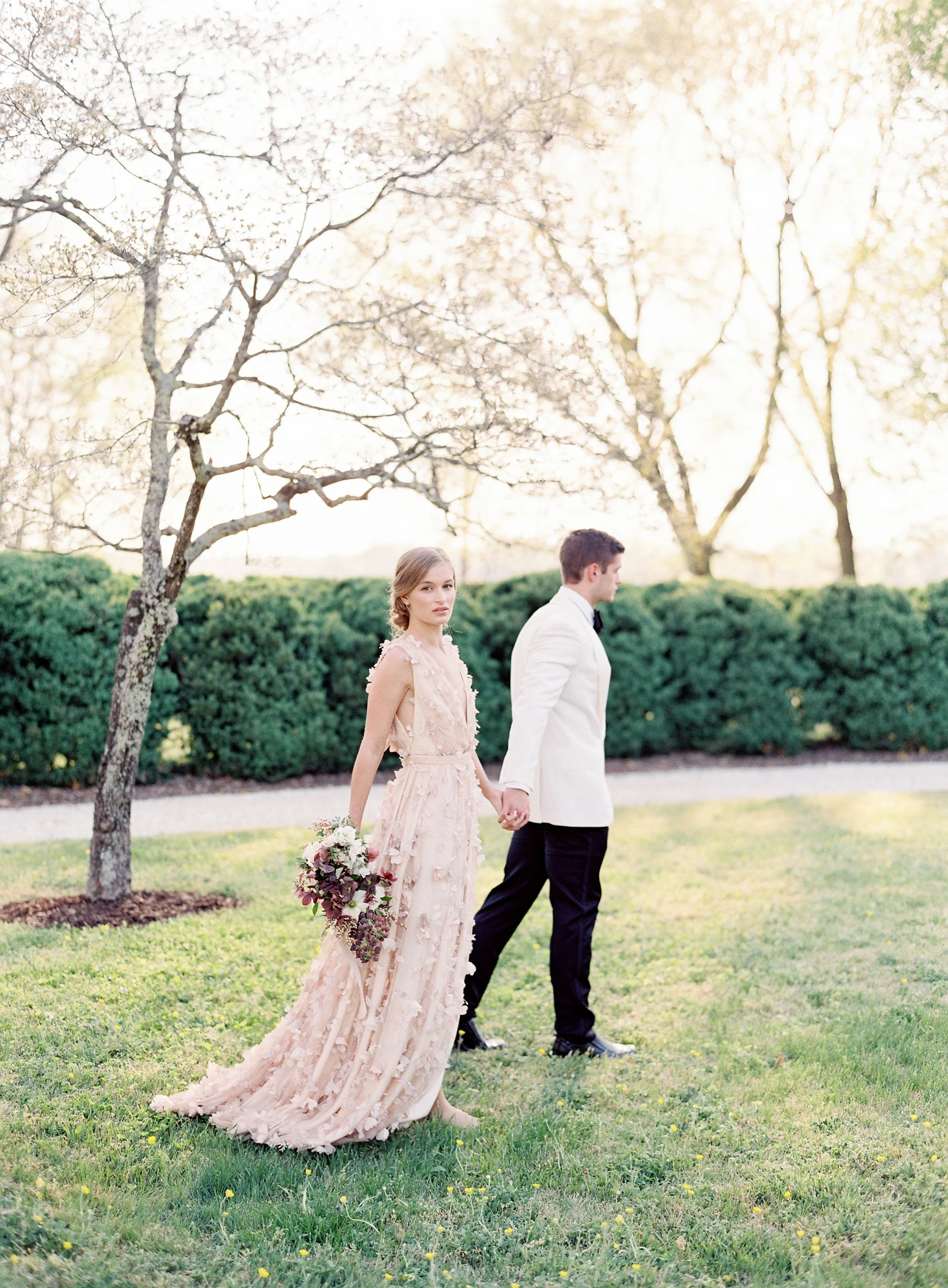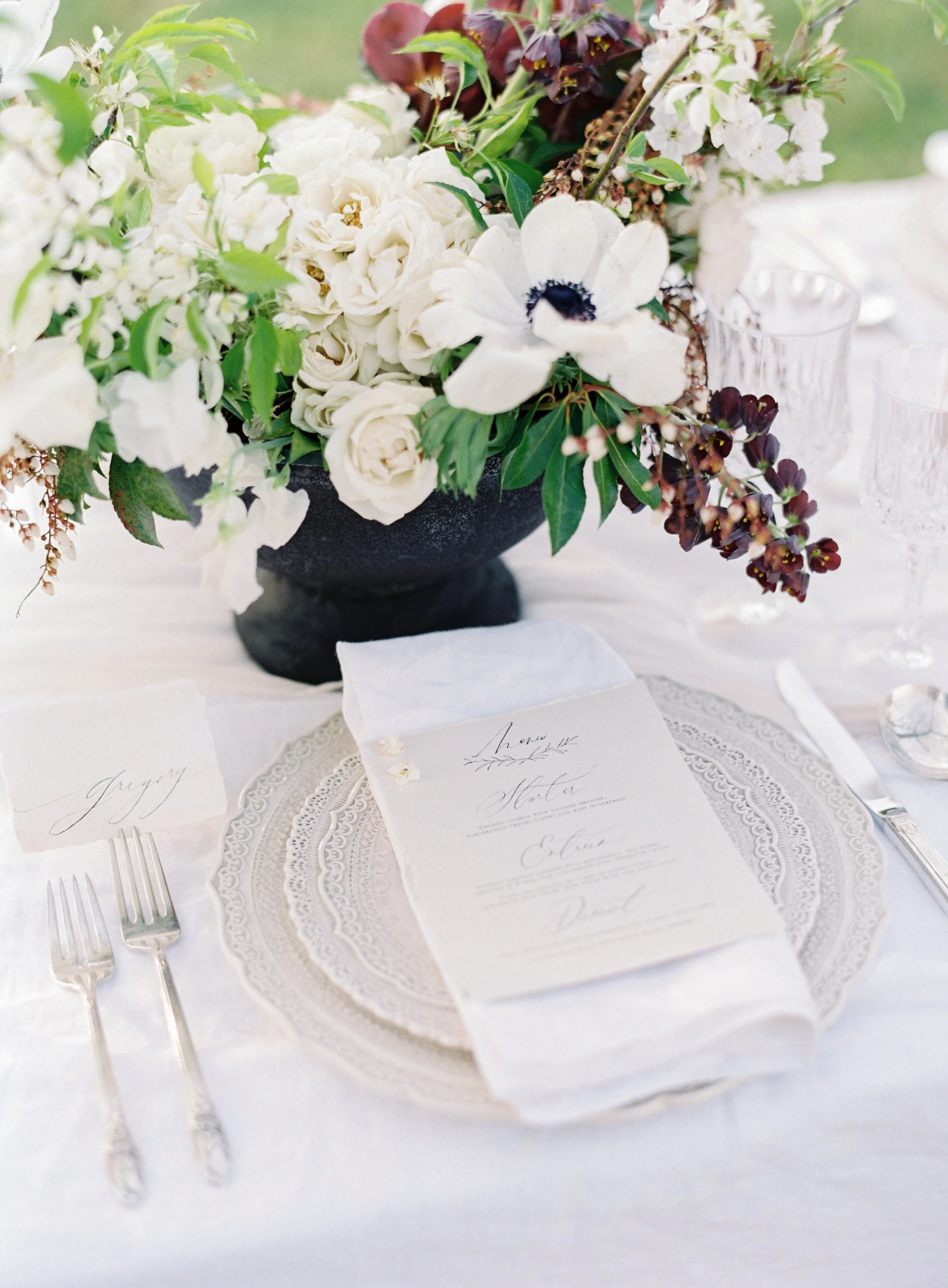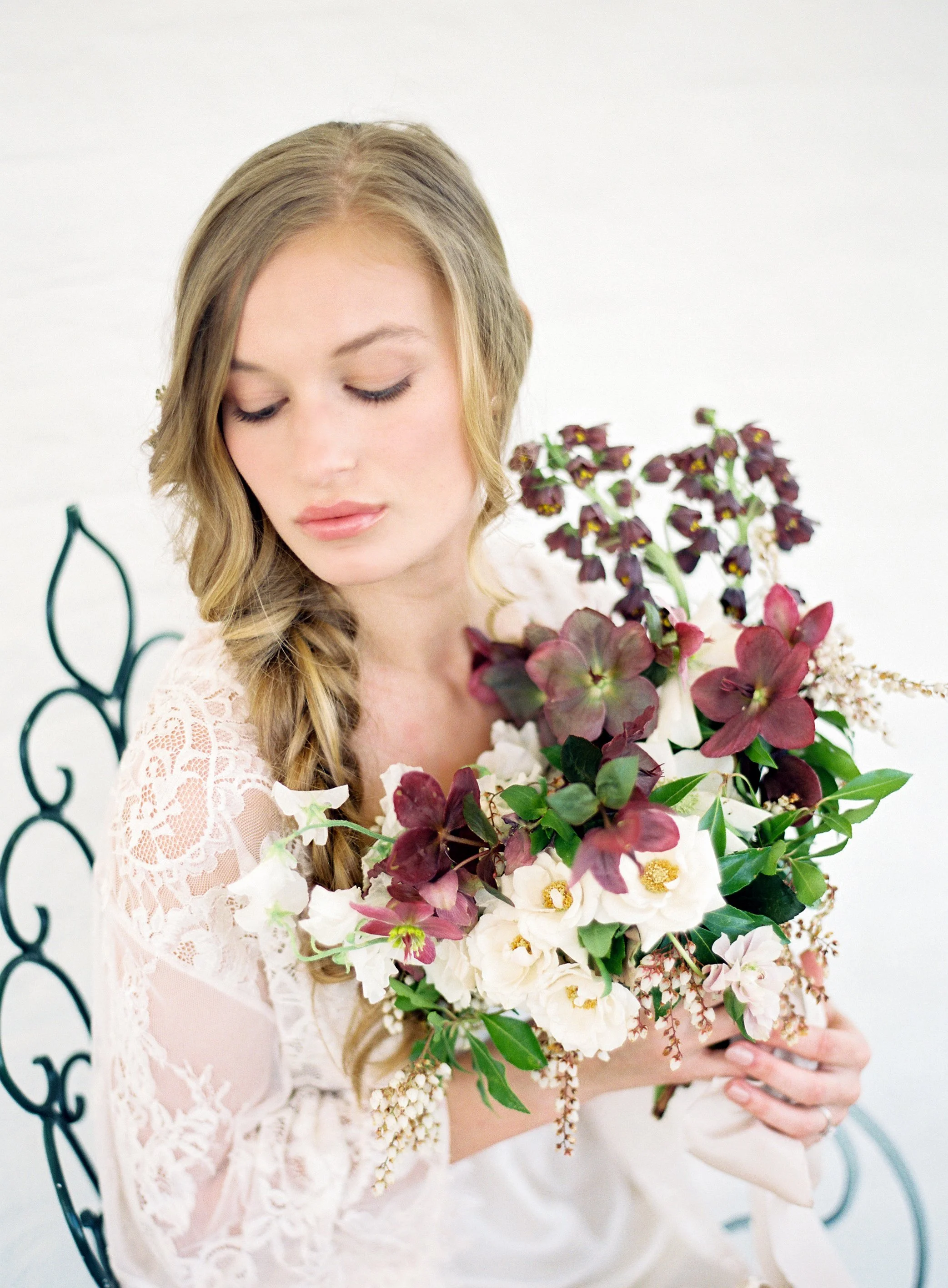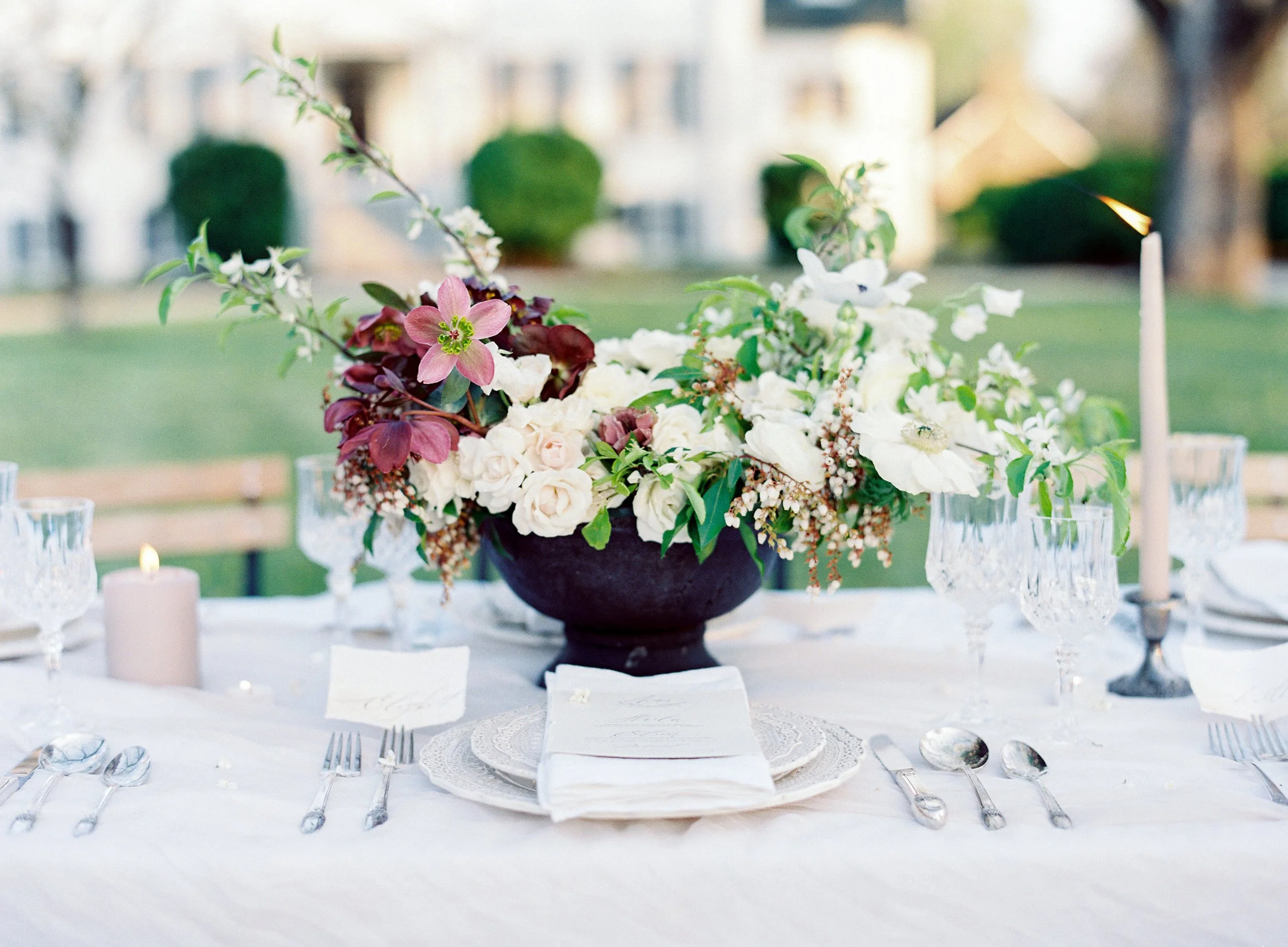 When Elizabeth of East Made Event Company asks me to work on a styled shoot with her, I know it's going to be perfection down to every last detail. She is just so meticulous and has a fantastic eye for elegance and beauty. This shoot was planned around the old dogwood tree that sits on the property at North Point Plantation near Richmond, VA. Our textural bridal bouquet and arrangement were inspired by spring blooms including dogwood and locally foraged hellebore. We crossed our fingers in hopes that the dogwood tree would be in bloom in time for this shoot - and it was. Rachel May captured the entire day perfectly, and we were completely thrilled when we found out this was featured on Once Wed.