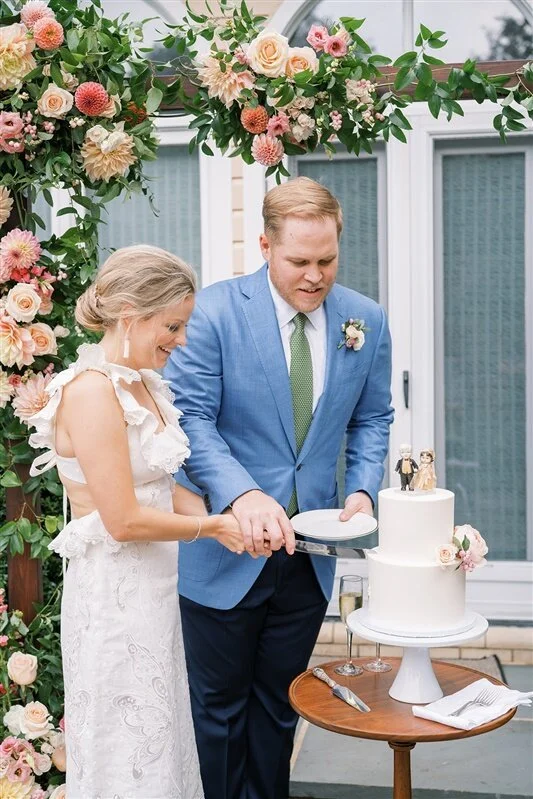 Our fun-loving bride Bennett and her husband Kirk held an intimate ceremony at her family home this past September. While they are planning to have a grand celebration this fall (fingers crossed), they wanted to make this day just as special. Our REFINED collection in Coral and Citrus was the perfect choice for Bennett, as it the incorporated bright orange, peach, and pink tones of her original mood board. Bringing in local dahlias, zinnias, and greenery really made everything pop. Photography by Bonnie Sen and planning by A. Dominick Events.