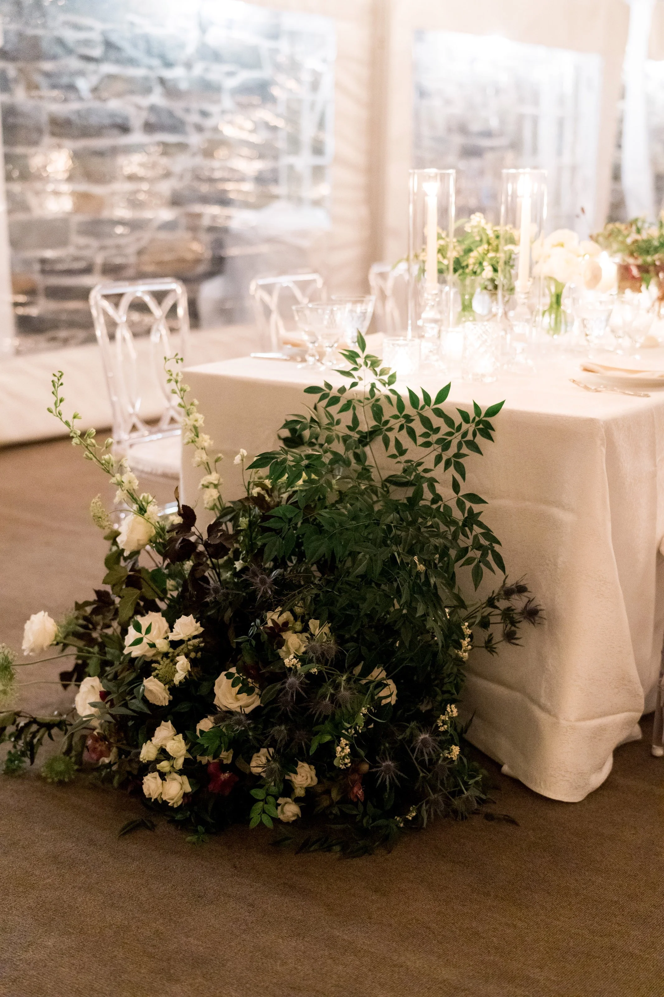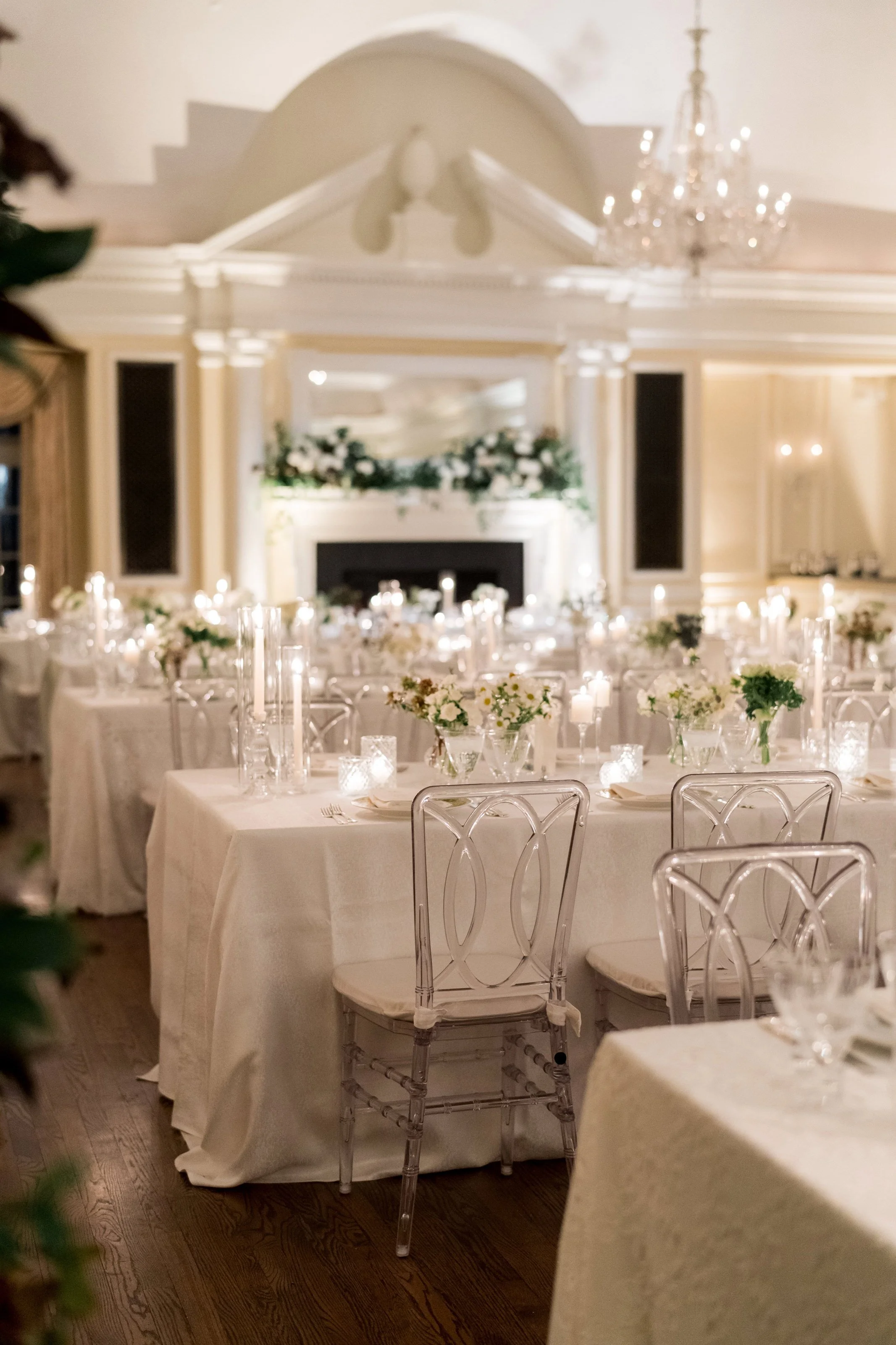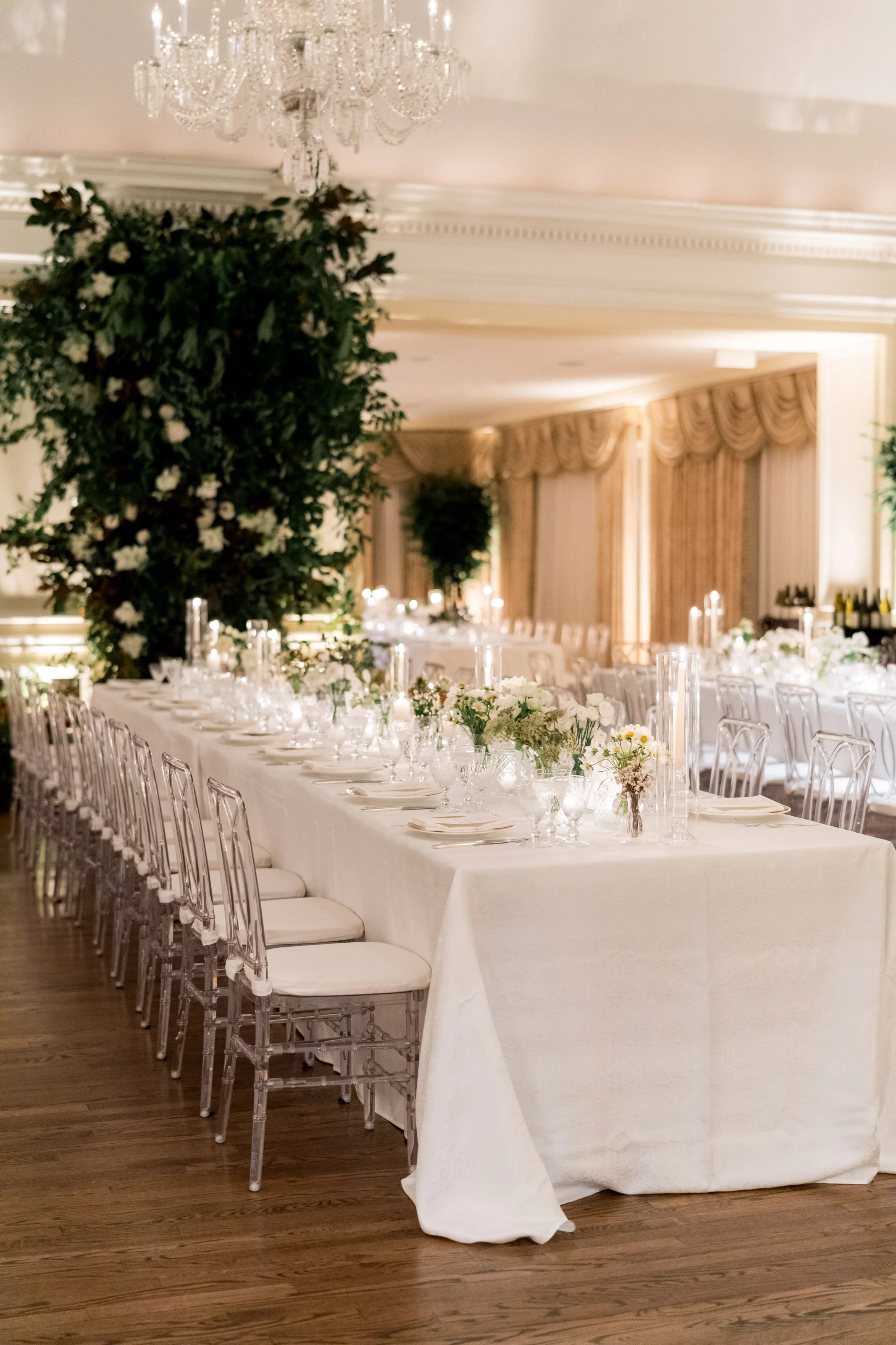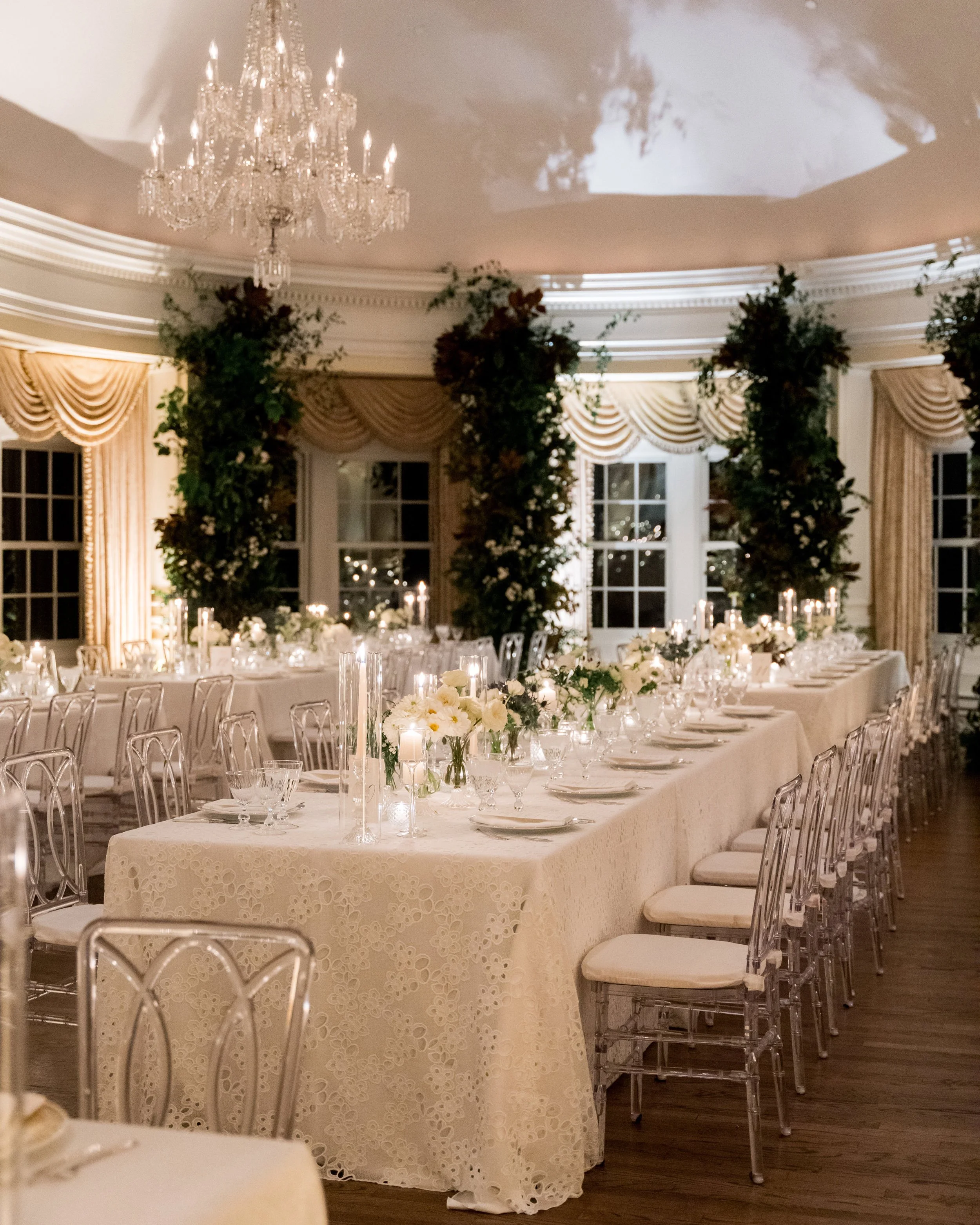 Avery and Tim’s wedding day was lush, romantic and full of foliage-forward installations in the reception. We loved being able to create a show-stopping moment surrounding the windows with simple mono-floral tables to accent. Planning by Arney Walker and photography by Liz Banfield.