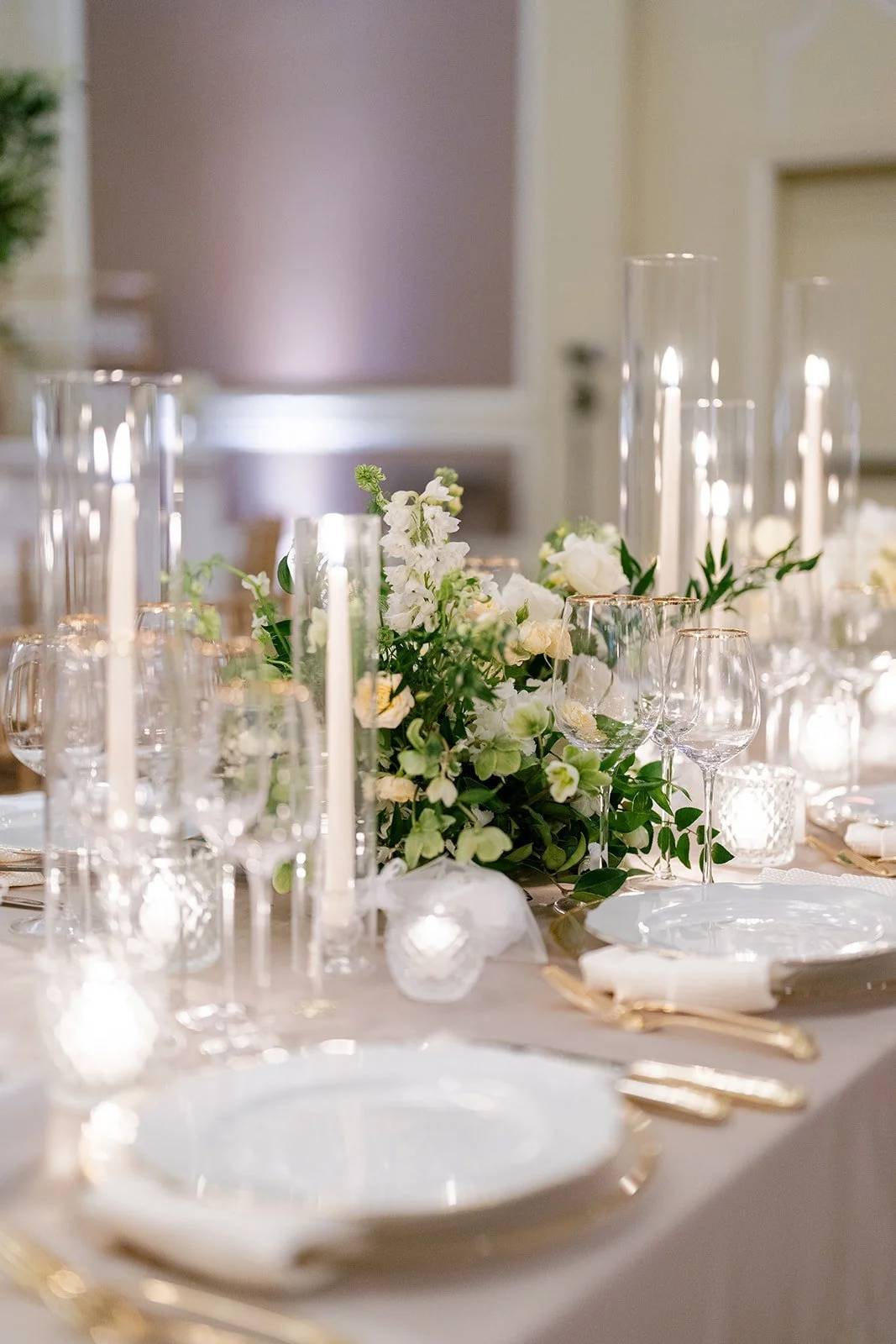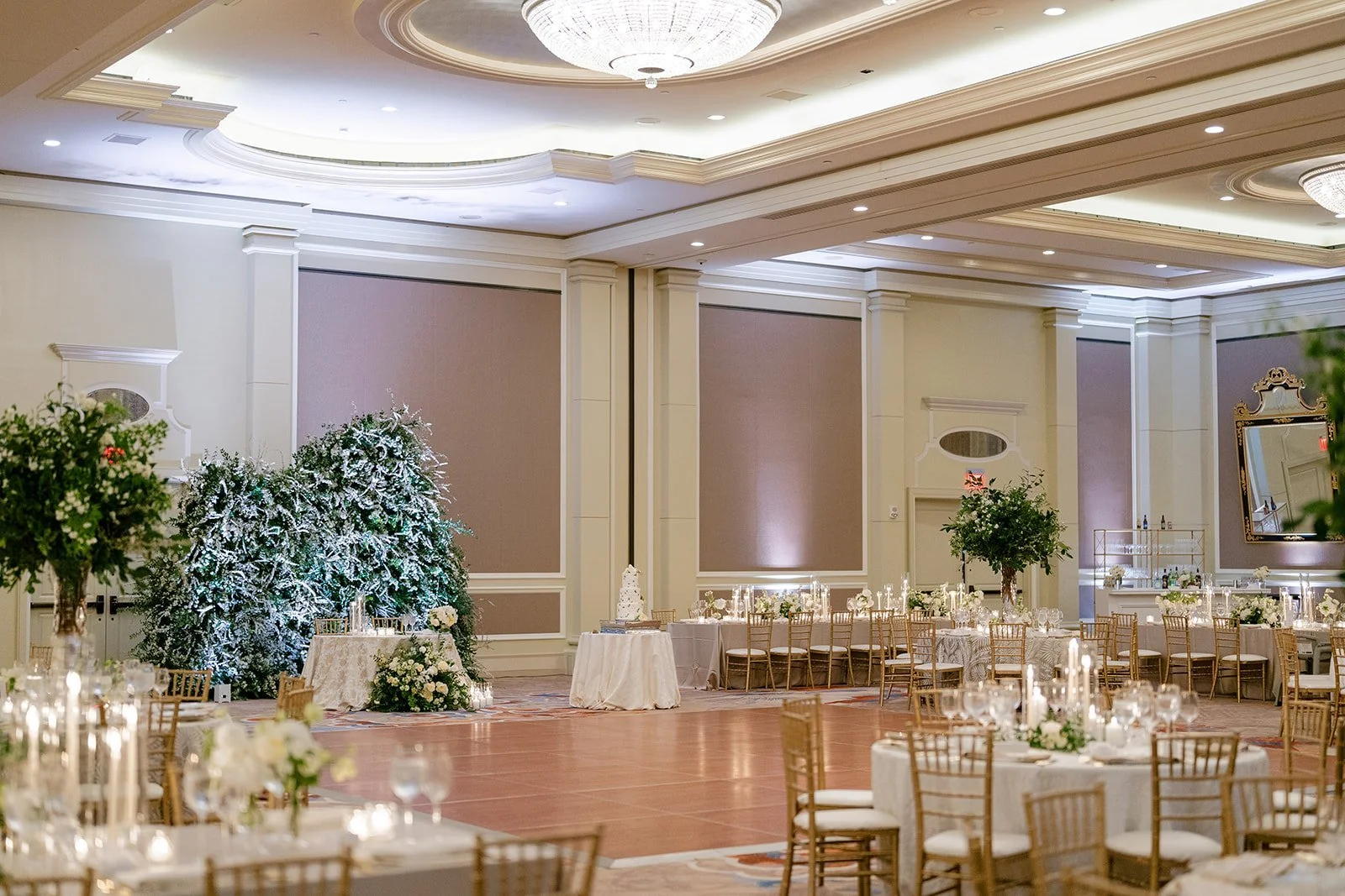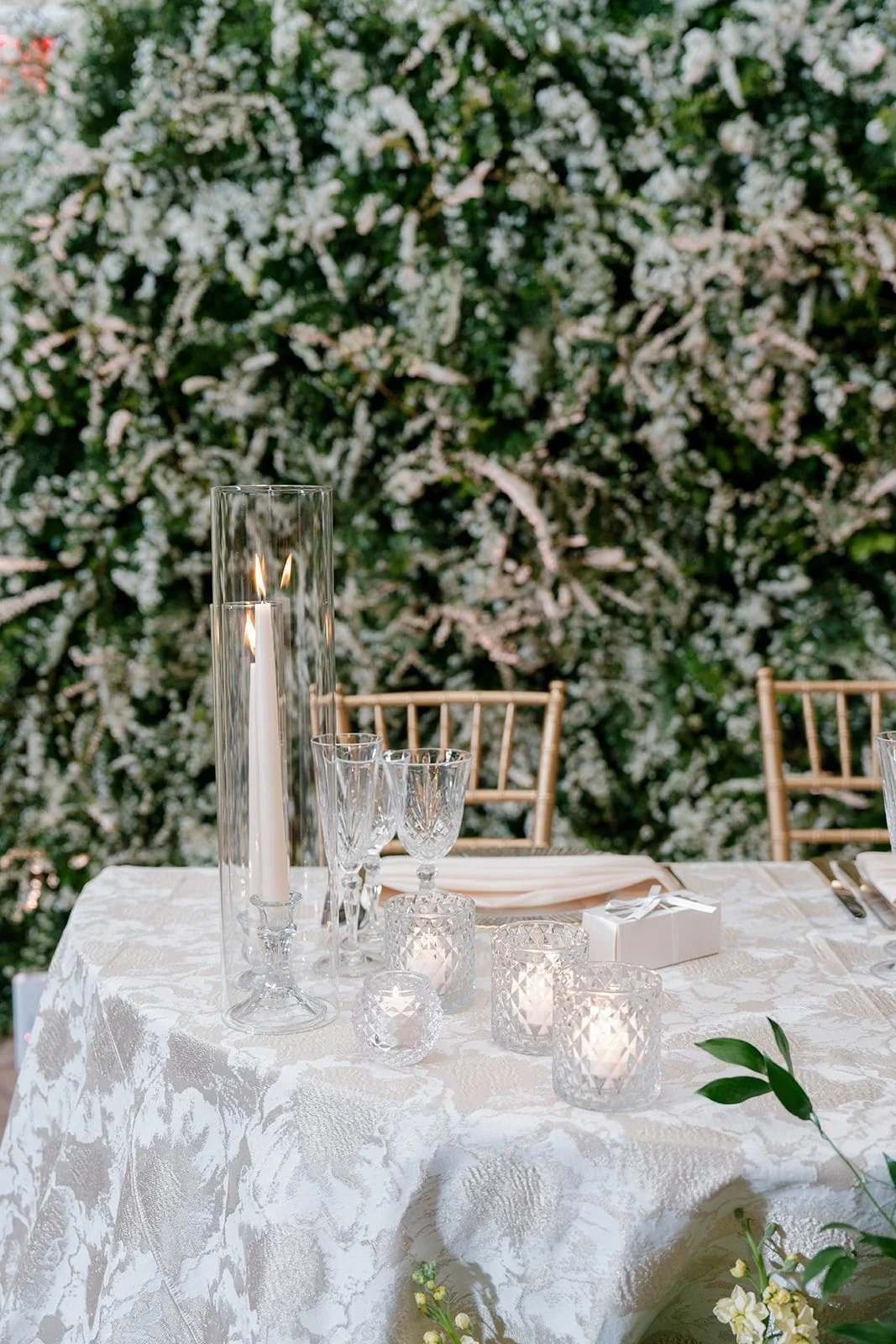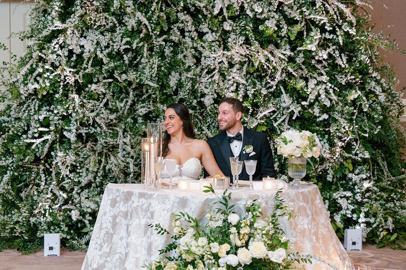 Suzy and Marios’ spectacular soiree was highlighted by the massive spirea wall that perfectly framed the couple at their sweetheart table. Two different varieties of spirea were used to achieve the lush look. Planning by Havard Events & Design and photography by Klaire Dixius Photography.