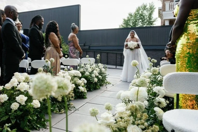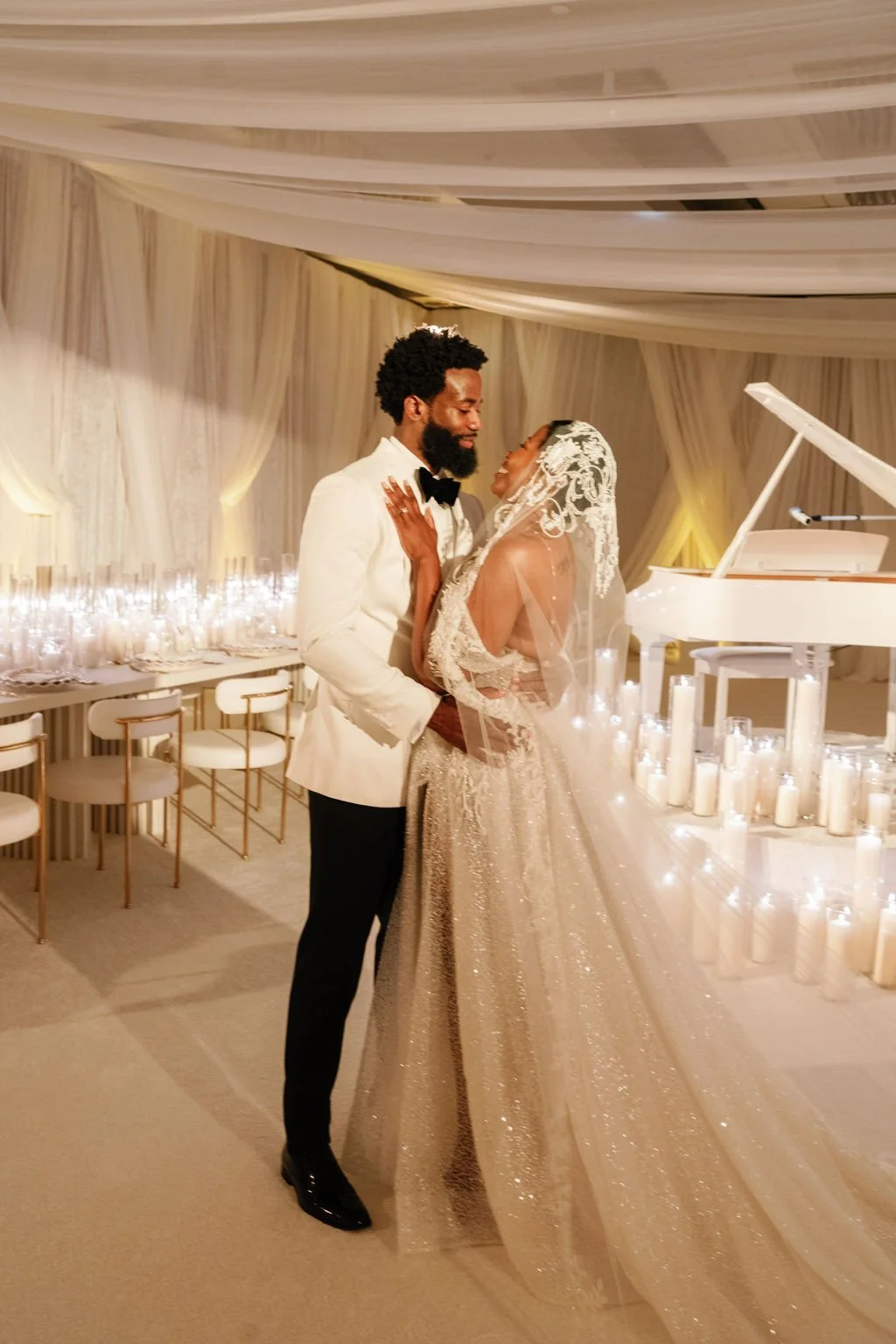 Tiffany + Dakari’s wedding exuded elegance with a stunning broken arch and lush floral “aisle” gardens. The venue was transformed into a romantic haven illuminated by hundreds of glowing candles, creating an intimate and magical ambiance. Planning by B Astonished Events and photography by Abby Jiu.