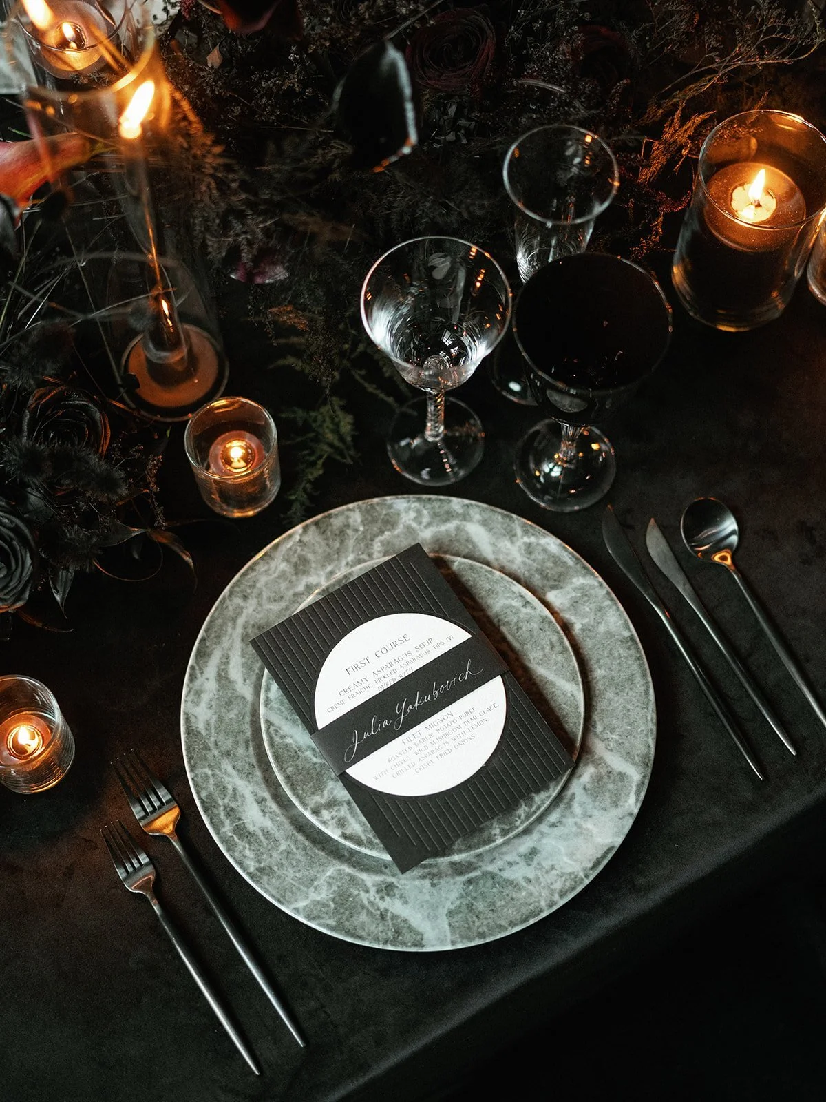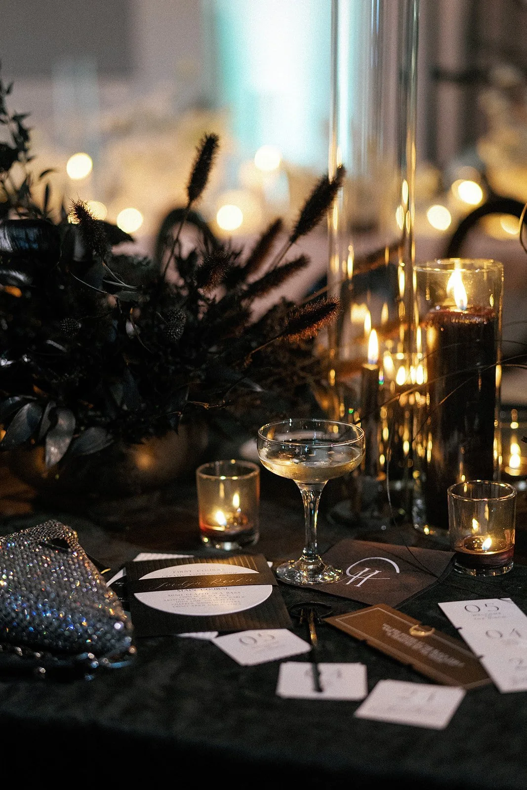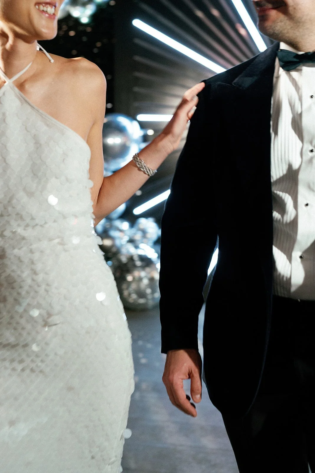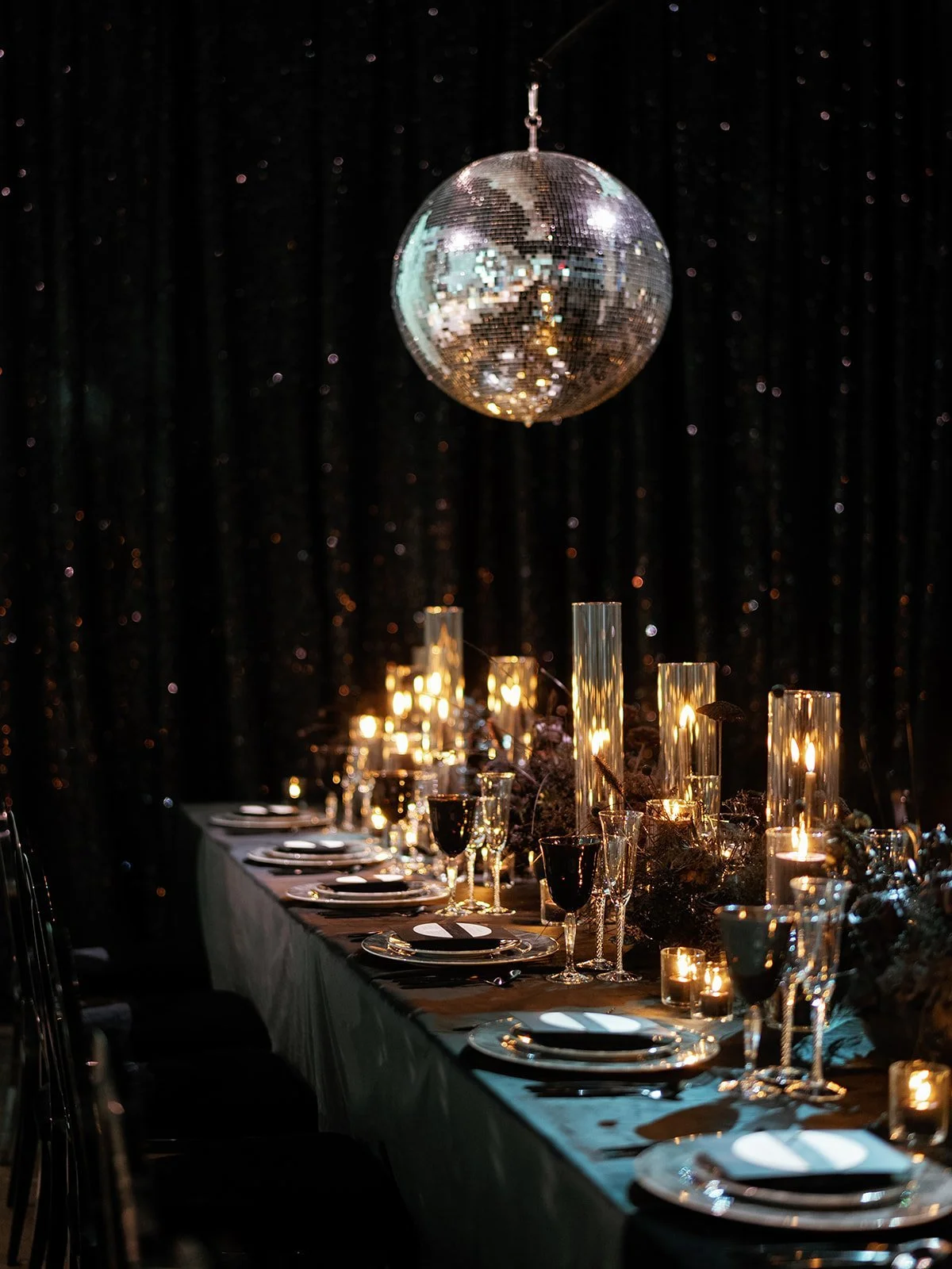 Christina + Max’s wedding showcased a glamorous and sophisticated vibe, highlighted by sleek disco balls and a mix of light and dark elements, creating an atmosphere of celebration for their dinner and discotheque. Planning by Grit & Grace and photography by Nikki Daskalakis.
