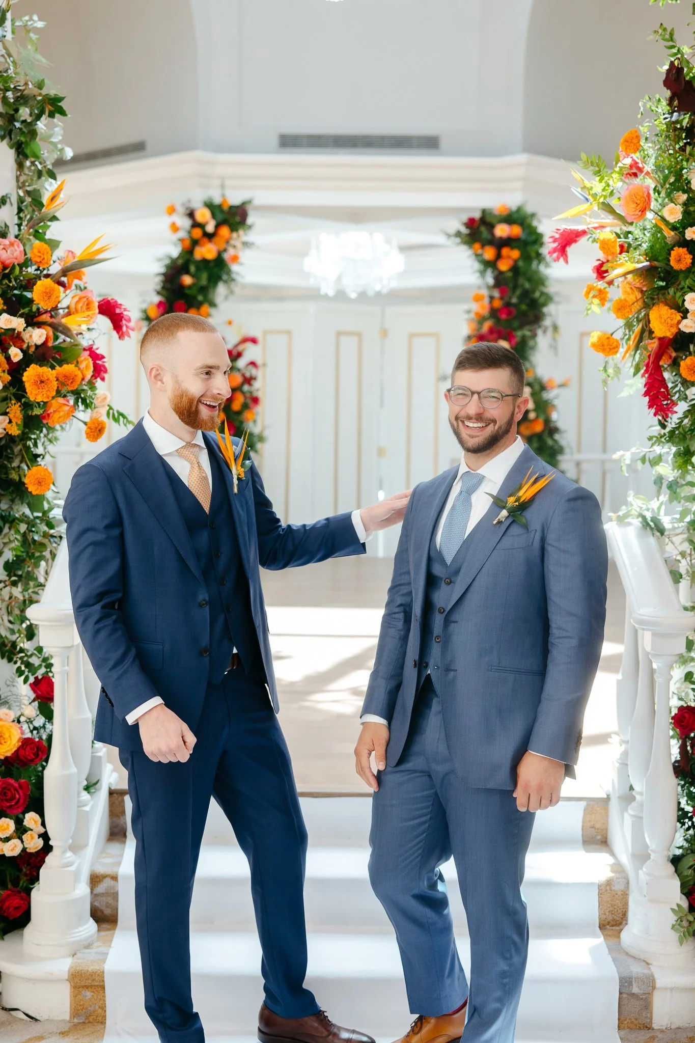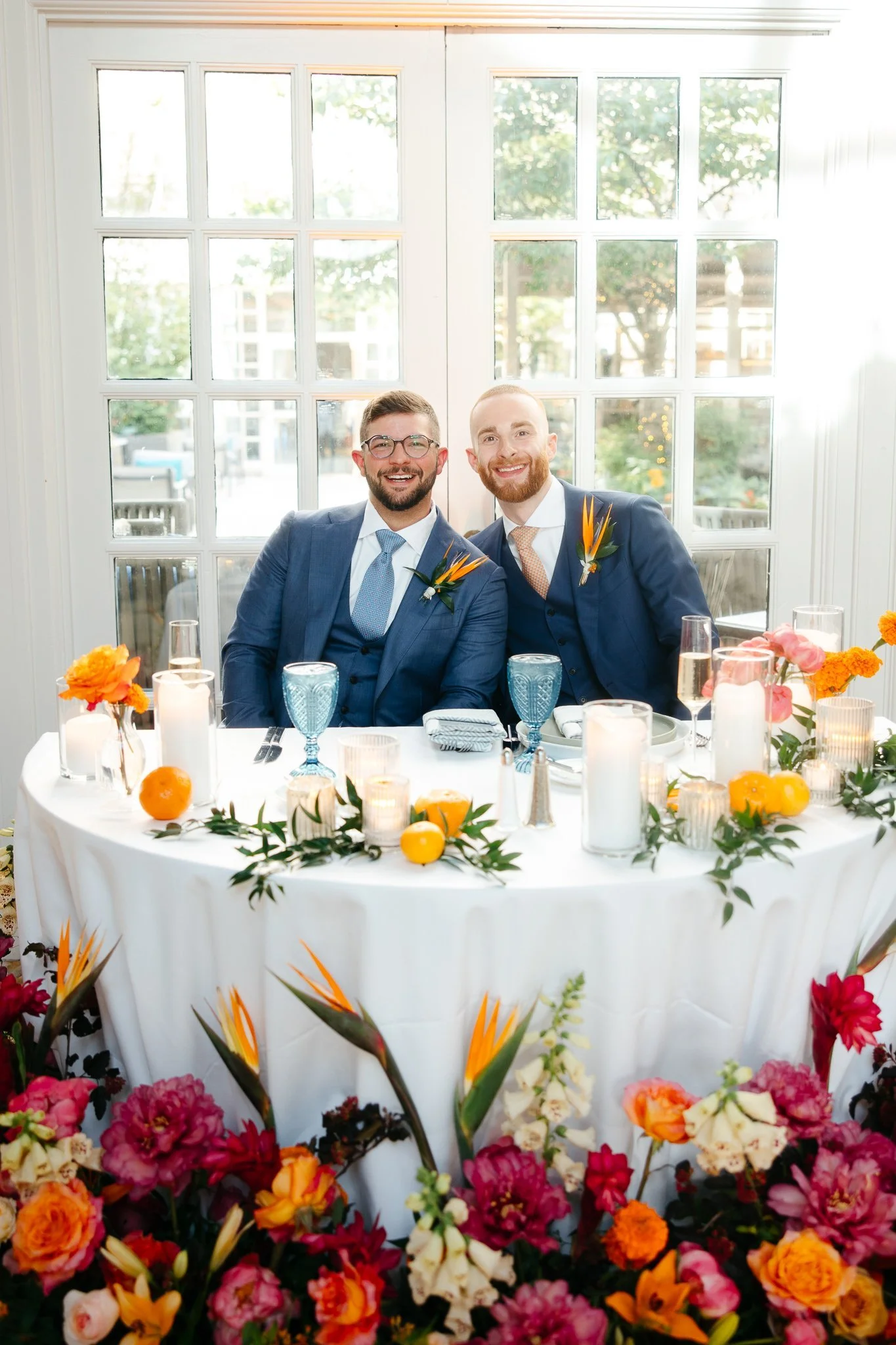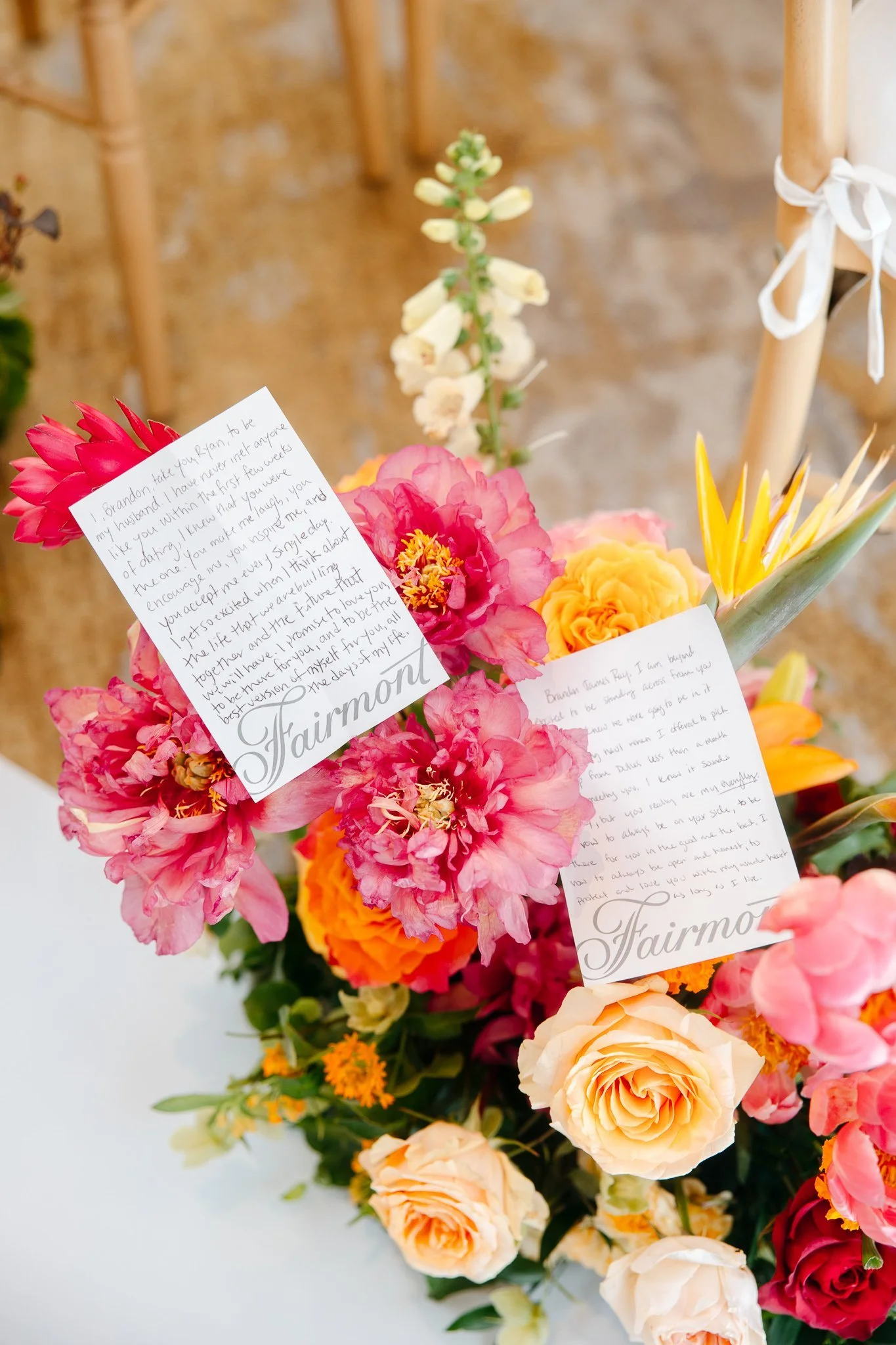 Ryan + Brandon's wedding at the Fairmont was a vibrant celebration filled with colorful blooms in shades of orange, pink, and yellow, creating a joyful and lively atmosphere. Planning by A Griffin Events and photography by Justin Kunimoto.