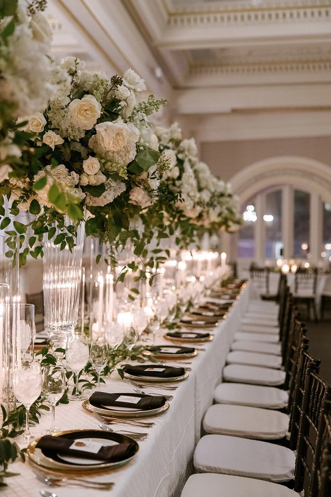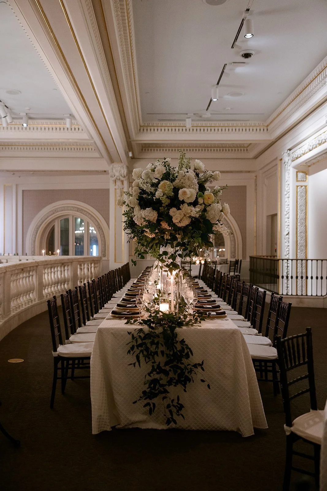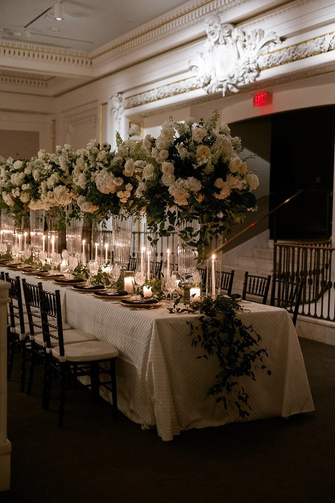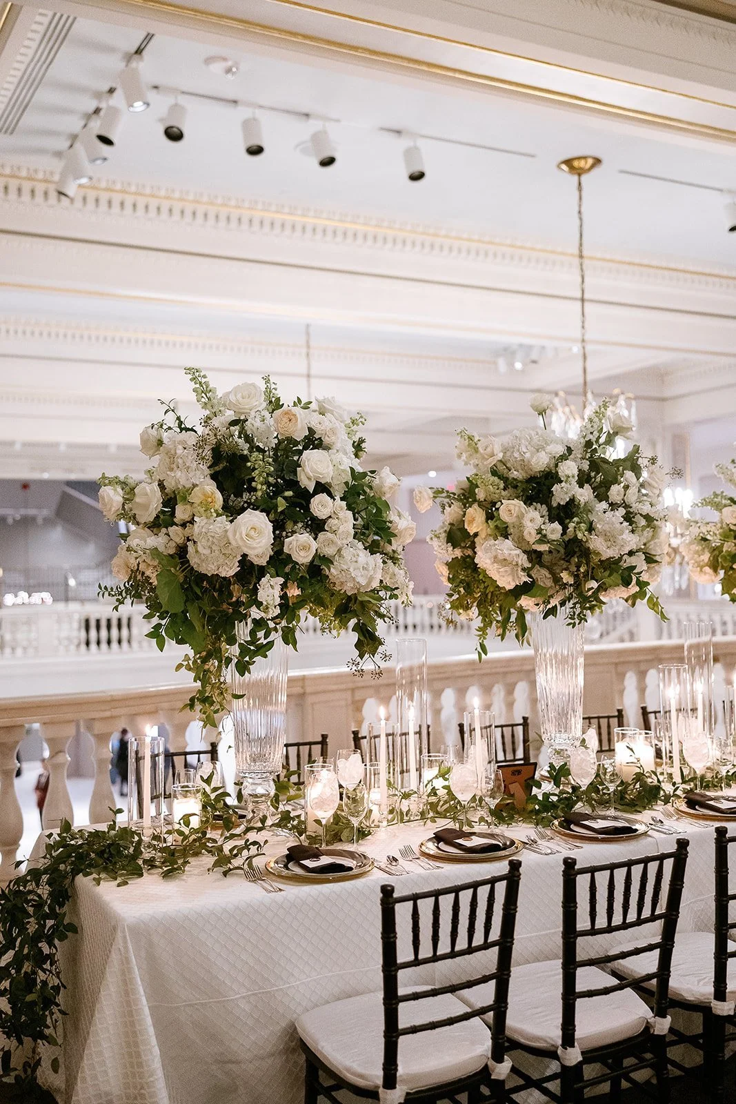 Allison and Dhruv’s chic wedding at the National Museum of Women in the Arts stunned with crisp whites florals dotted with textural sweet peas, unique anenomes, and fluffy ranunculus. The showstopper of the night was the lush head table filled with raised arrangements in crystal vases, dripping with whimsical greenery. Planning by Rex & Regina Events and photography by Sarah Bradshaw Photography.