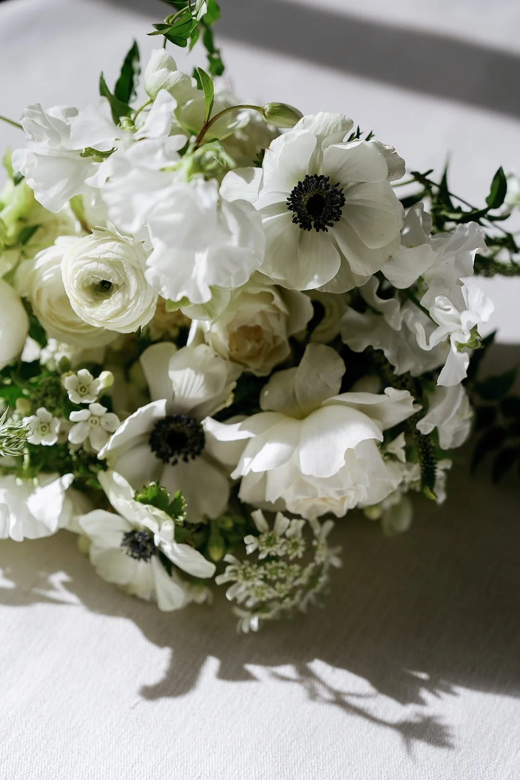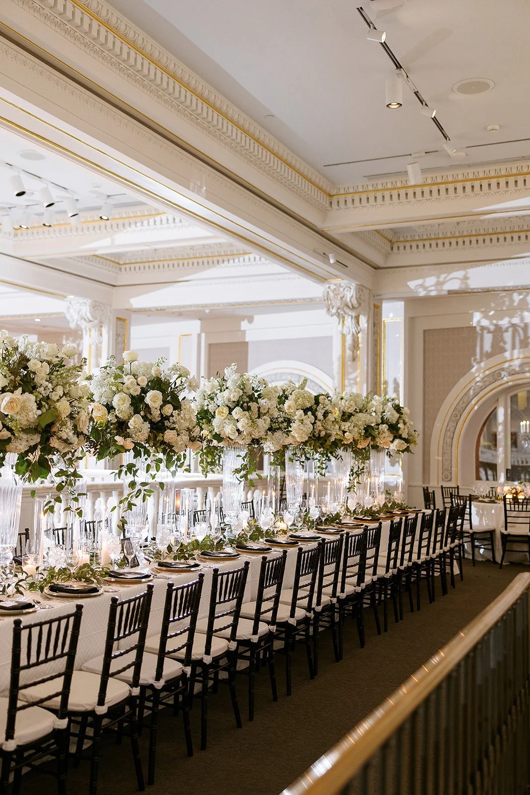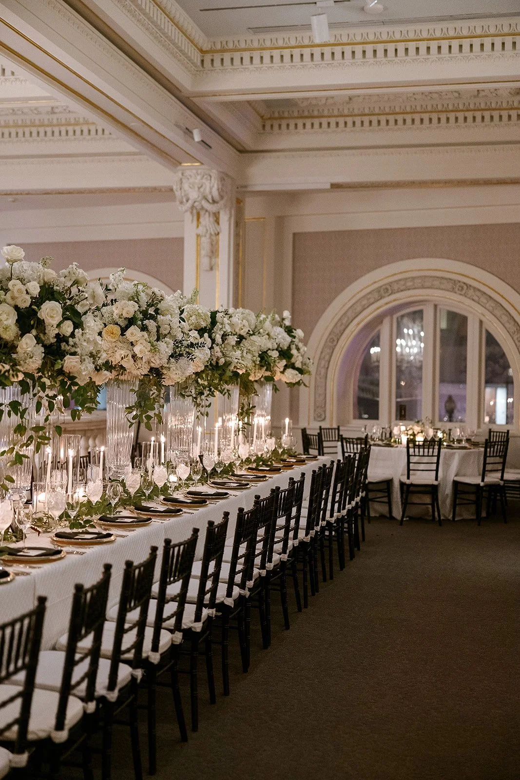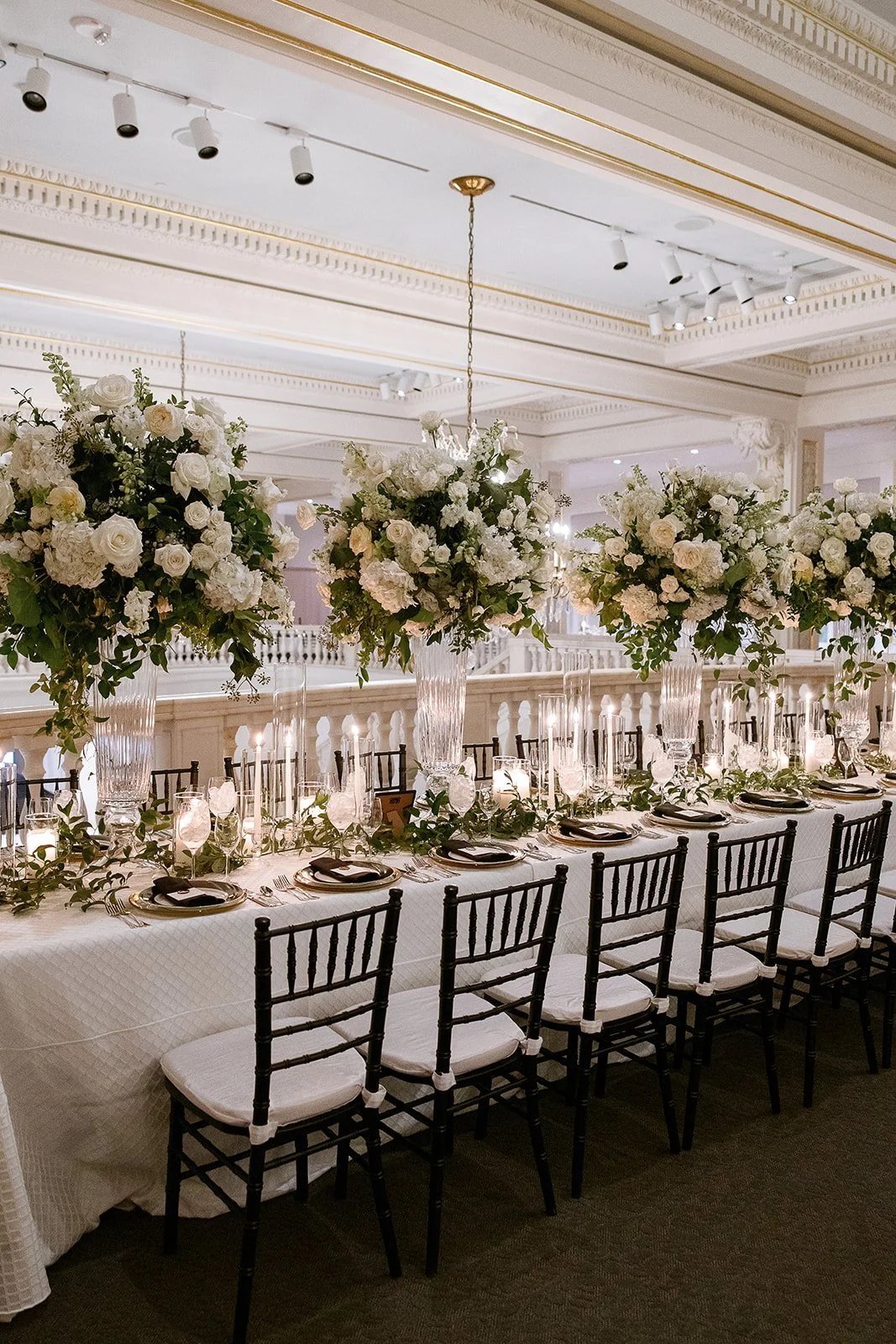 Allison and Dhruv’s chic wedding at the National Museum of Women in the Arts stunned with crisp whites florals dotted with textural sweet peas, unique anenomes, and fluffy ranunculus. The showstopper of the night was the lush head table filled with raised arrangements in crystal vases, dripping with whimsical greenery. Planning by Rex & Regina Events and photography by Sarah Bradshaw Photography.