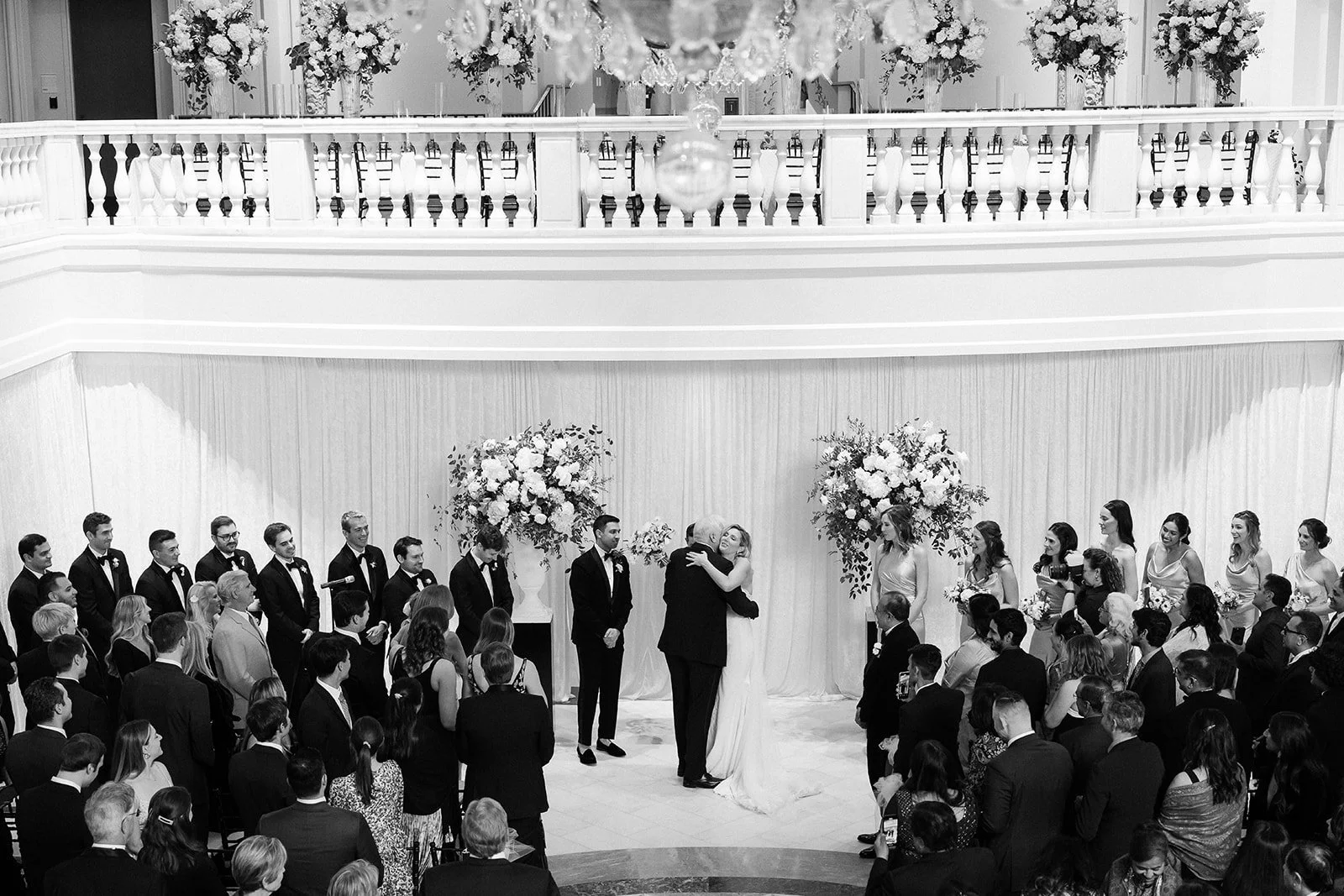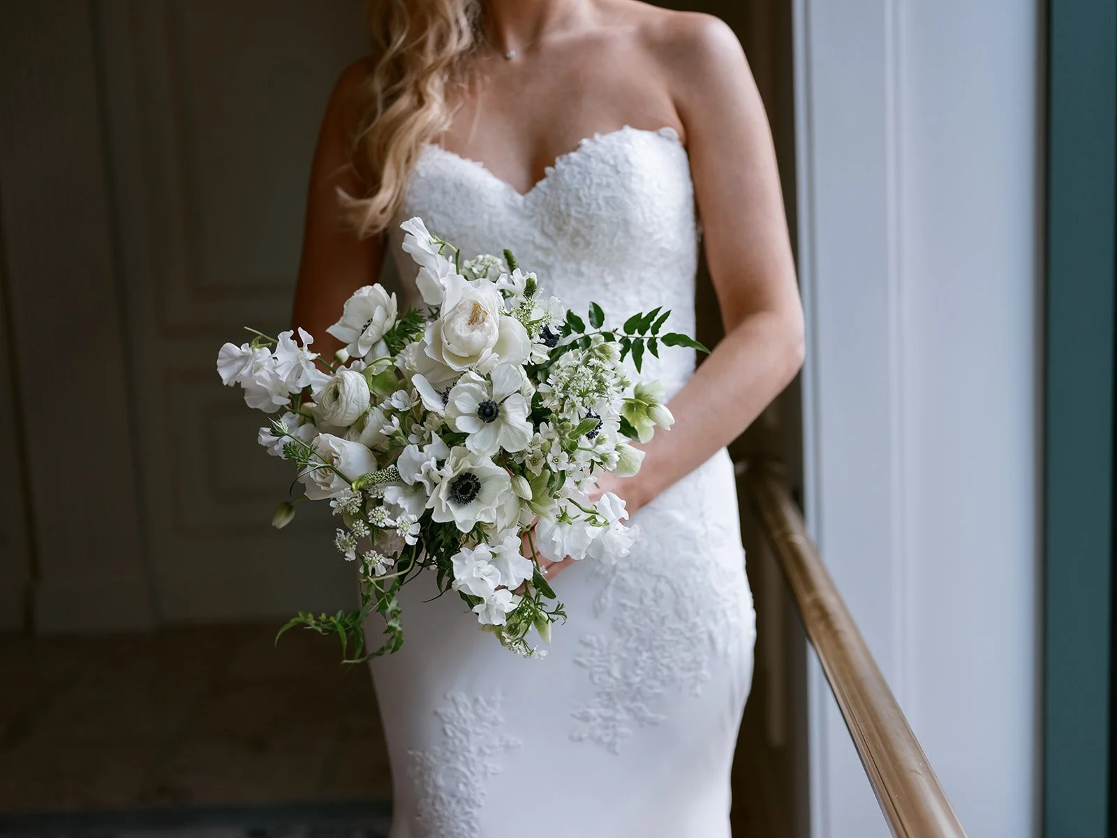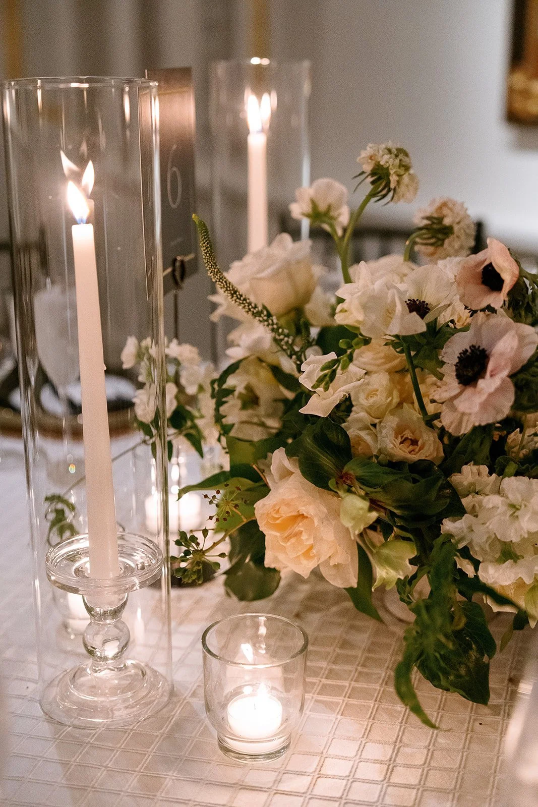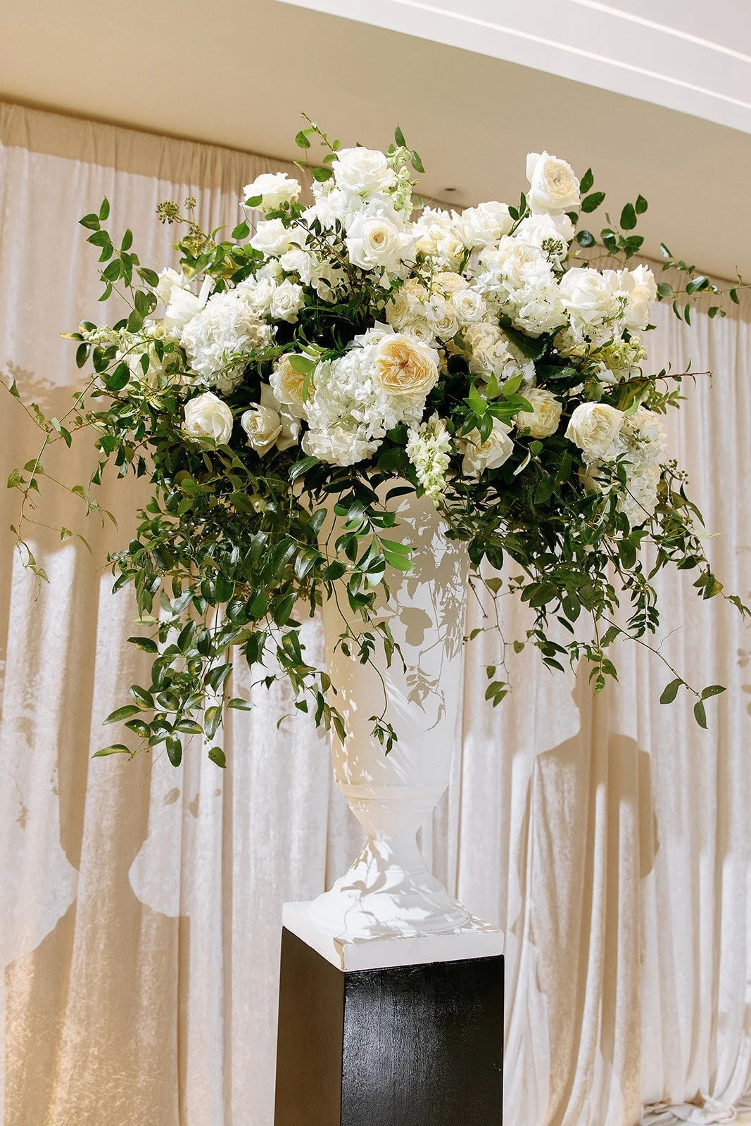 Allison and Dhruv’s chic wedding at the National Museum of Women in the Arts stunned with crisp whites florals dotted with textural sweet peas, unique anenomes, and fluffy ranunculus. The showstopper of the night was the lush head table filled with raised arrangements in crystal vases, dripping with whimsical greenery. Planning by Rex & Regina Events and photography by Sarah Bradshaw Photography.