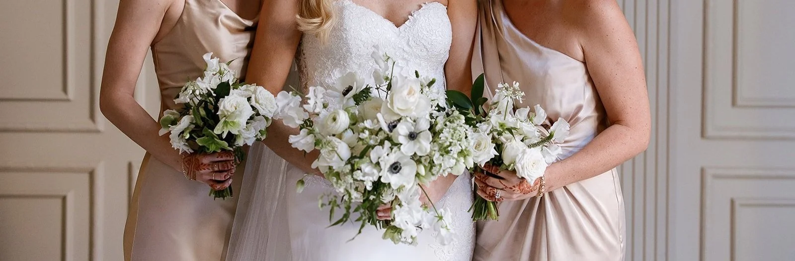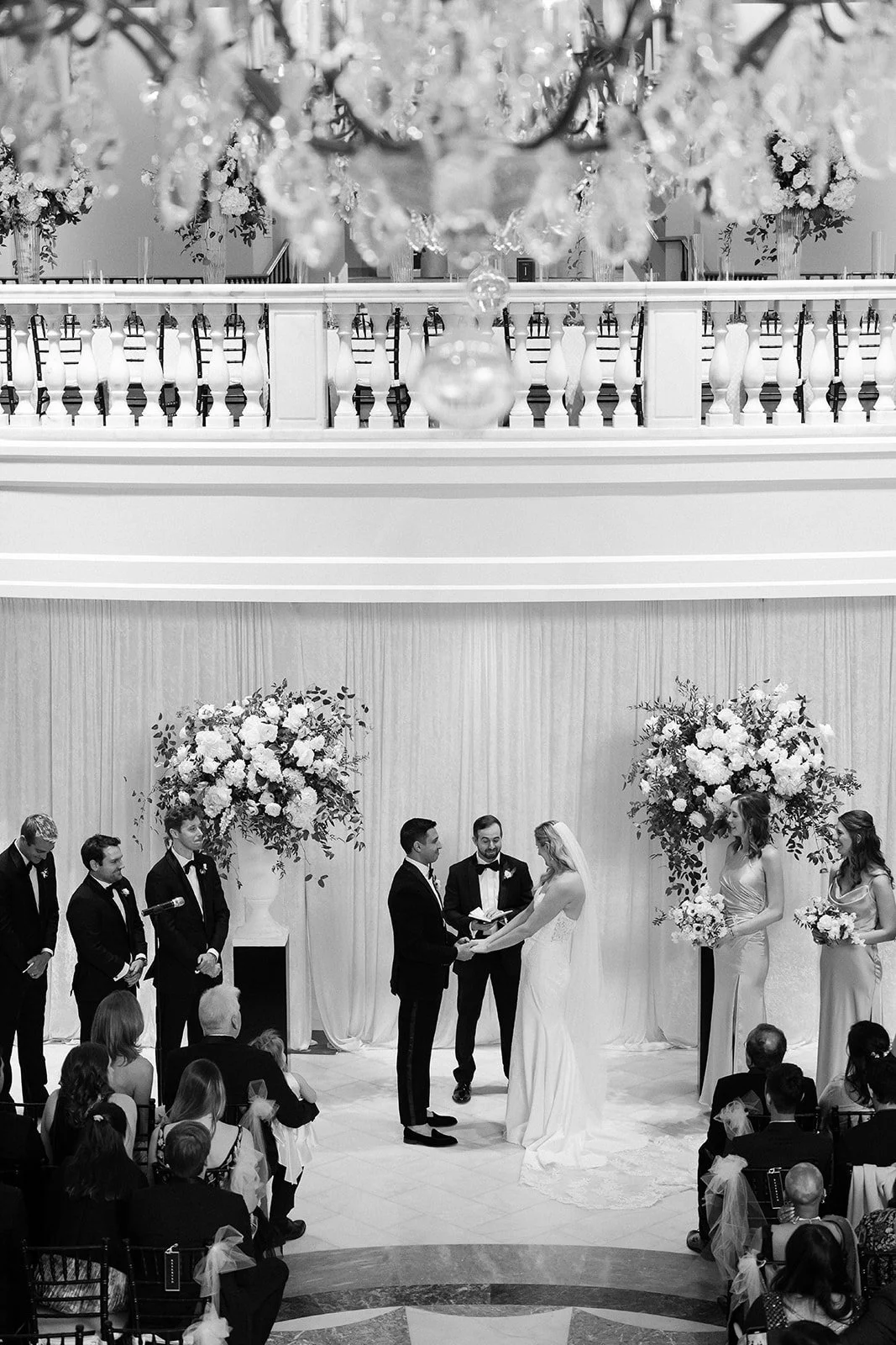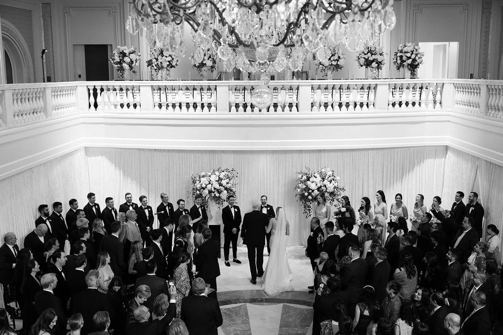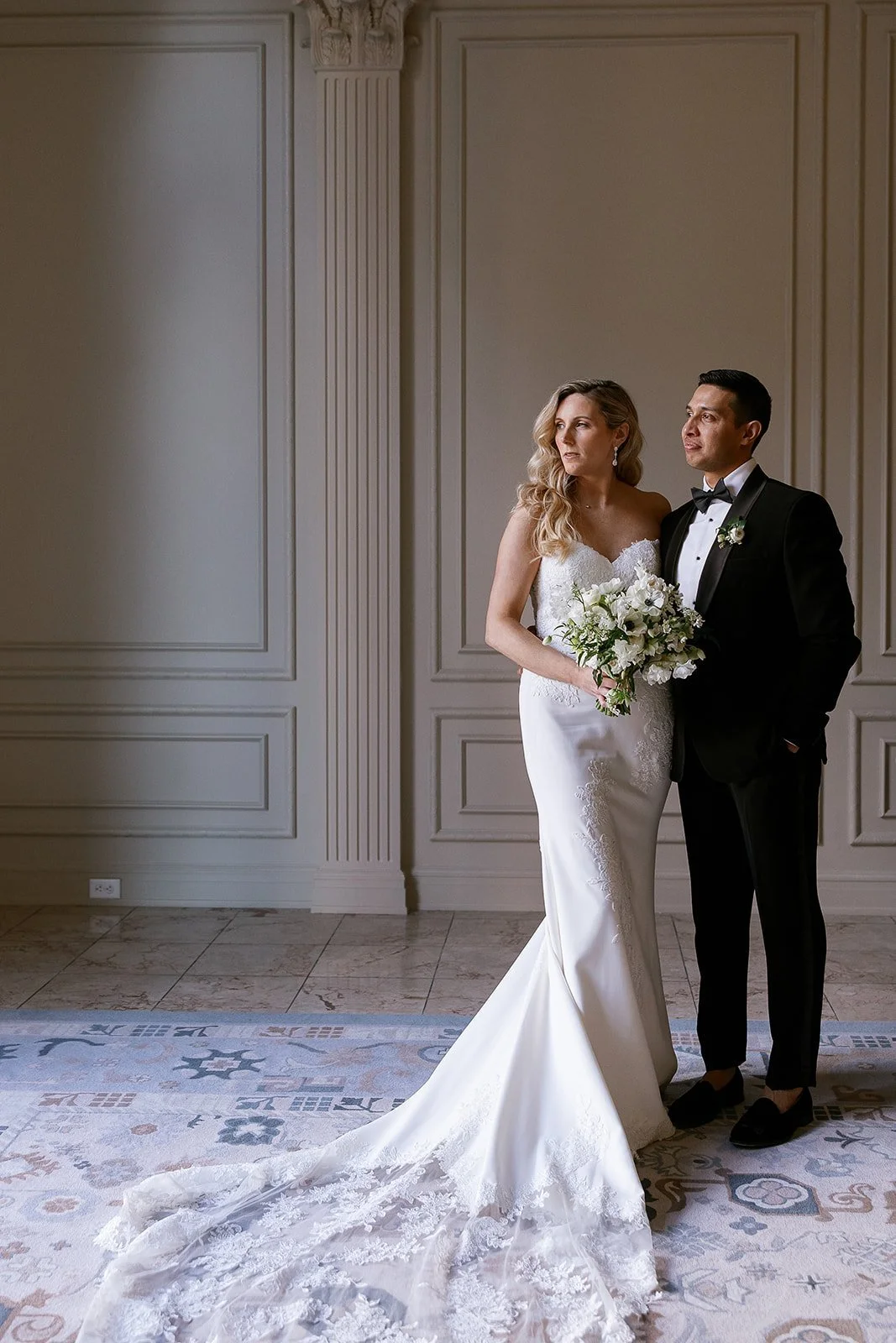 Allison and Dhruv’s chic wedding at the National Museum of Women in the Arts stunned with crisp whites florals dotted with textural sweet peas, unique anenomes, and fluffy ranunculus. The showstopper of the night was the lush head table filled with raised arrangements in crystal vases, dripping with whimsical greenery. Planning by Rex & Regina Events and photography by Sarah Bradshaw Photography.