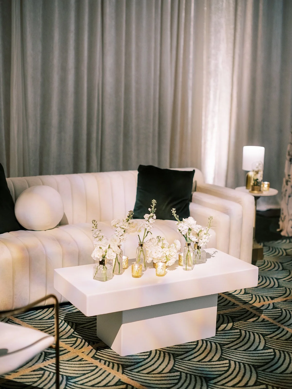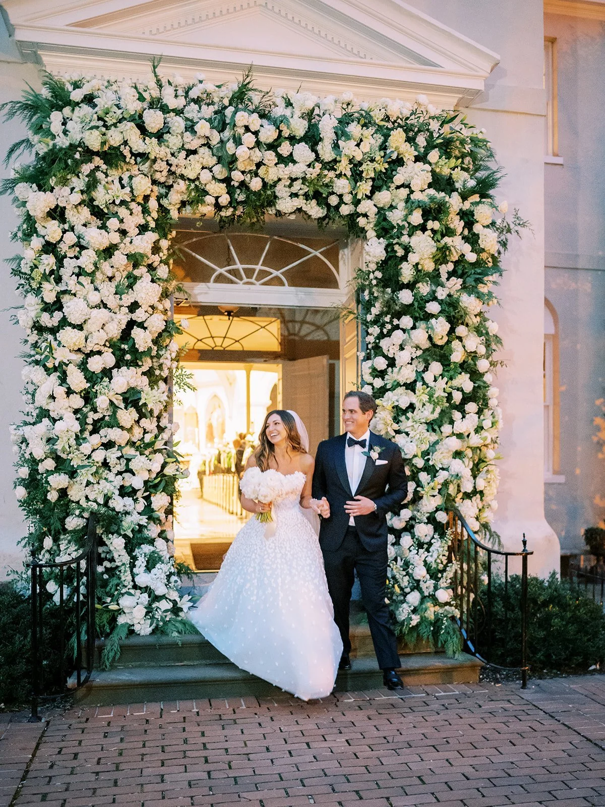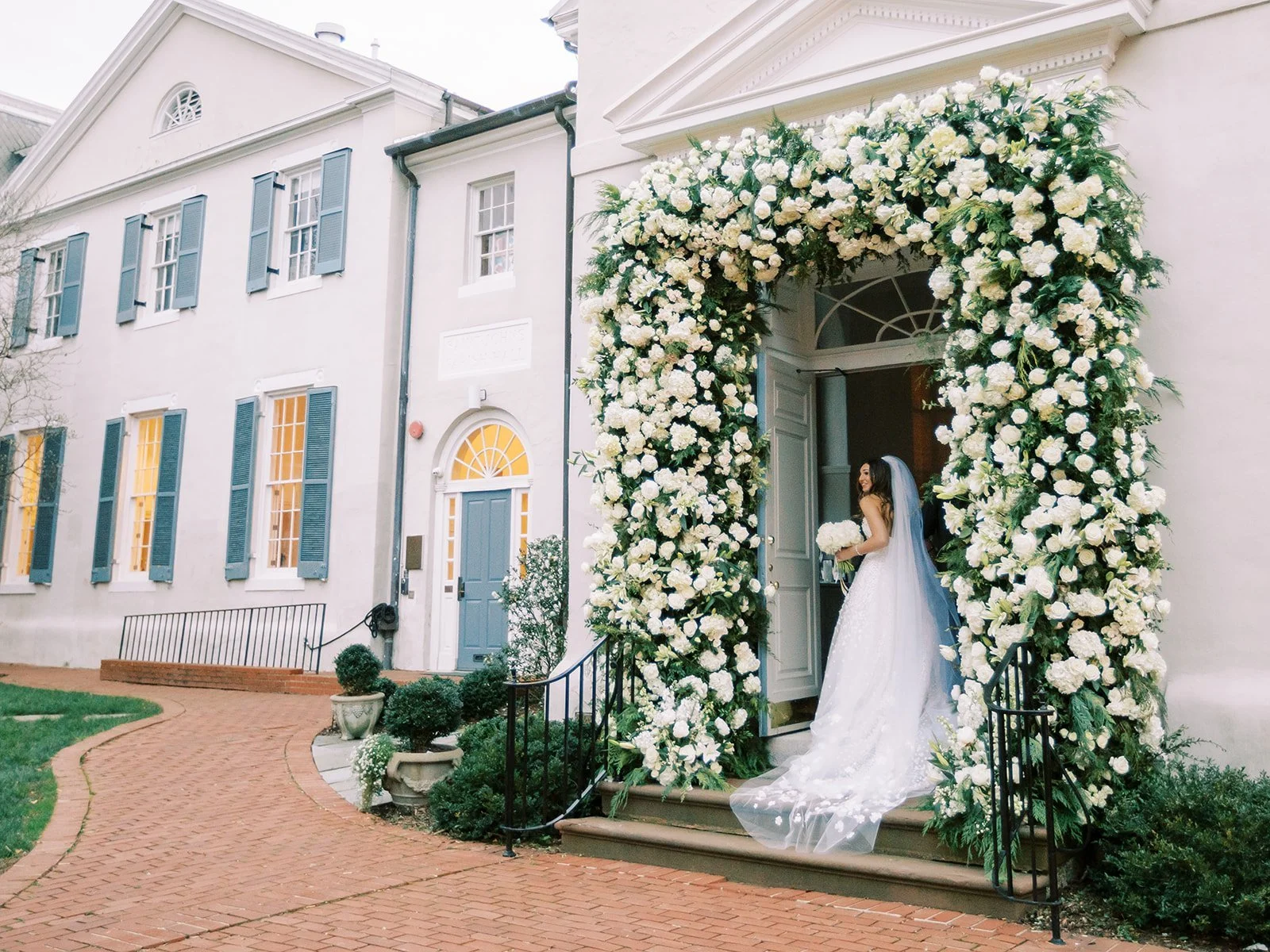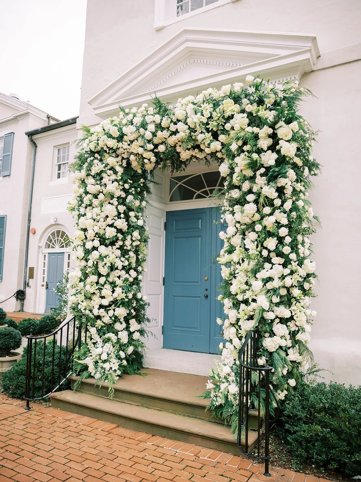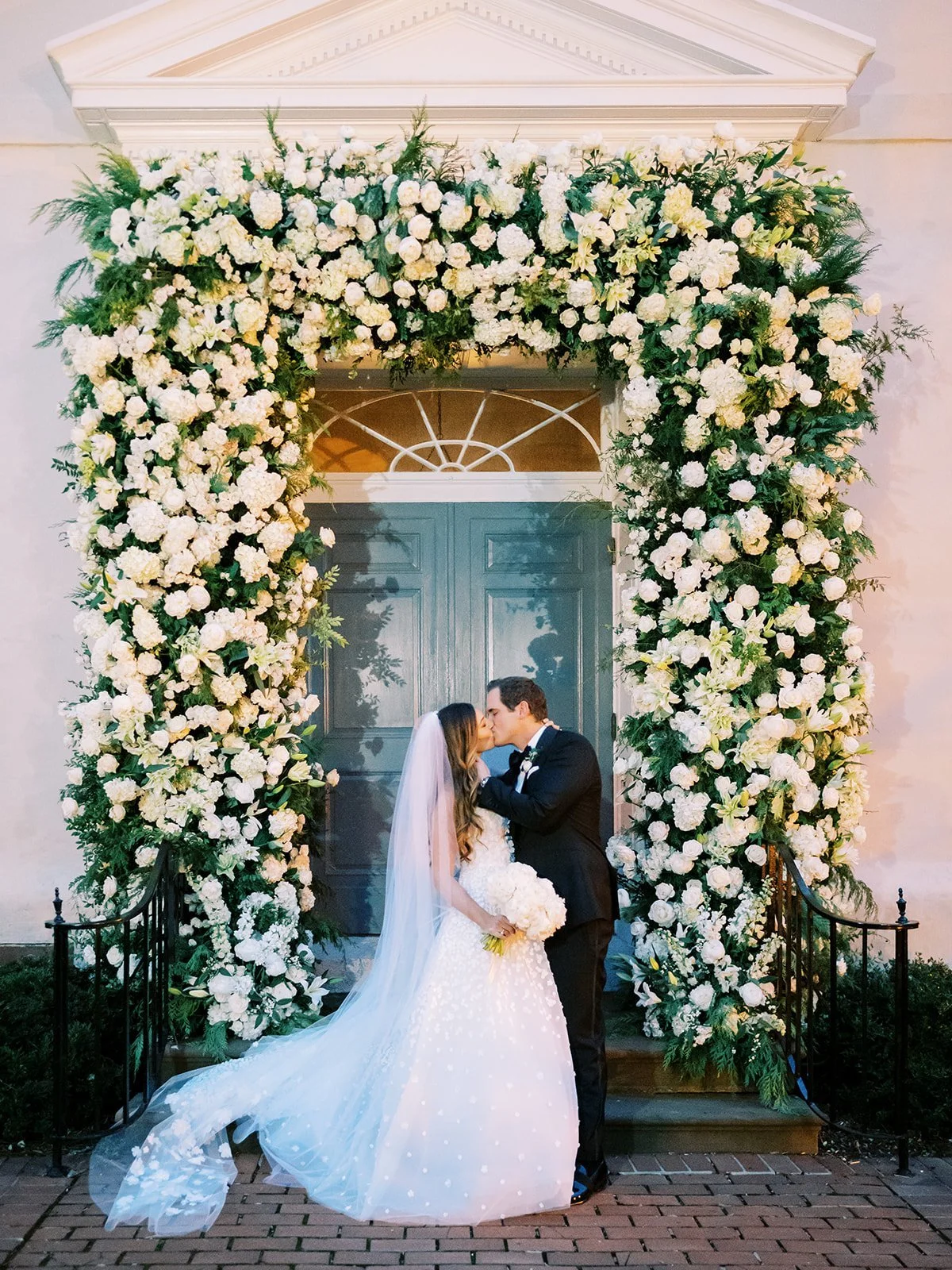 Emilie and Martin’s winter wonderland wedding took place on a chilly yet bright December day. Their day started with a lush arch framing the doorway at St. John’s Episcopal Church in Georgetown, filled with bright white roses, hydrangeas and fluffy winter greenery. Their reception at the Ronald Reagan building was impressive yet chic. We loved curating the perfect collection of pine trees with twinkling lights for the top of the stairs. Planning by Pamela Barefoot Events + Design and photography by Perry Vaile Photography.