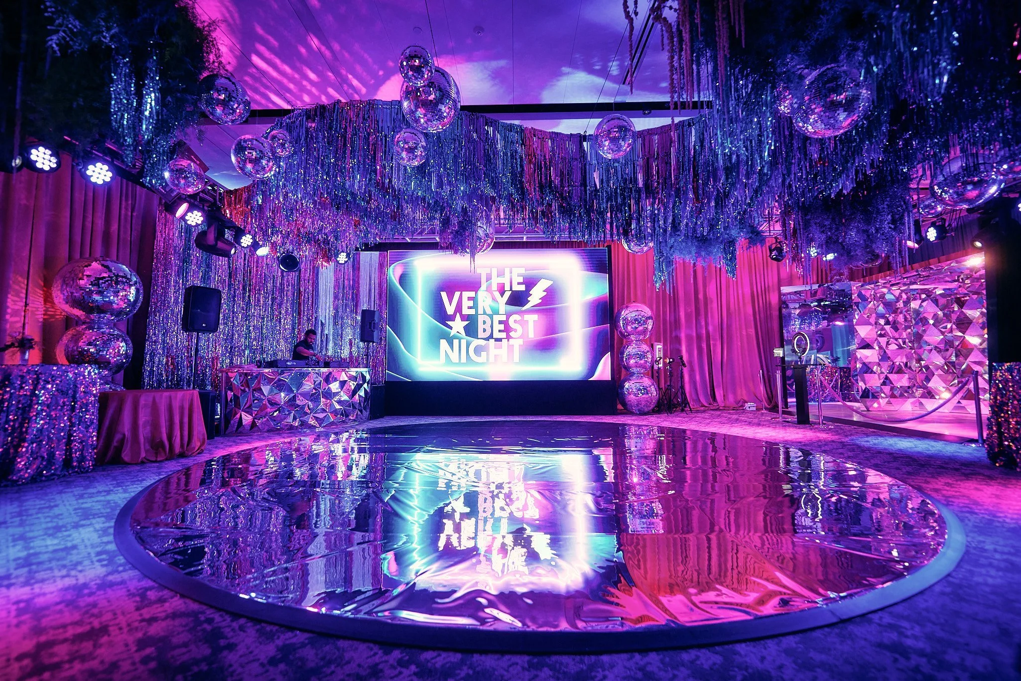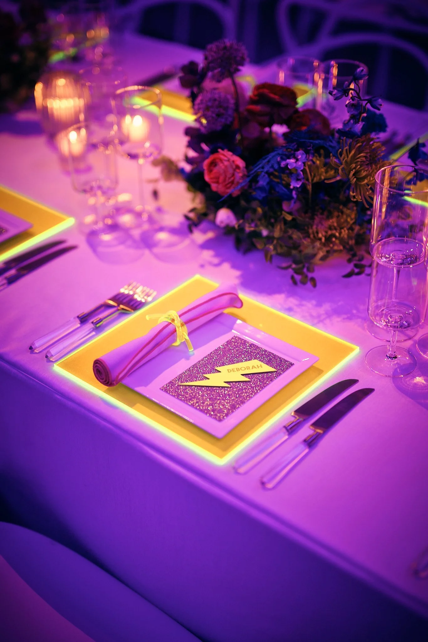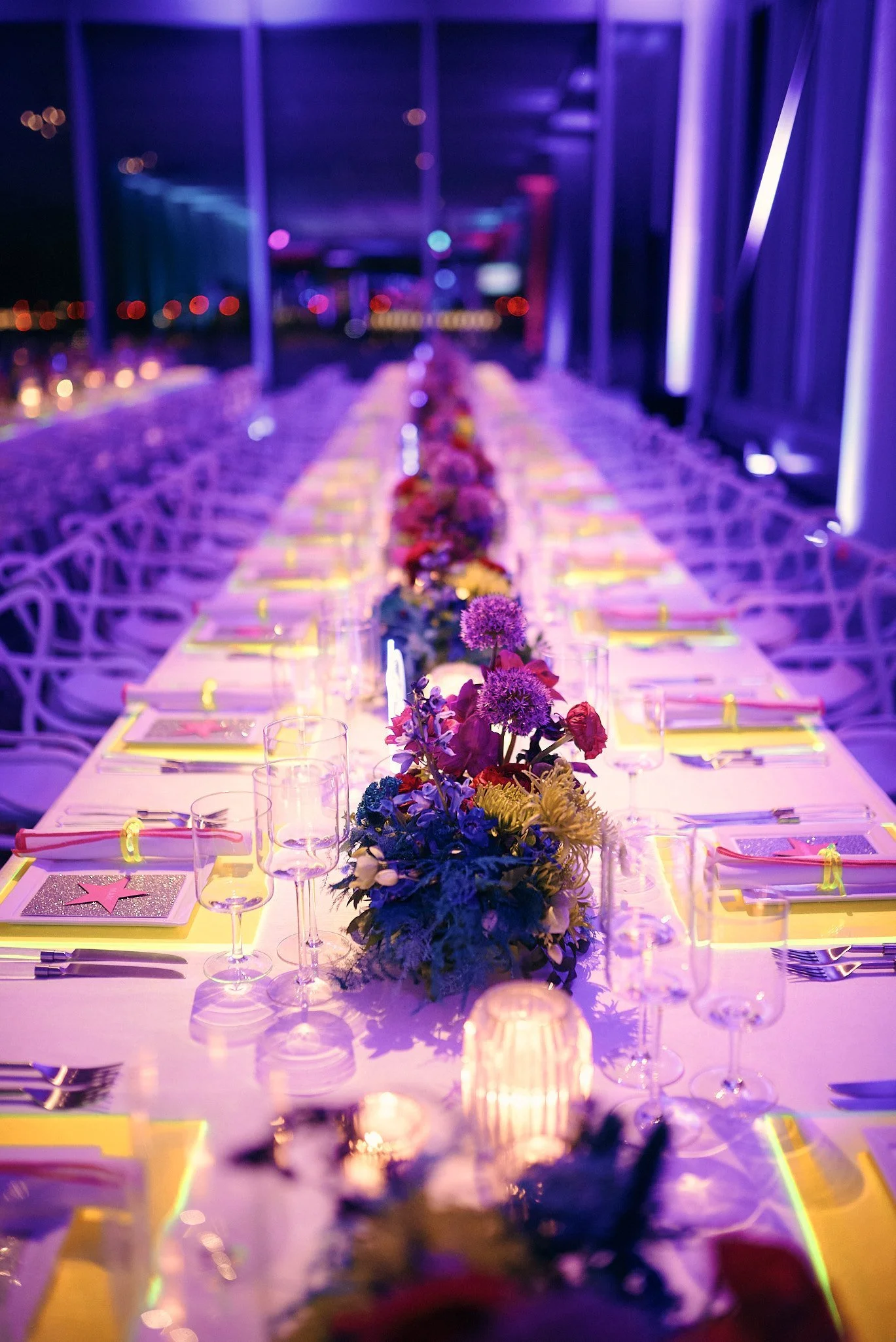 This colorful Bat Mitzvah at the International Spy Museum exuded a vibrant and futuristic vibe, with pops of hot pink, purple and aqua throughout the venue. The ceiling install transformed the dance floor, adding a mesmerizing touch to the celebration. Planning by Magnolia Bluebird and photography by Eli Turner Studios.