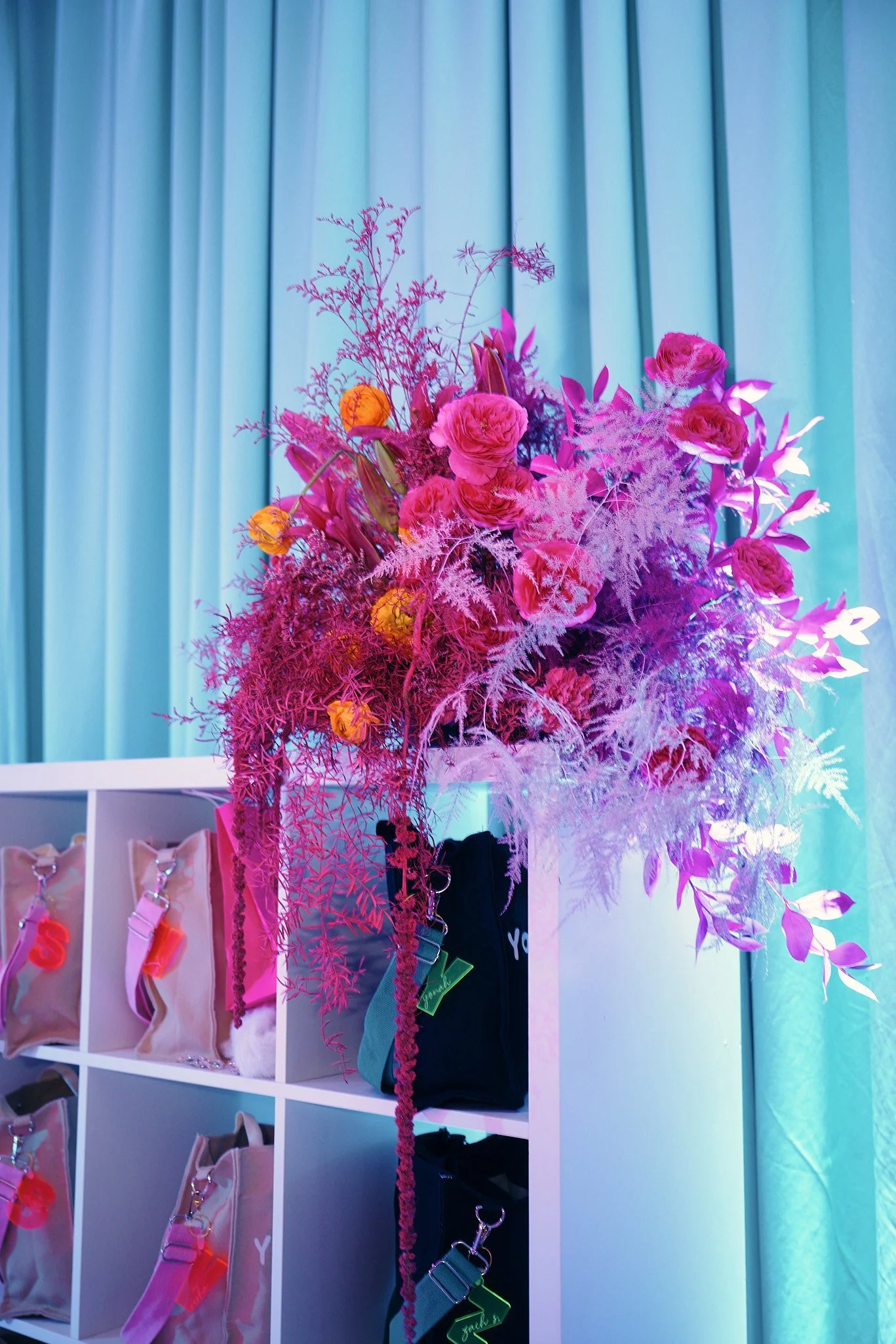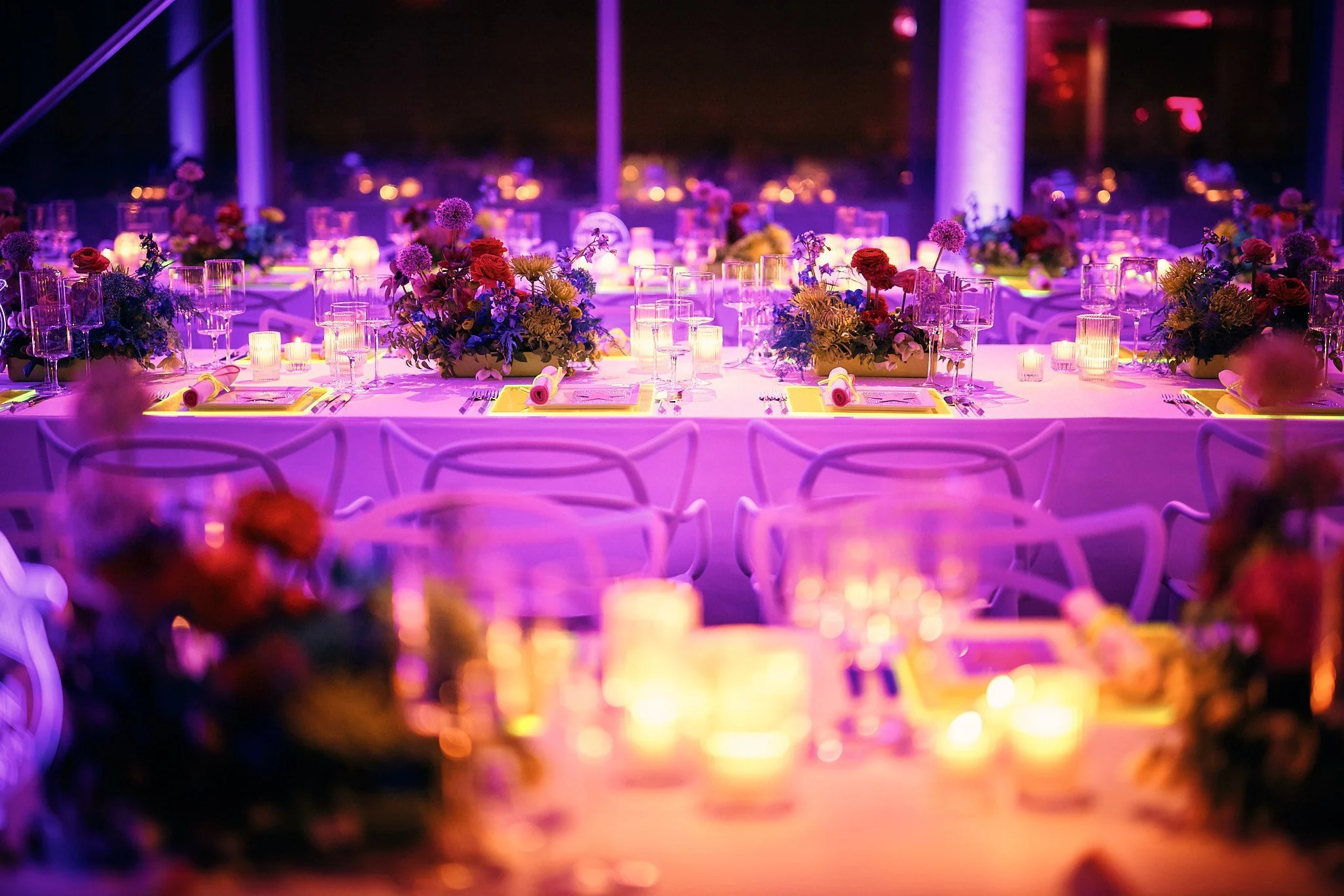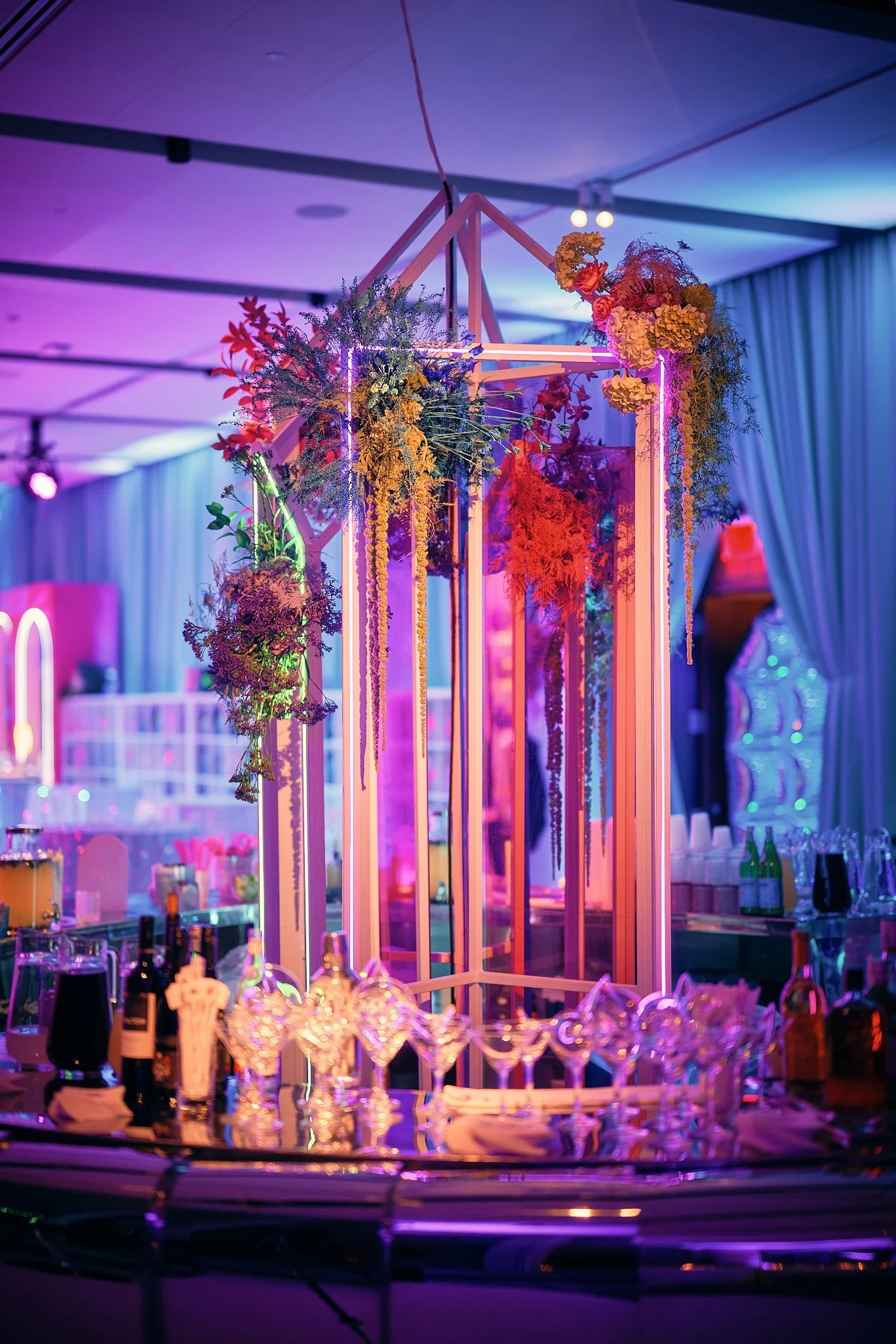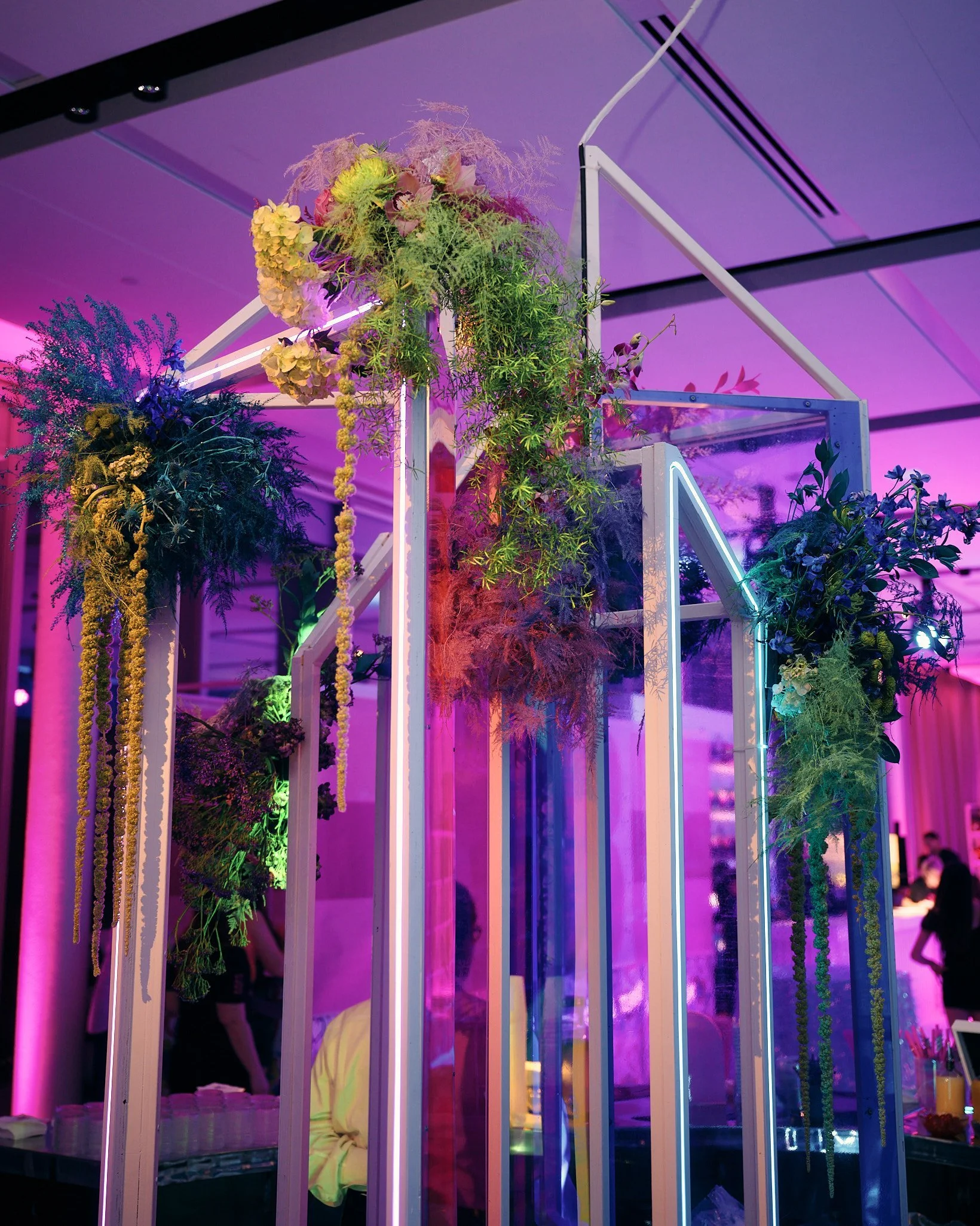This colorful Bat Mitzvah at the International Spy Museum exuded a vibrant and futuristic vibe, with pops of hot pink, purple and aqua throughout the venue. The ceiling install transformed the dance floor, adding a mesmerizing touch to the celebration. Planning by Magnolia Bluebird and photography by Eli Turner Studios.