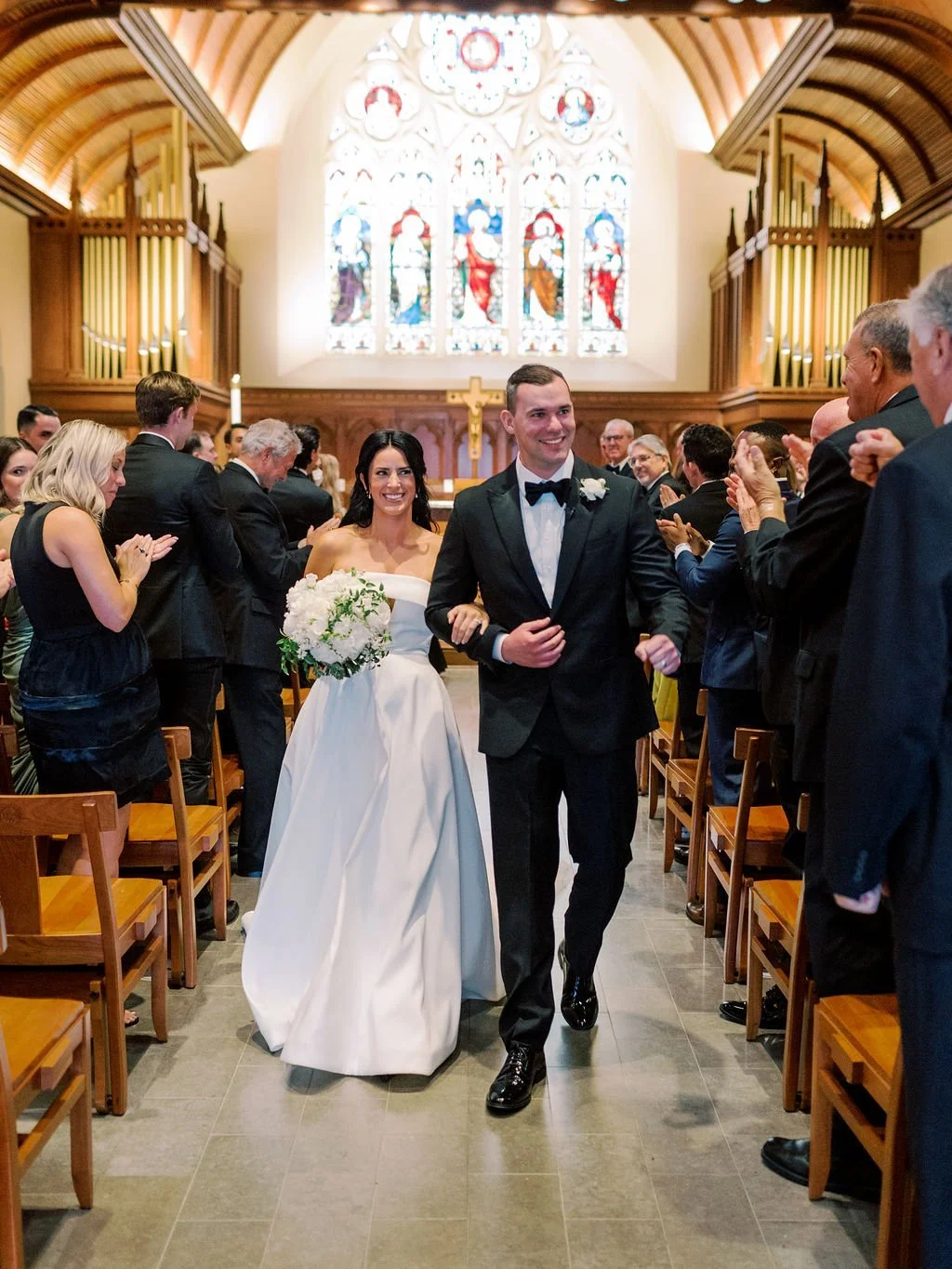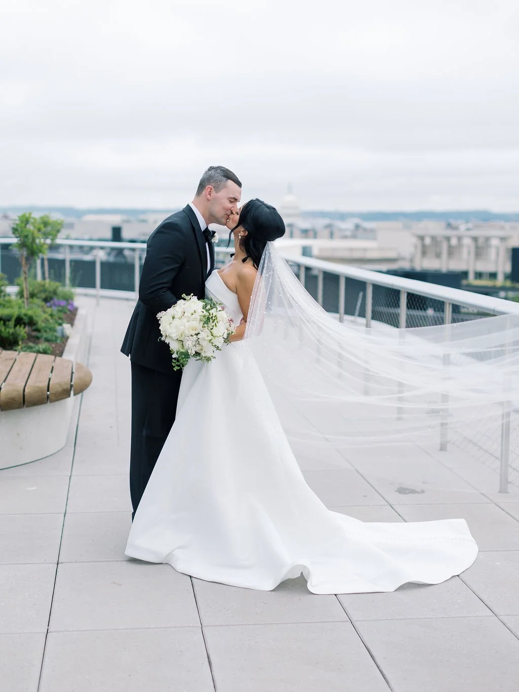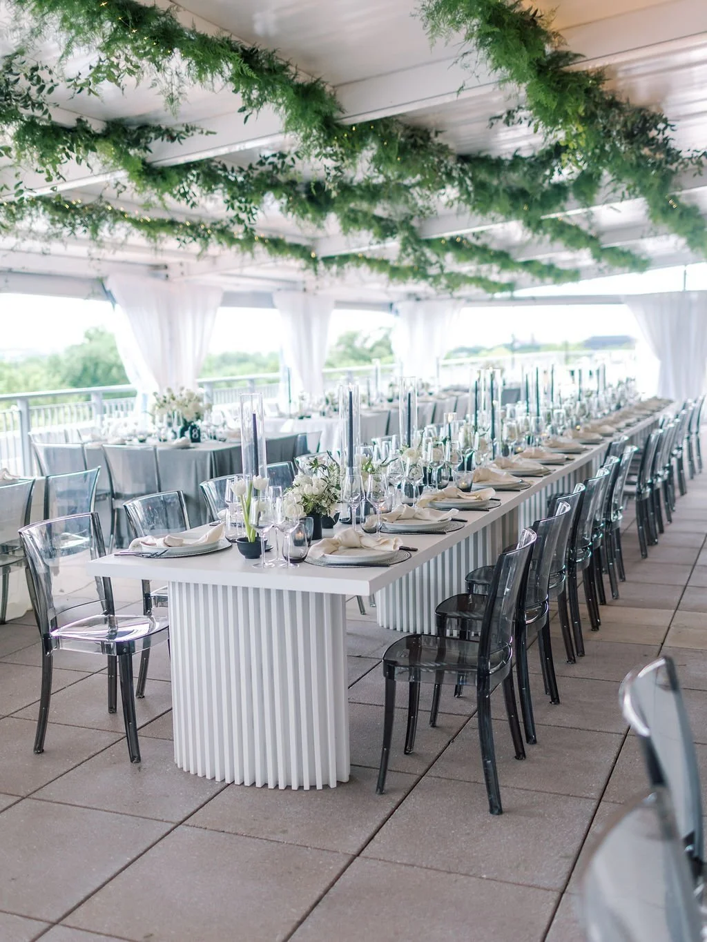Juli and Brian’s special day started with a beautiful ceremony at Dahlgreen Chapel, followed by an elegant and modern reception at Potomac View Terrace. They celebrated with their friends and family with a breathtaking view overlooking the city highlighted by the greenery-filled ceiling dappled with fairy lights and chic centerpieces. Planning by Simply Chic Events and photography by Kir Tuben Photography.