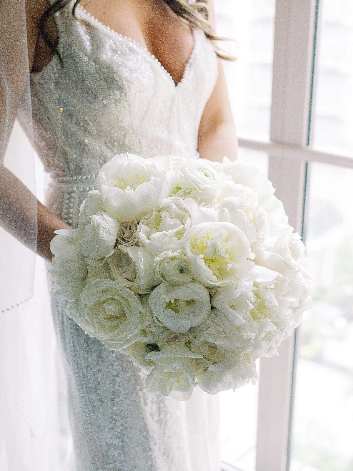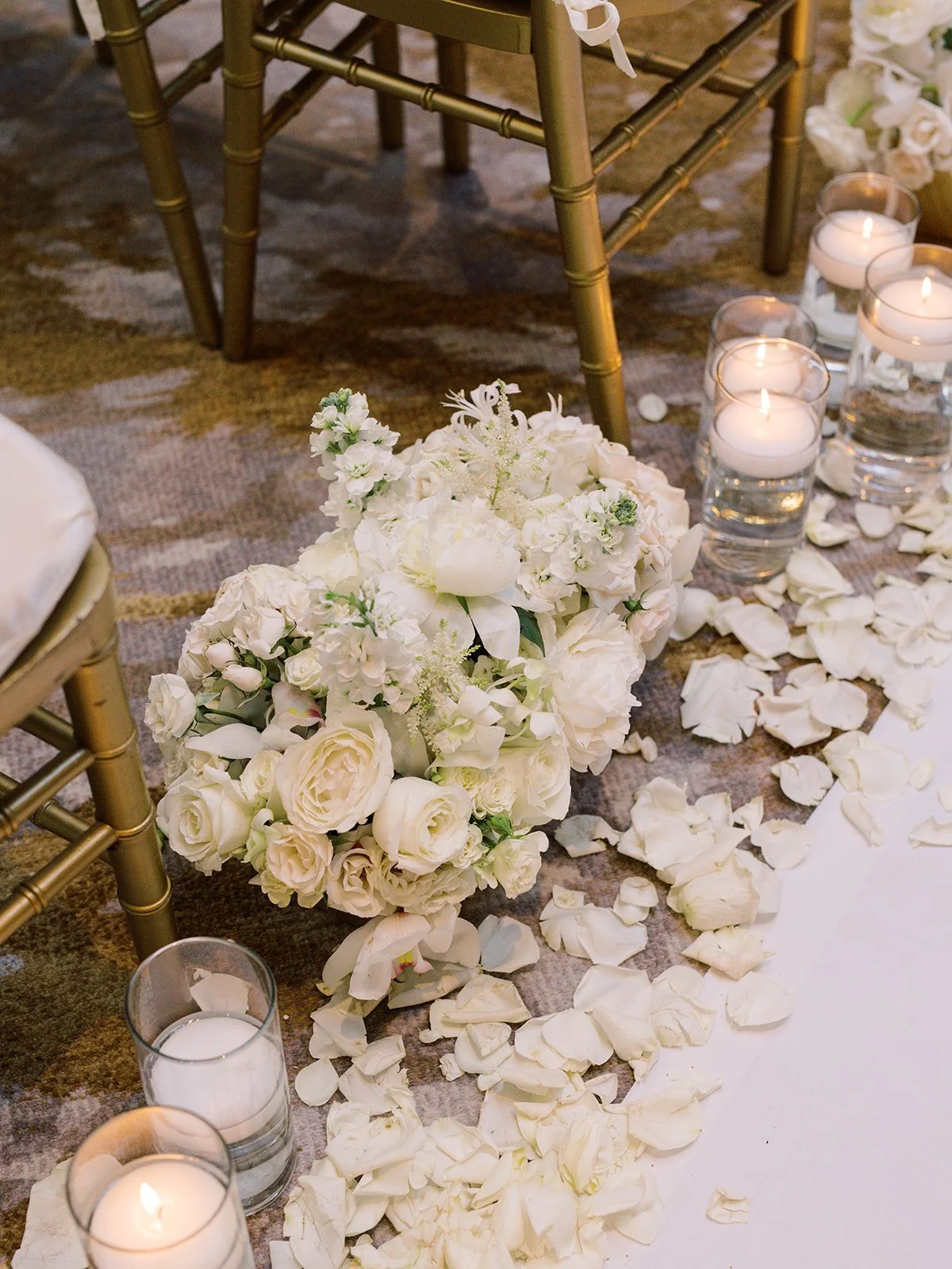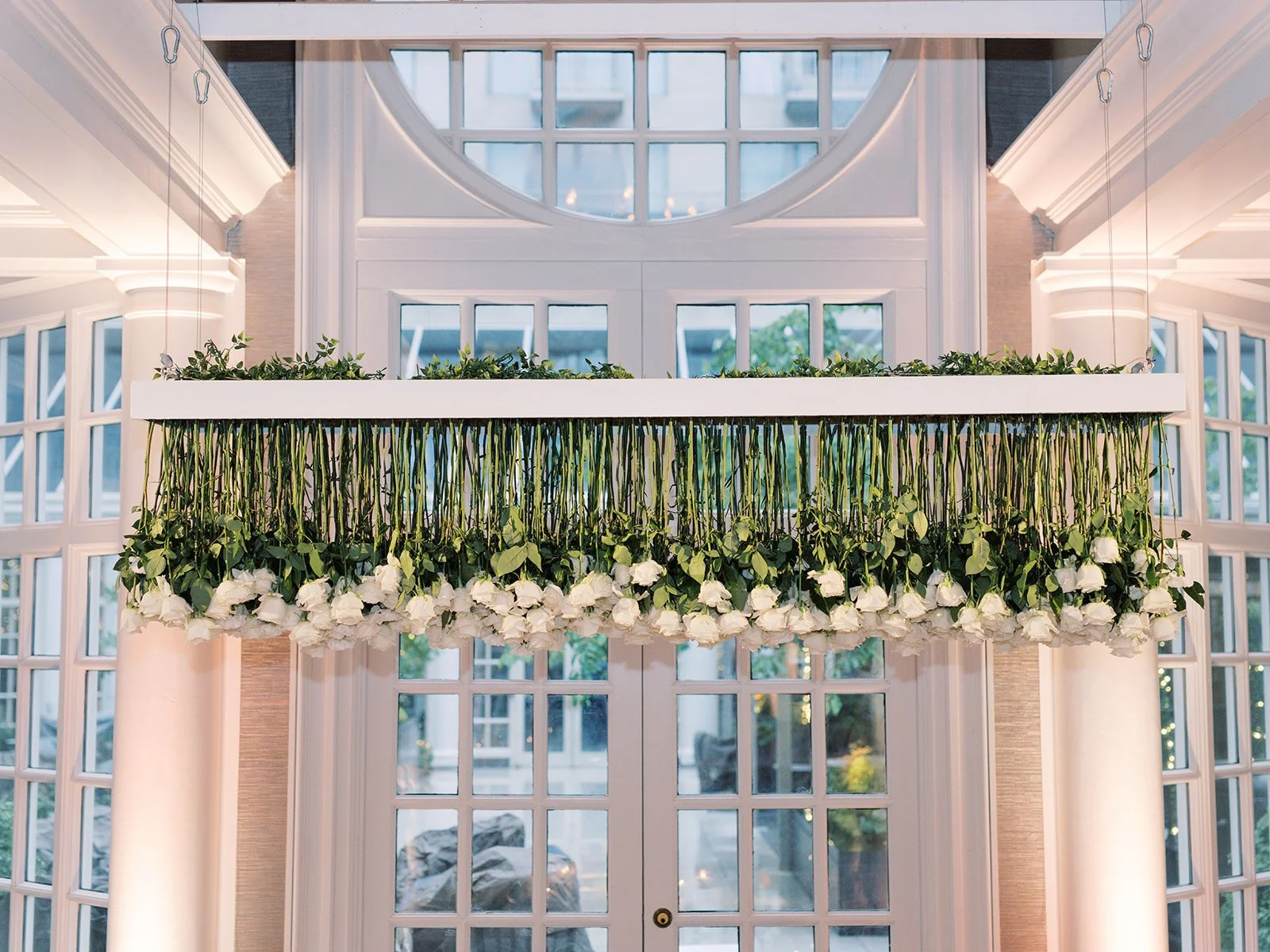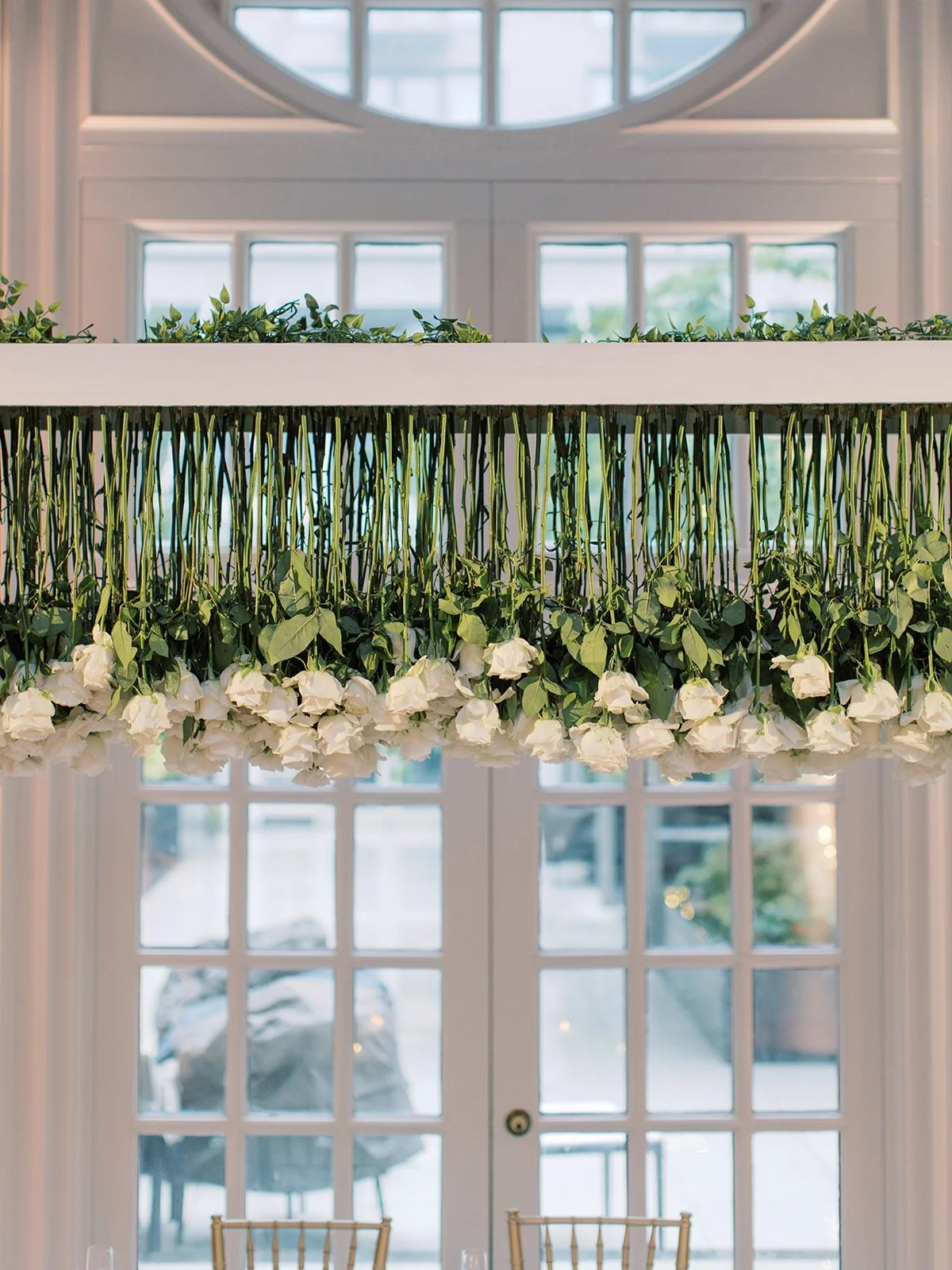 Gabby and Jason’s sweet wedding used tons of soft textures, in white, to create a light and romantic atmosphere. We loved being able to combine orchids, ranunculus, and roses all into this design to achieve the look! Our favorite of the day, though, was creating the hanging rose installation over the sweetheart table. Planning by Kim Newton Weddings and photography by Cassie for La Vie en Rose.