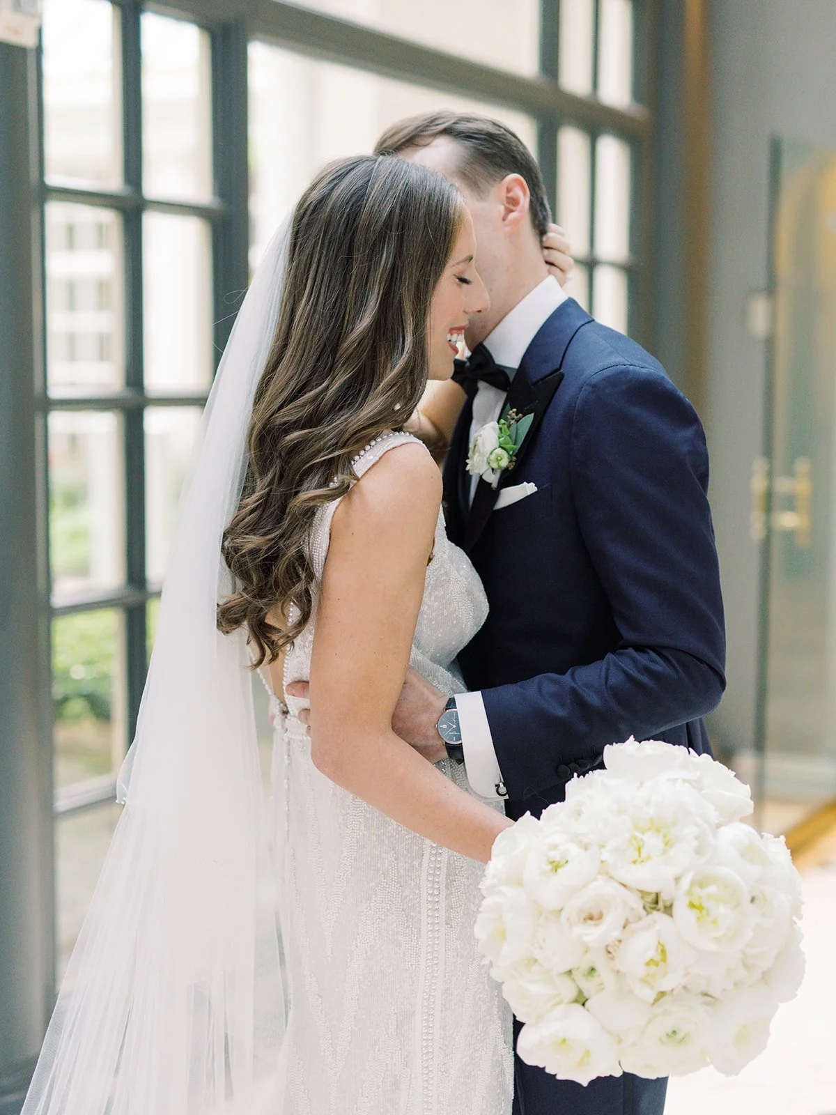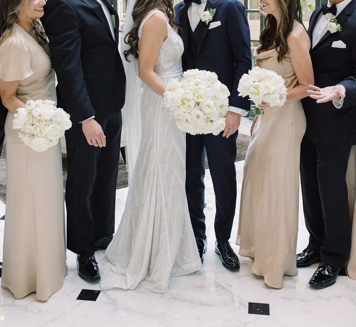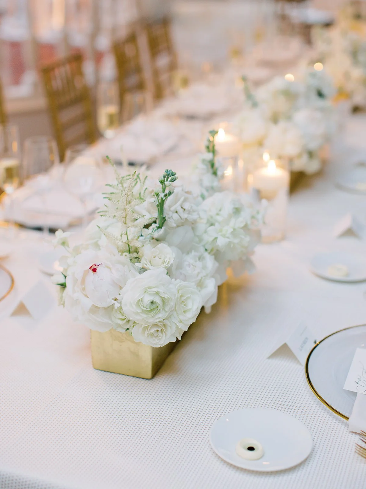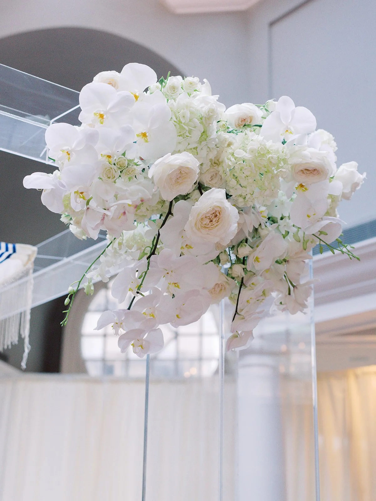 Gabby and Jason’s sweet wedding used tons of soft textures, in white, to create a light and romantic atmosphere. We loved being able to combine orchids, ranunculus, and roses all into this design to achieve the look! Our favorite of the day, though, was creating the hanging rose installation over the sweetheart table. Planning by Kim Newton Weddings and photography by Cassie for La Vie en Rose.