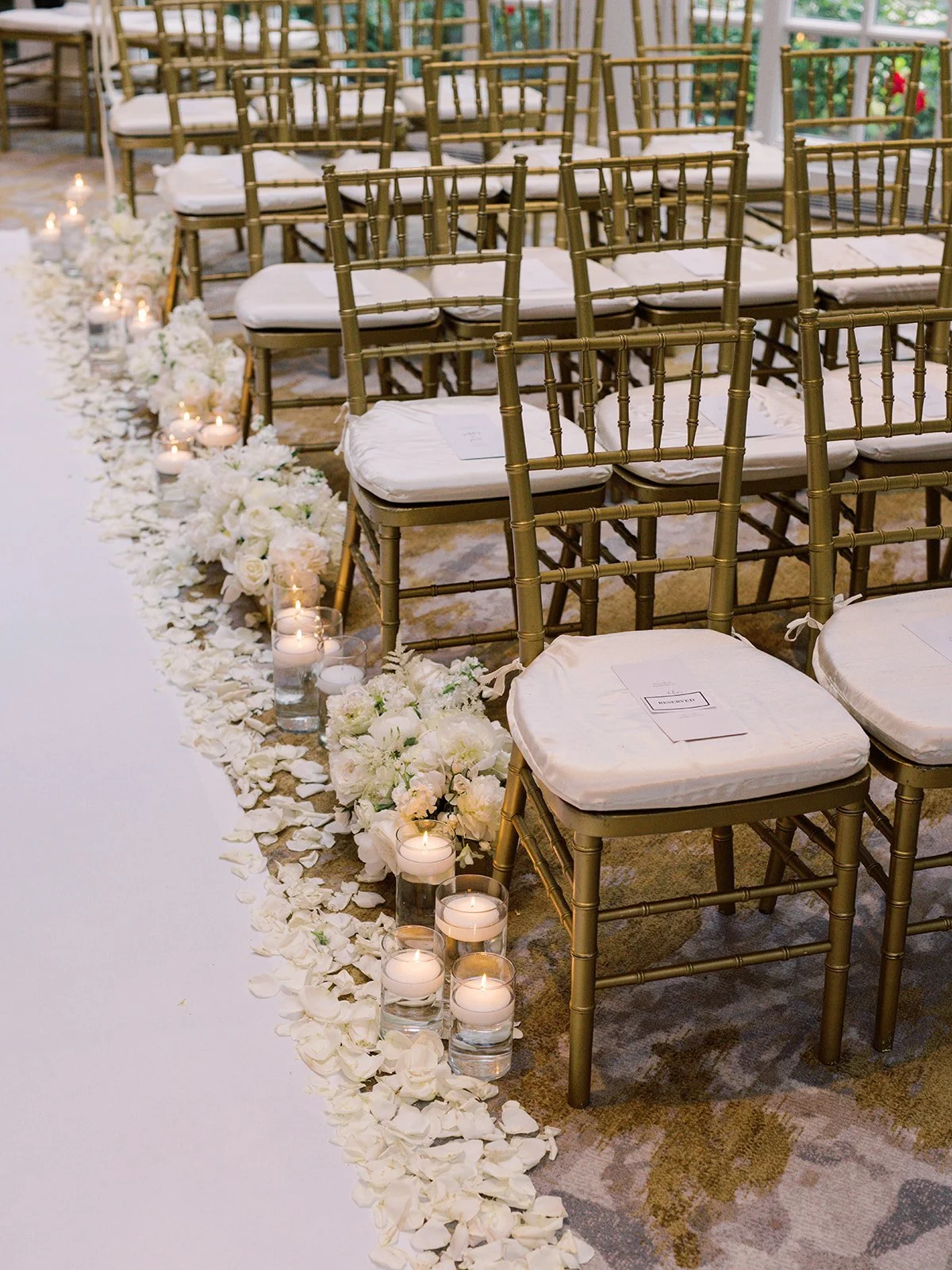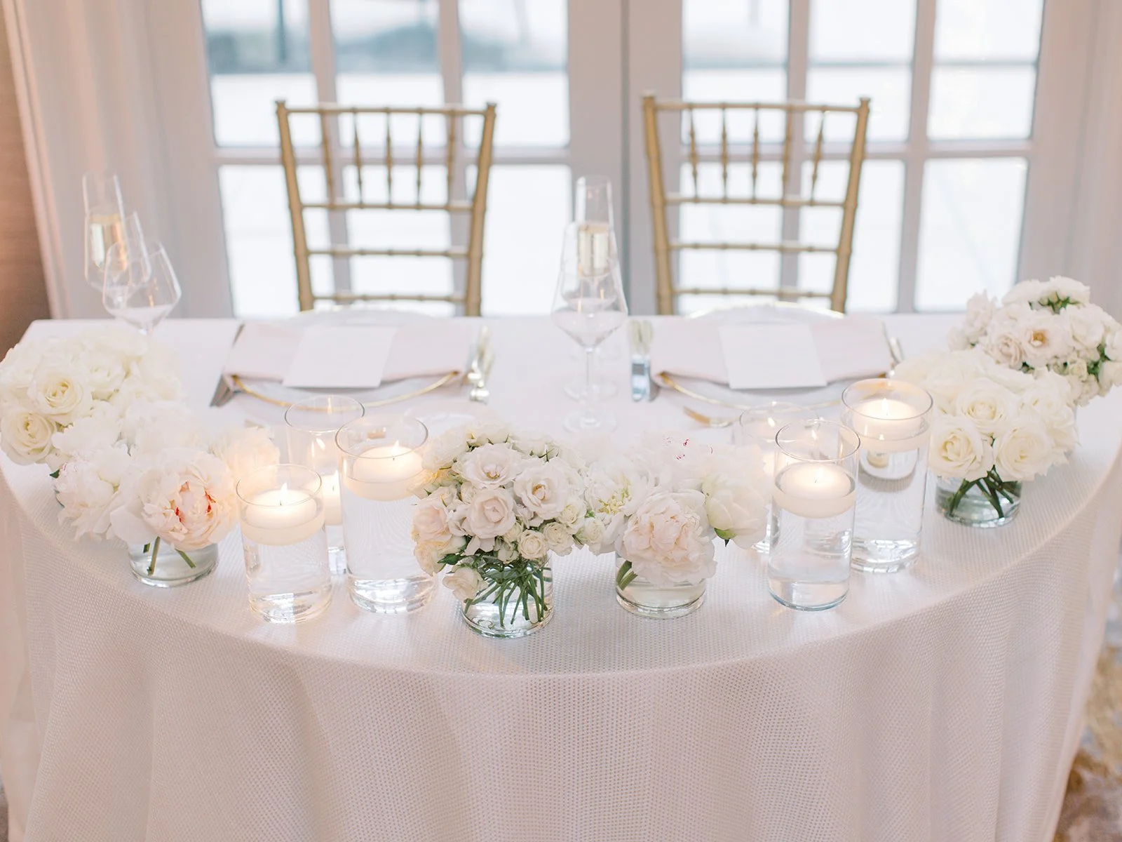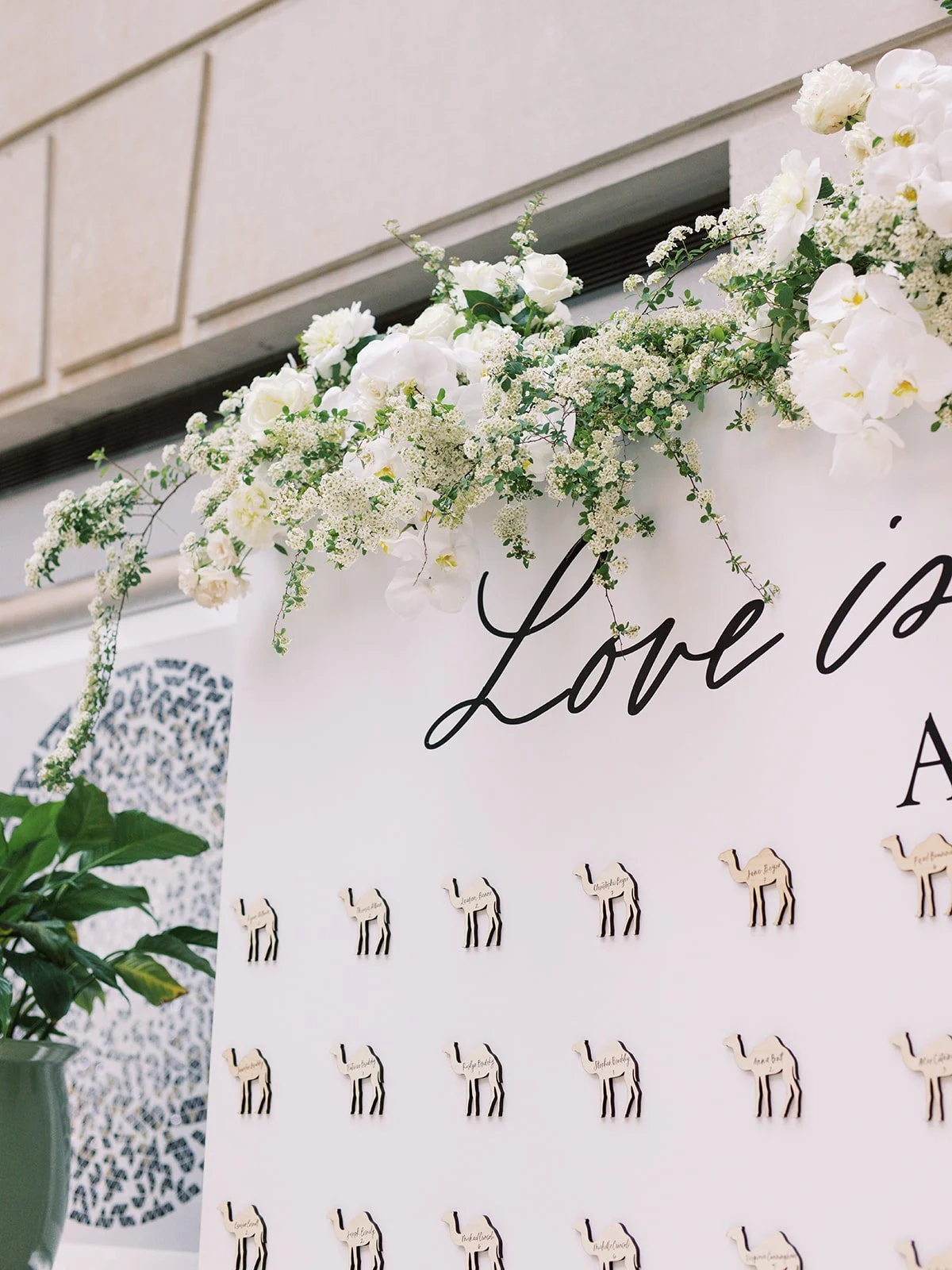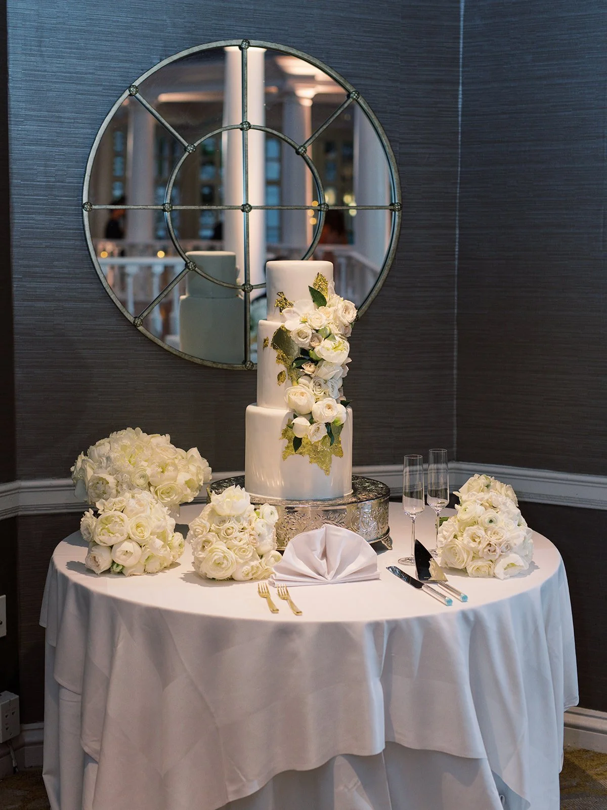 Gabby and Jason’s sweet wedding used tons of soft textures, in white, to create a light and romantic atmosphere. We loved being able to combine orchids, ranunculus, and roses all into this design to achieve the look! Our favorite of the day, though, was creating the hanging rose installation over the sweetheart table. Planning by Kim Newton Weddings and photography by Cassie for La Vie en Rose.
