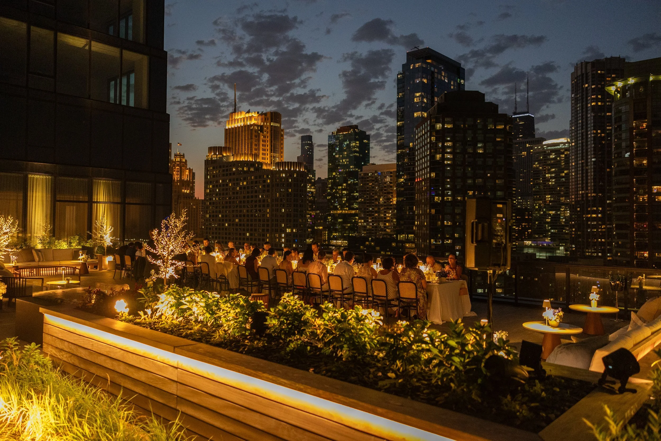 An intimate dinner with lush florals in blues and whites on the roof top of the St. Regis Chicago this summer was accented by the skyline of the city. Planning by Bash Please and photography by BFA.