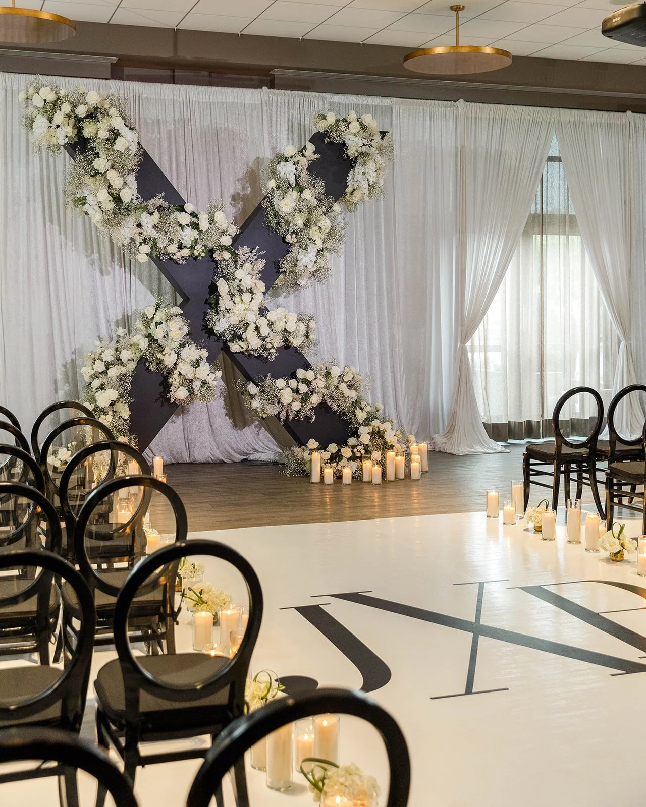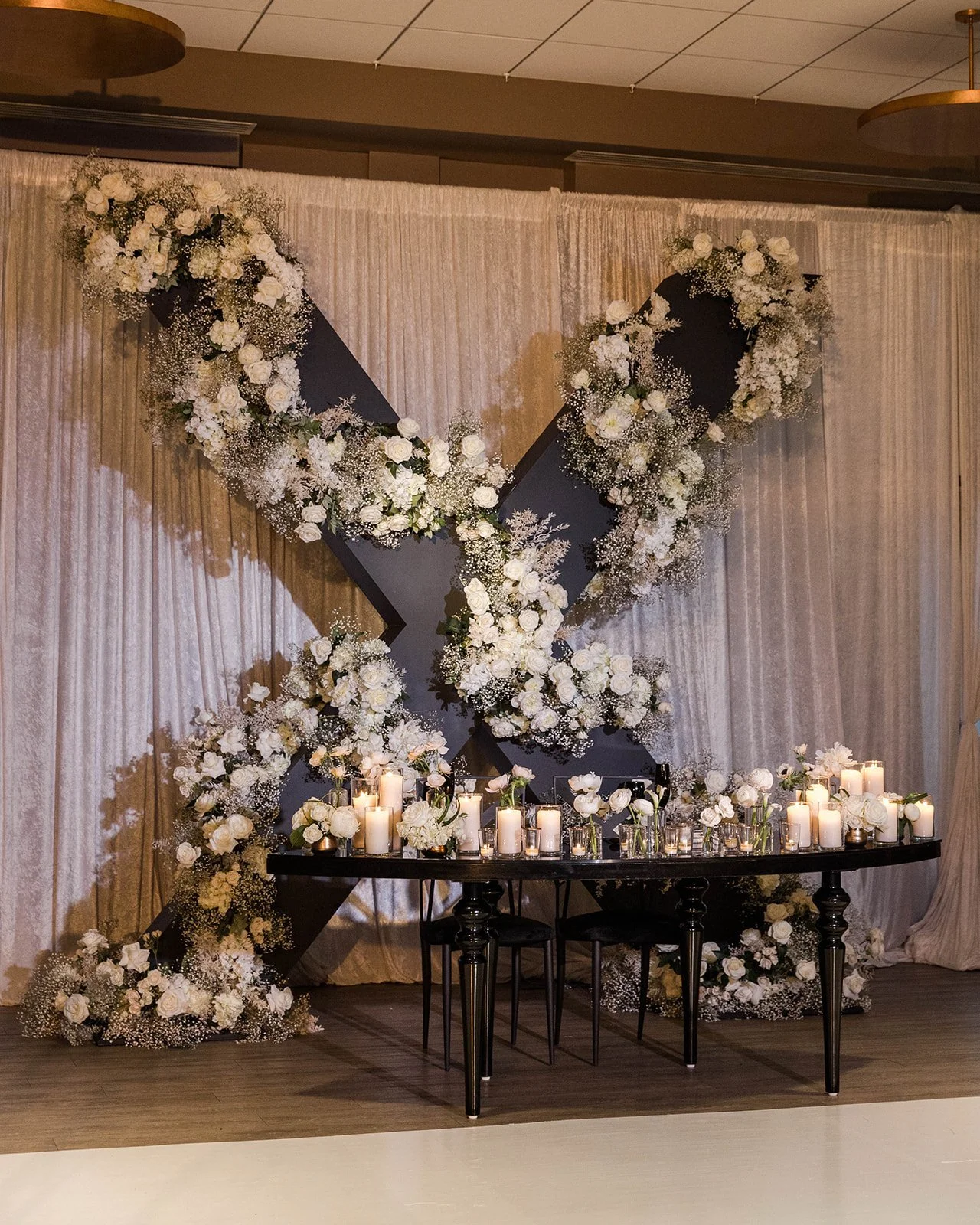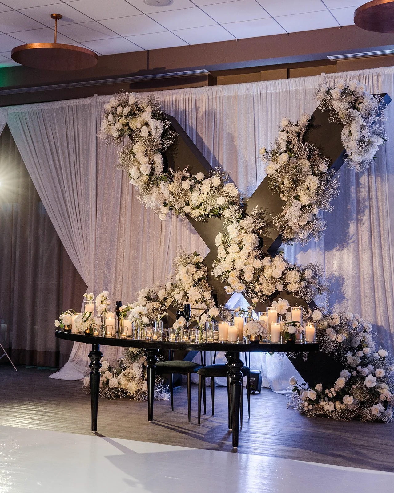 Janell and Berry’s romantic vow renewal blew us away with their use of understated glamor to highlight their love. We were so excited to be able to design huge fluffy baby’s breath clouds, wrapping around a giant ”X” . Planning by Favored by Yodit Events & Design and photography by Kyla Jeanette.
