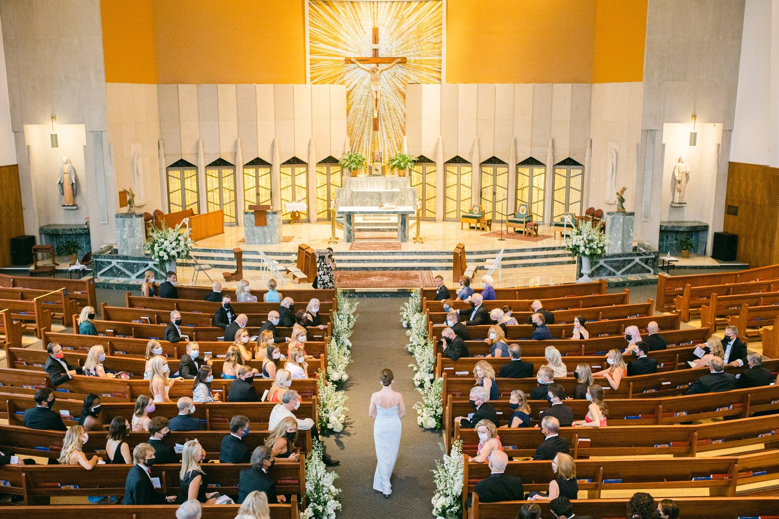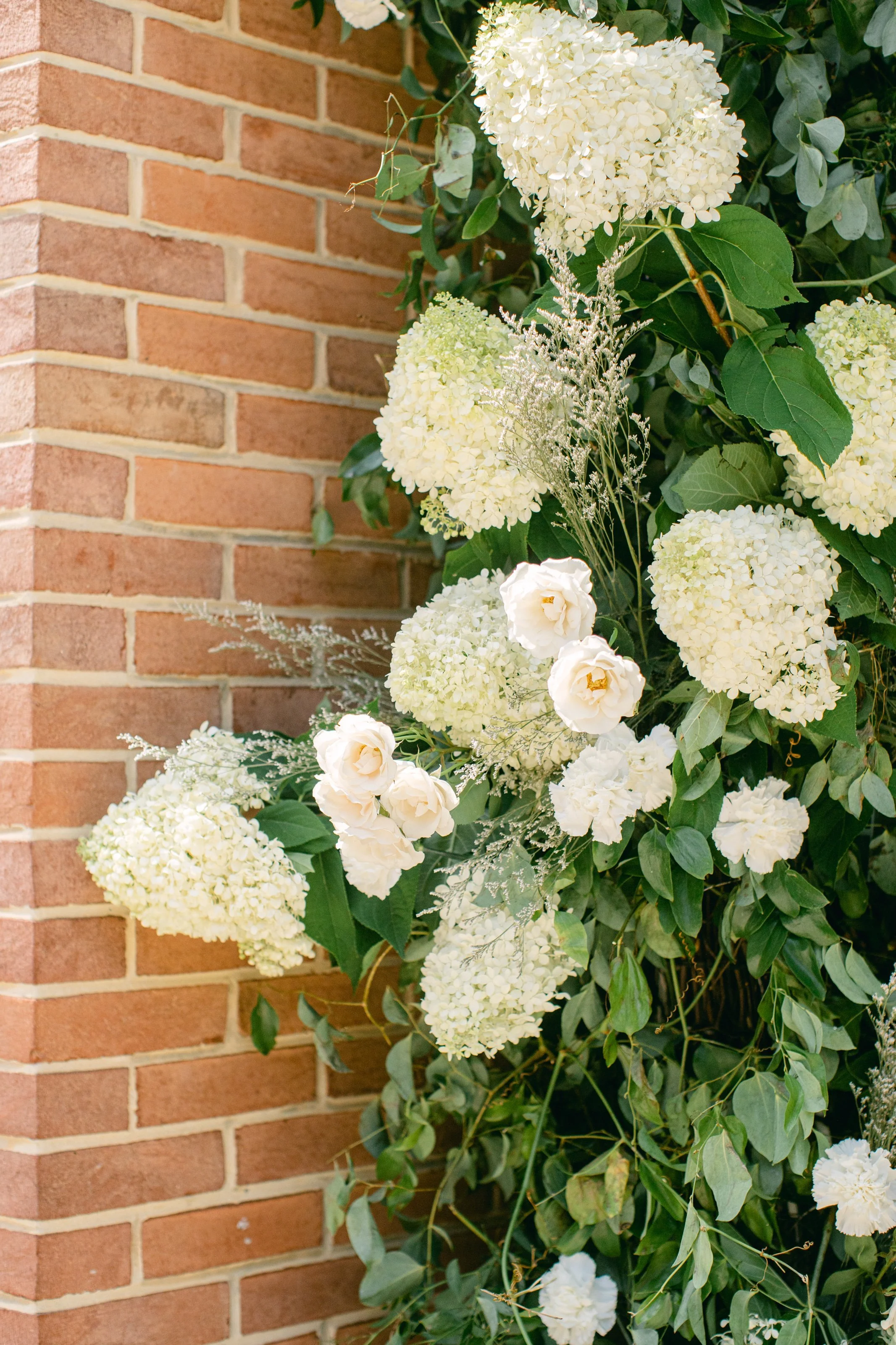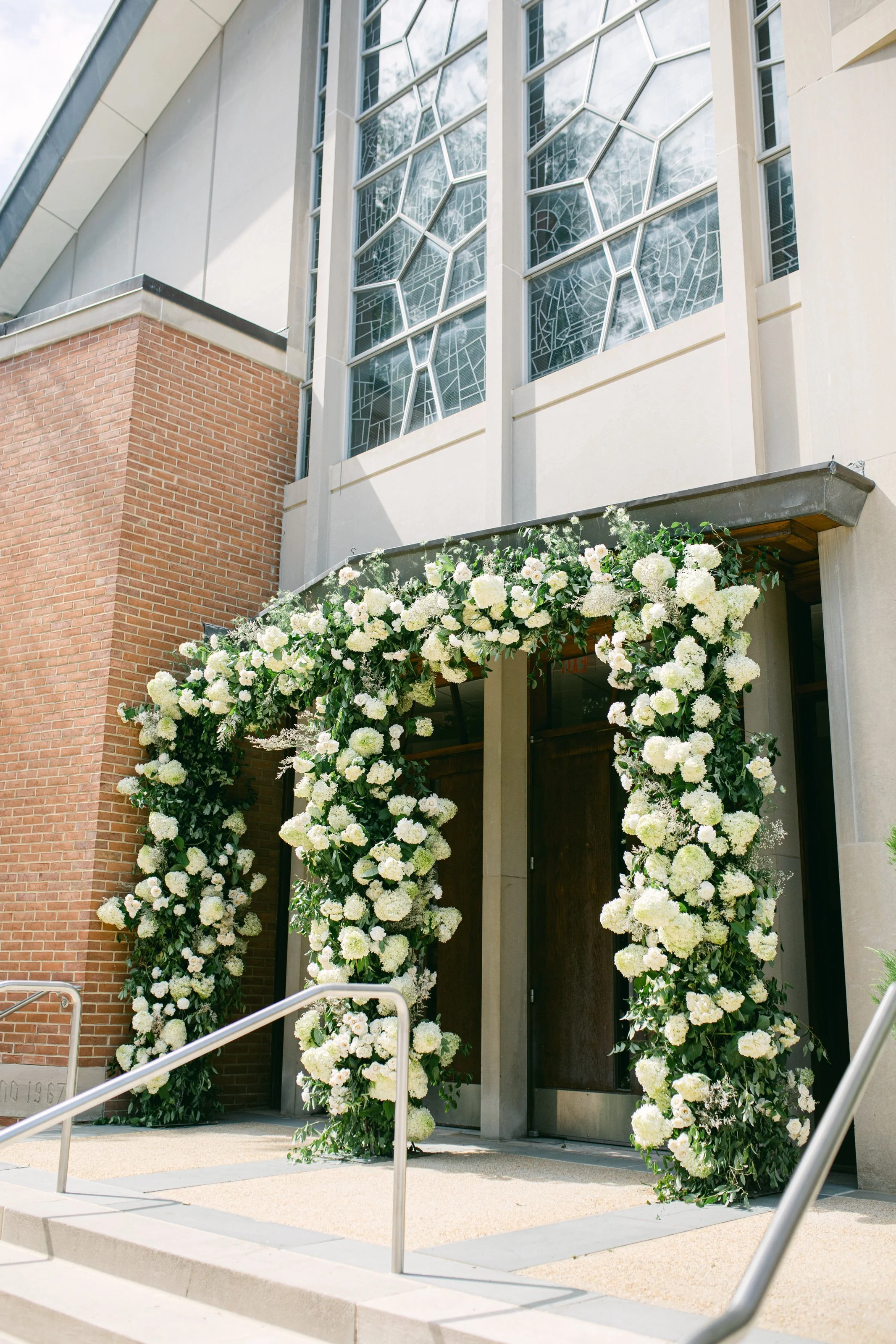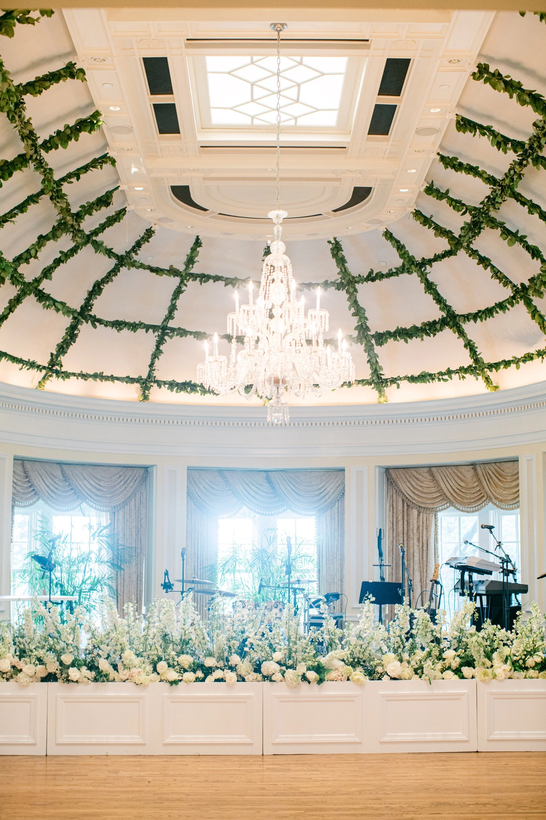 We are still gushing over Ashleigh and Andrew’s stunner of a wedding at the Chevy Chase Country Club last summer. The couple’s nuptials were simple and clean, letting the church shine, with a cream-colored arch and aisle gardens. The reception kept it classy with pops of brightly hued garden roses and gorgeous royal blue vases. Being able to create this greenery-filled grid on the ceiling was an absolute dream come true. Planning by Arney Walker and photography by Astrid Photography.