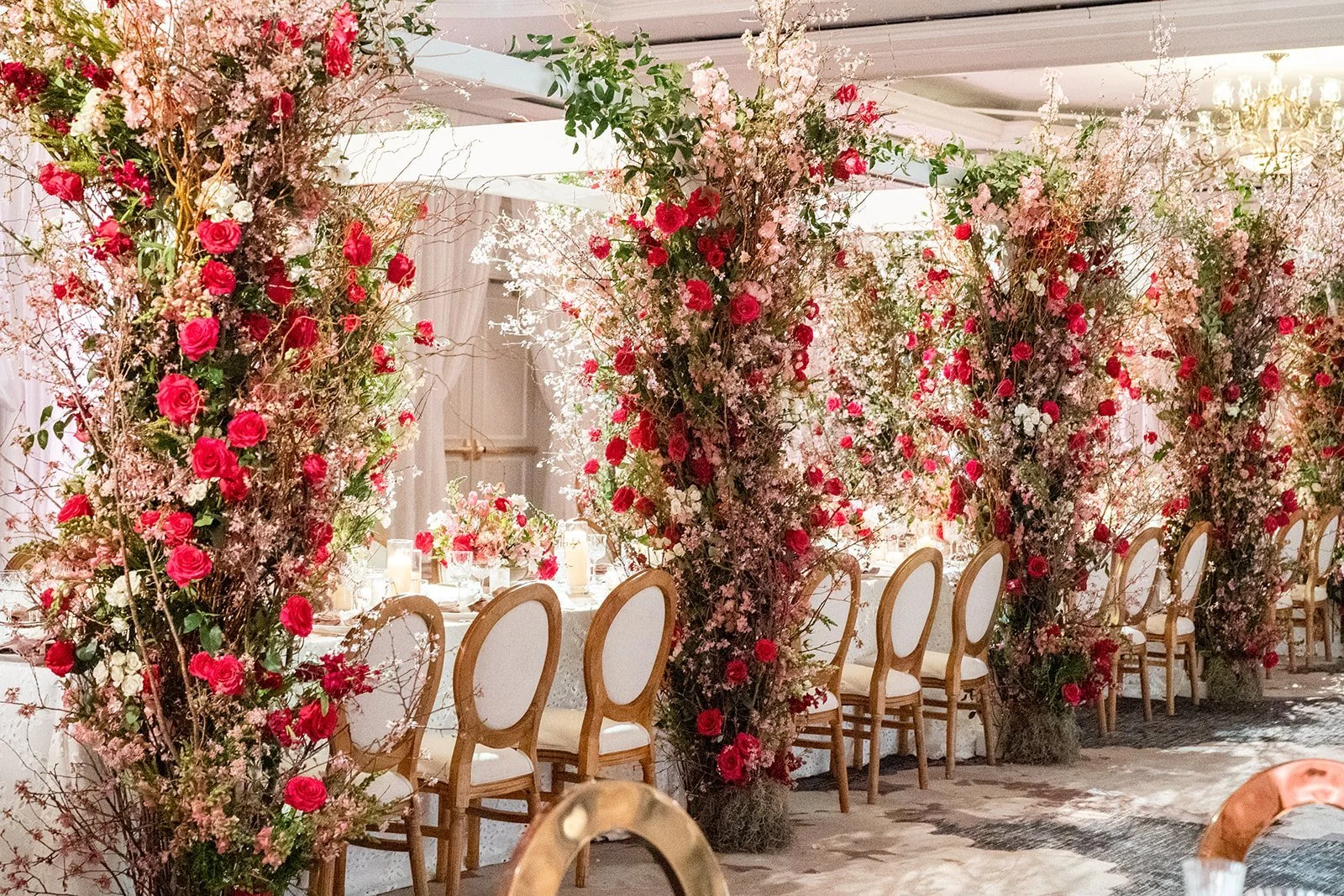 Nadeen and John had a dream for their wedding day: to fill it with sweet and vibrant cherry blossoms everywhere. We incorporated this DC-classic into an expansive installation encompassing their head table and incorporating playful pinks throughout. Planning by Simply Chic Events and photography by Astrid Photography.