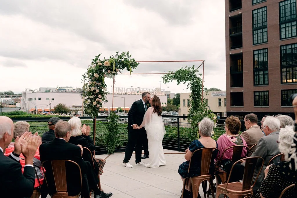 Carolyn and Chris’s sleek and intimate wedding at The Autoshop in DC was kept fun and filled with personal details. After getting hitched in front of a floral-adorned copper structure that overlooked Union Market, they ate and drank the night away with tables overflowing with hops, floral window gardens, and abundant greenery overhead. Planning by Lily + Grayson Event Design and photography by Lisa Ziesing for Abby Jiu Photography.