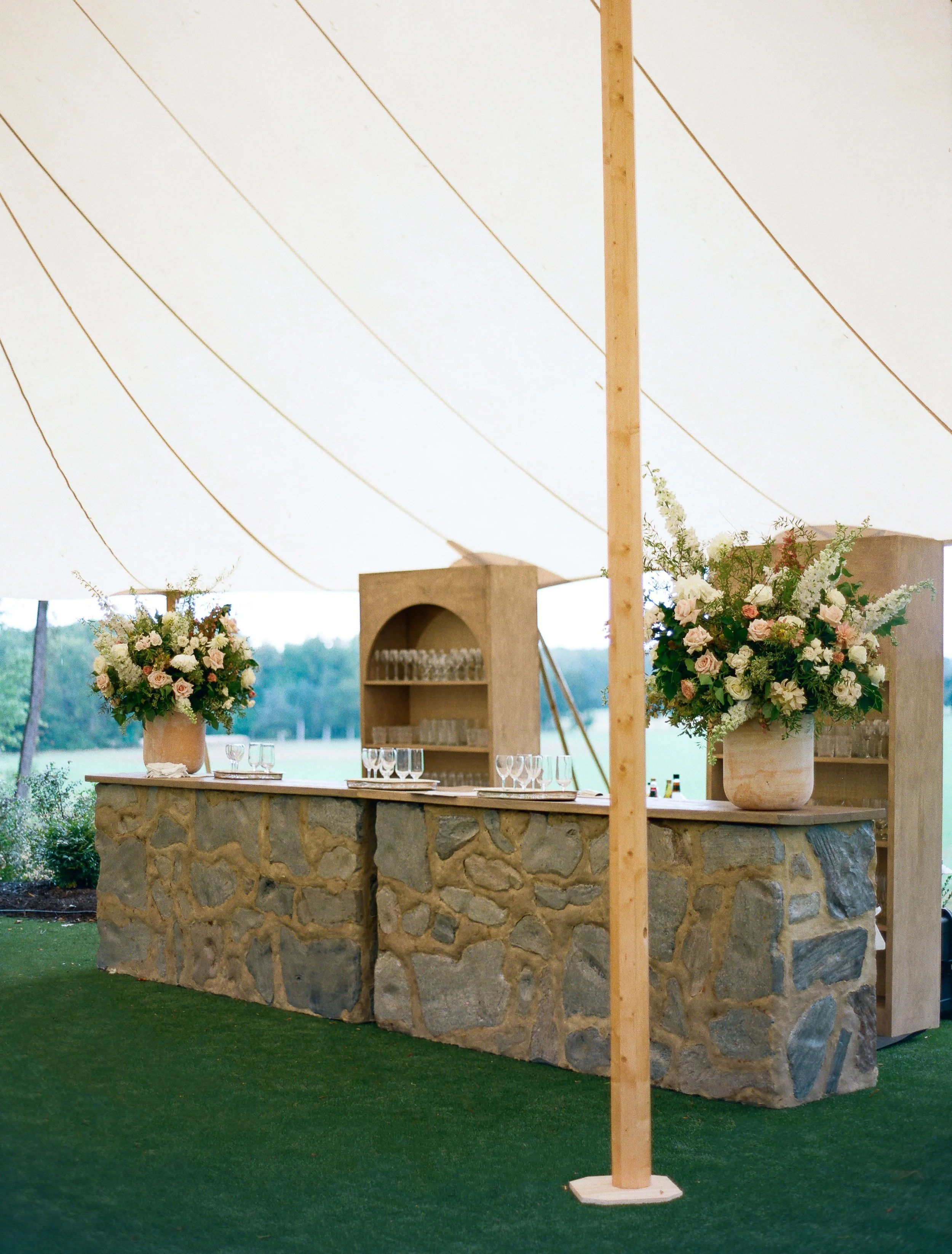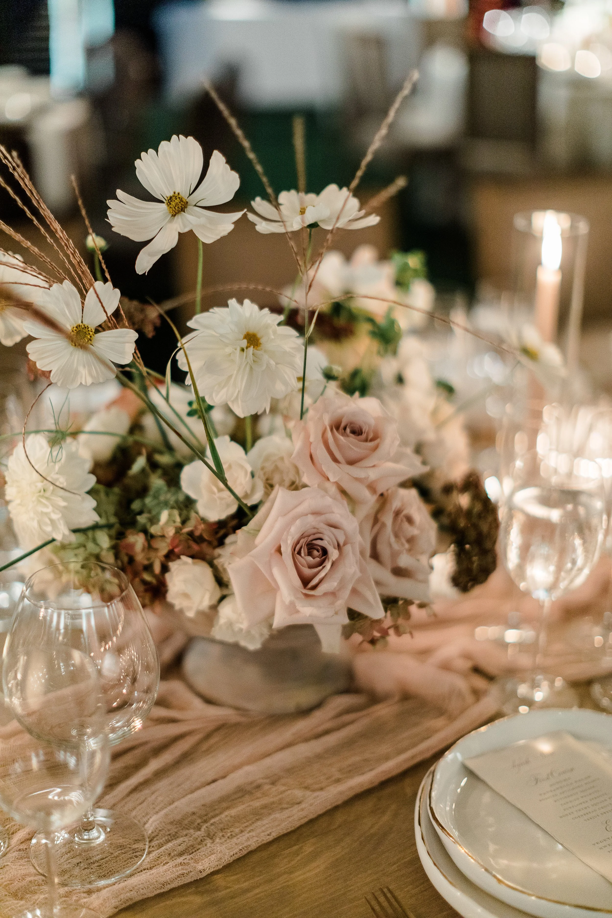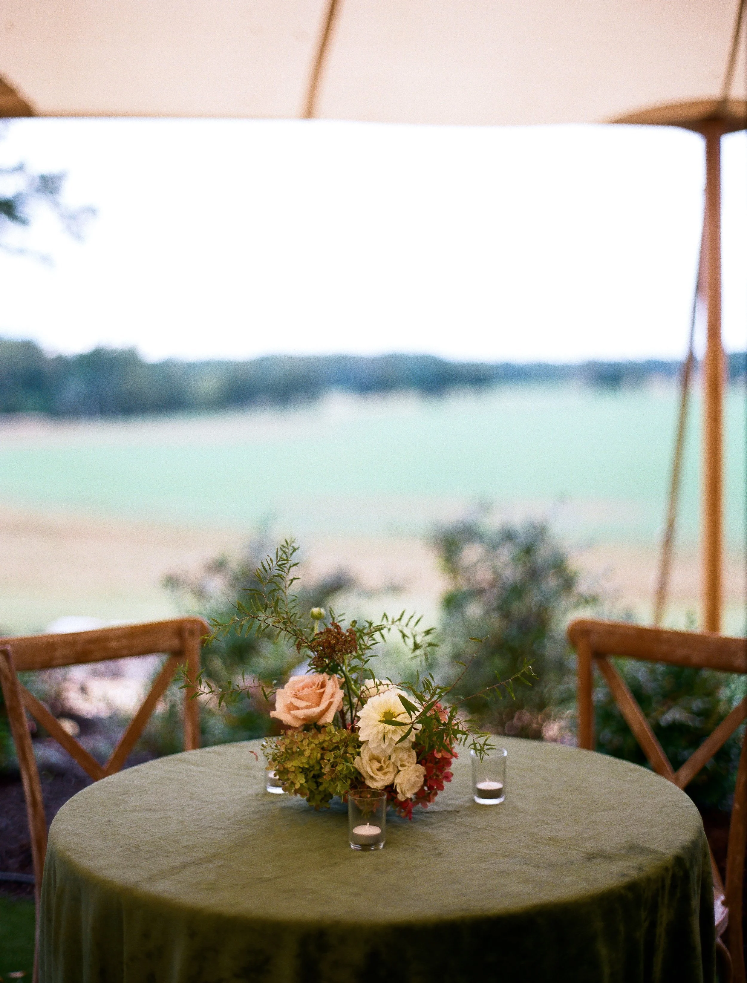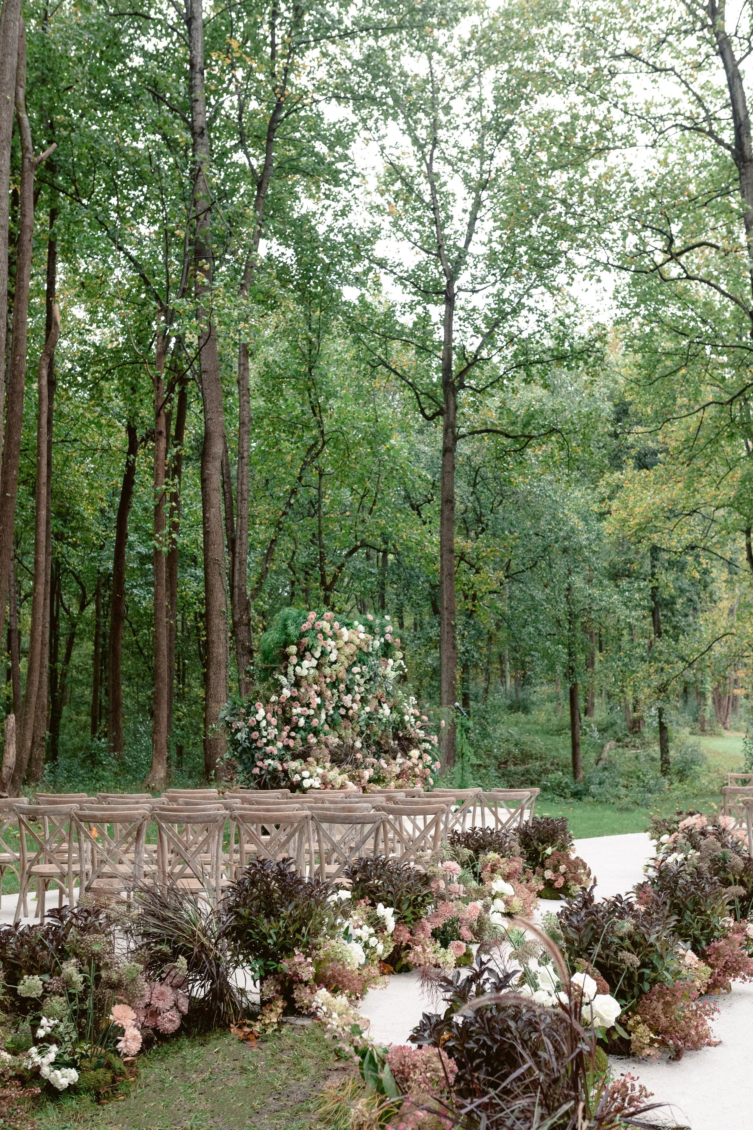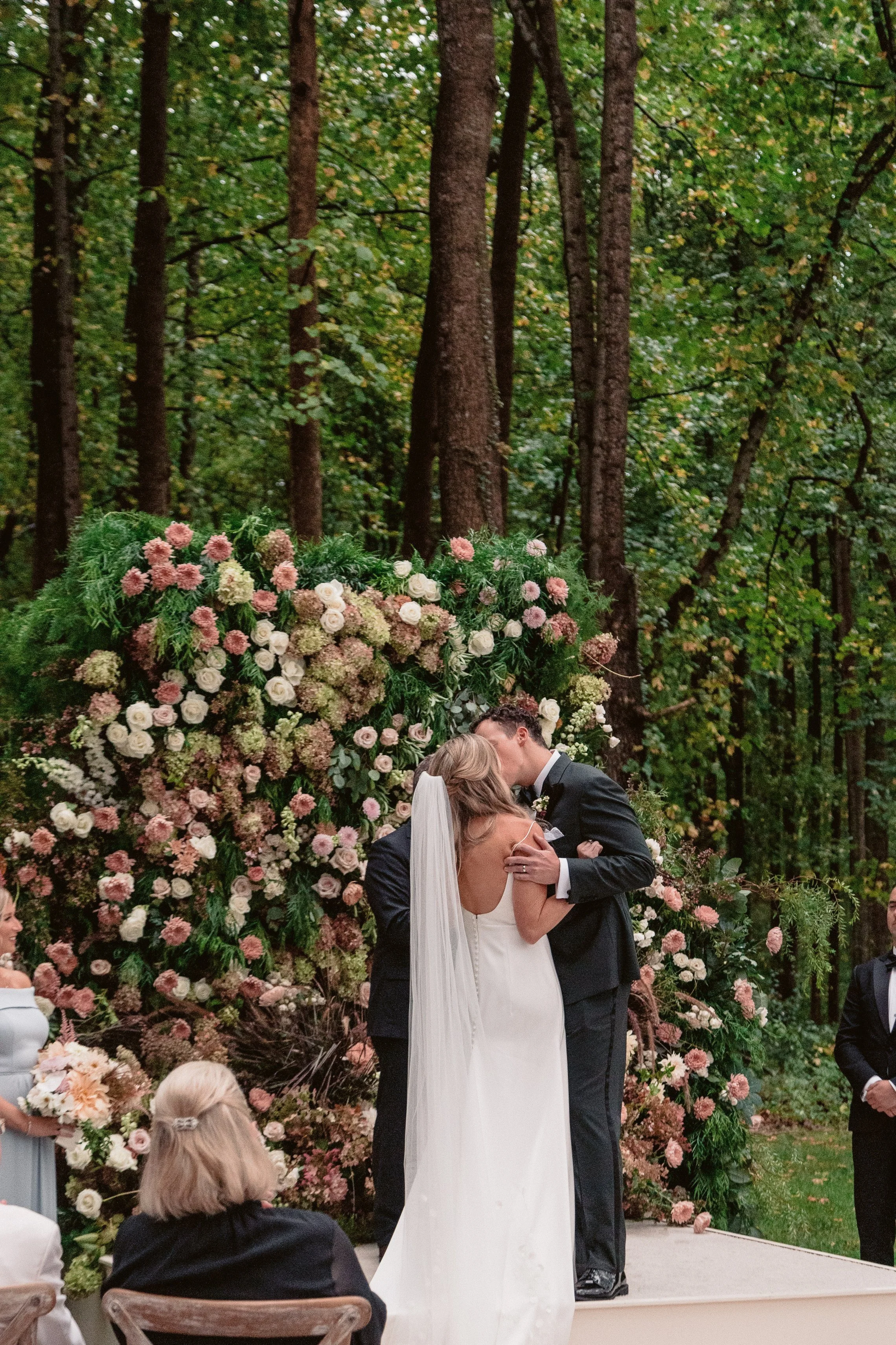 Kylie and Rich’s magical wedding at The Lodge at Moss Neck was full of whimsy and fairytale vibes. Burnished blush, muted mauve, and greenery gave this rustic woodland wedding an elegant and romantic touch. This total stunner of the day was the long path of gardens, appearing to grow from the ground, all leading up to the huge wall filled to the brim with roses and mums. Planning by Evoke DC and photography by Laura Murray.