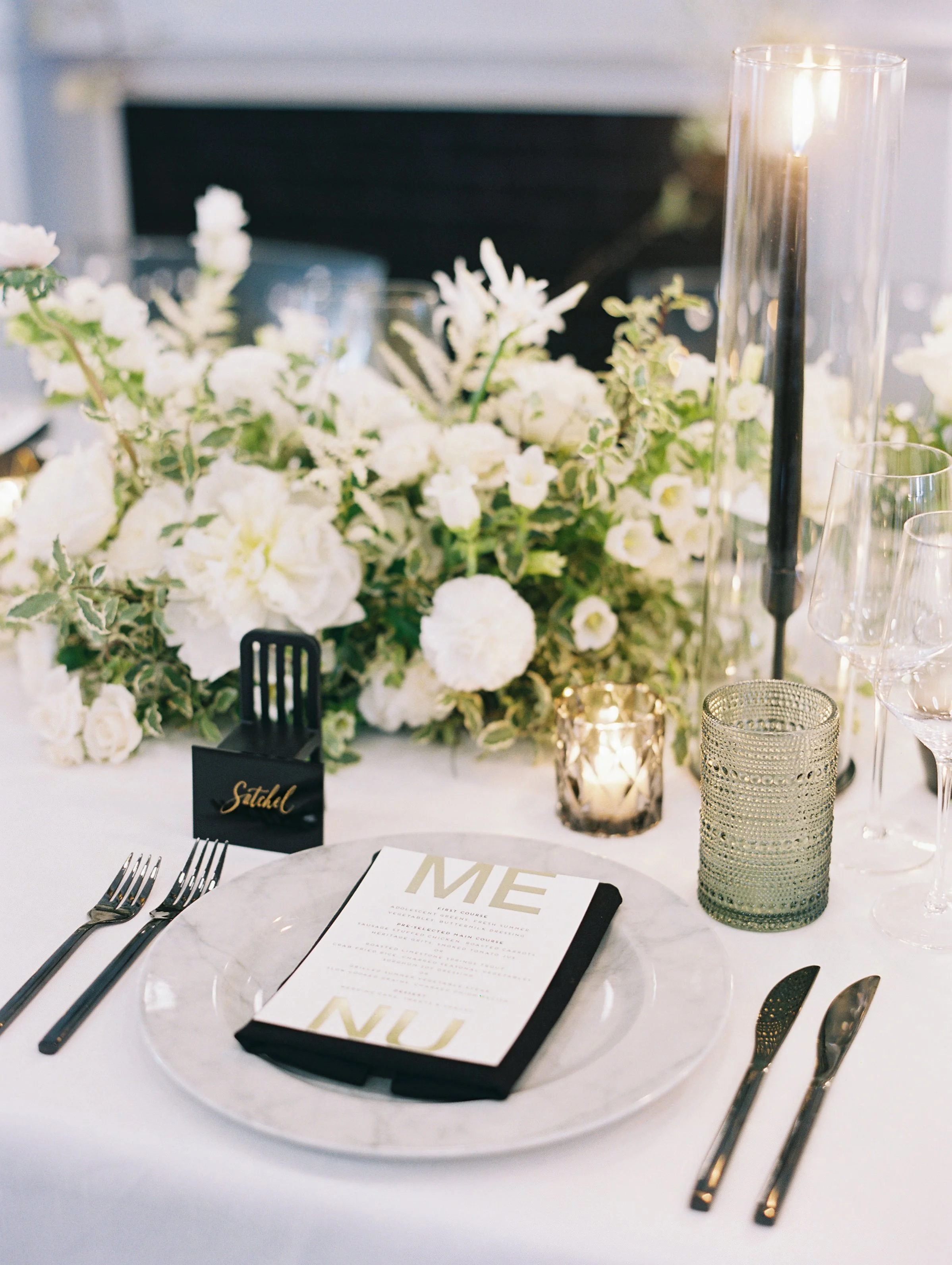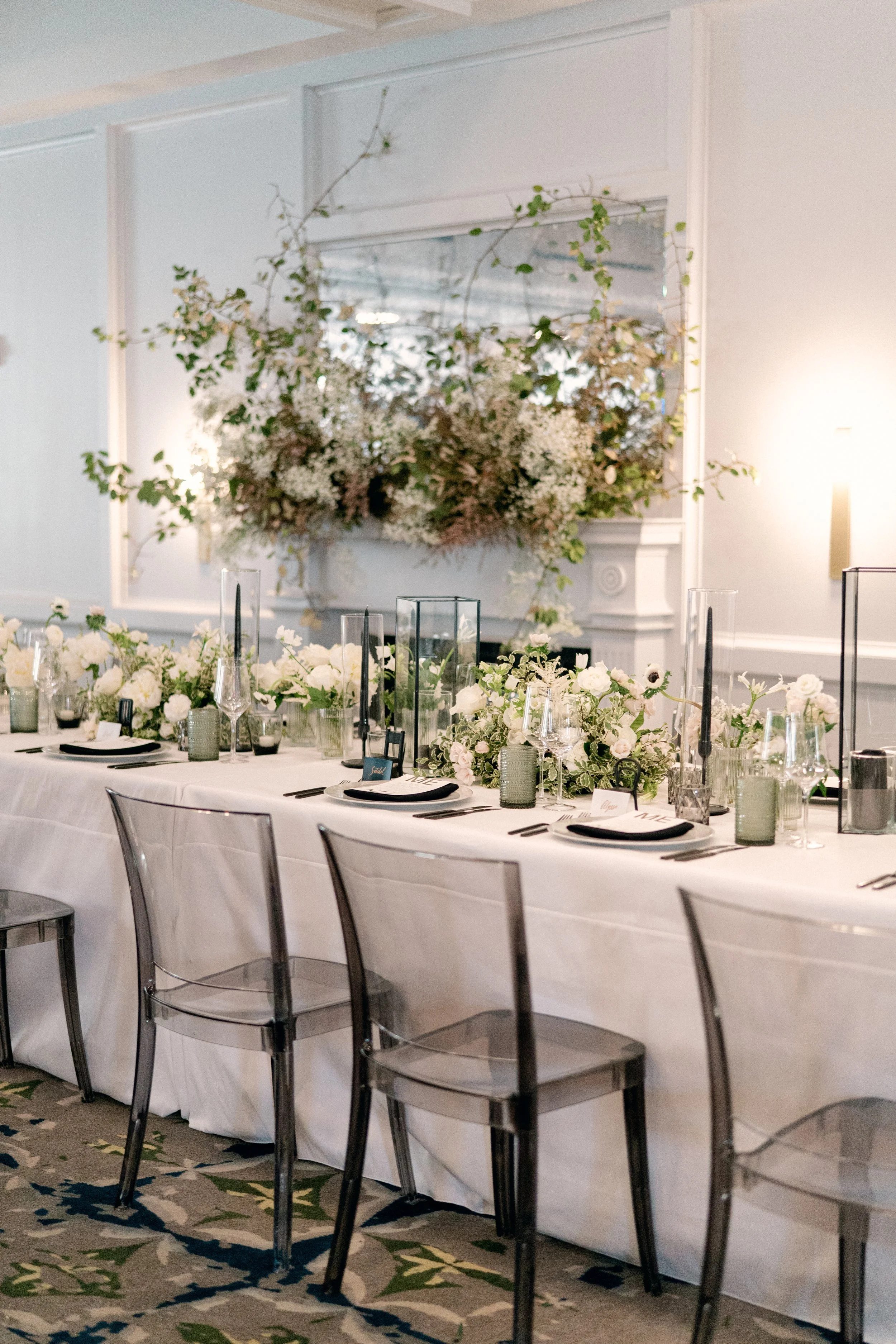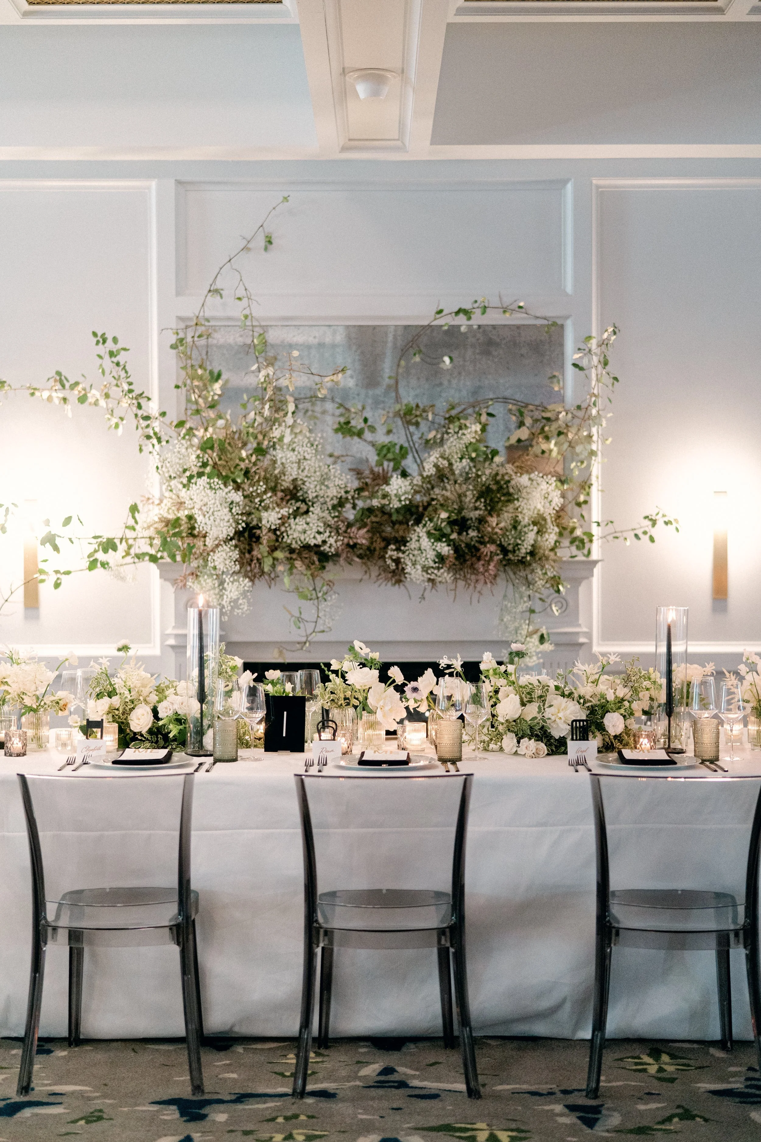Jessica and Charisse’s chic wedding at The Line Hotel was kept simple, but isn’t that the ultimate sophistication? After their sleek ceremony, guests were led to their seats by a fun escort wall, highlighted with gold lanterns and playful greenery. The intimate dinner exuded modern romance with a touch of whimsey with the mantle installation and touches of black against the white florals. Planning by Laura Christie Britt and photography by Lisa Ziesing for Abby Jiu.