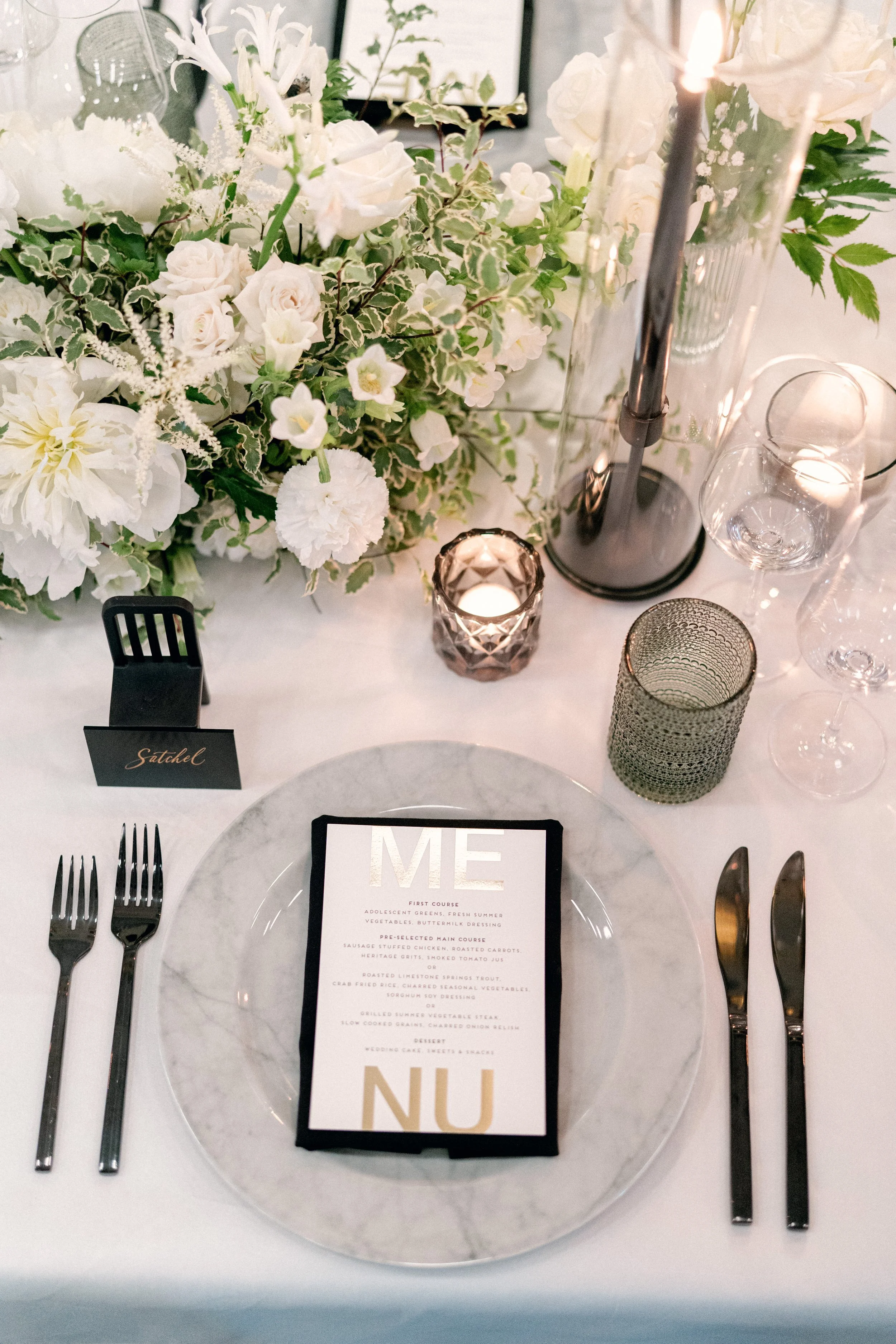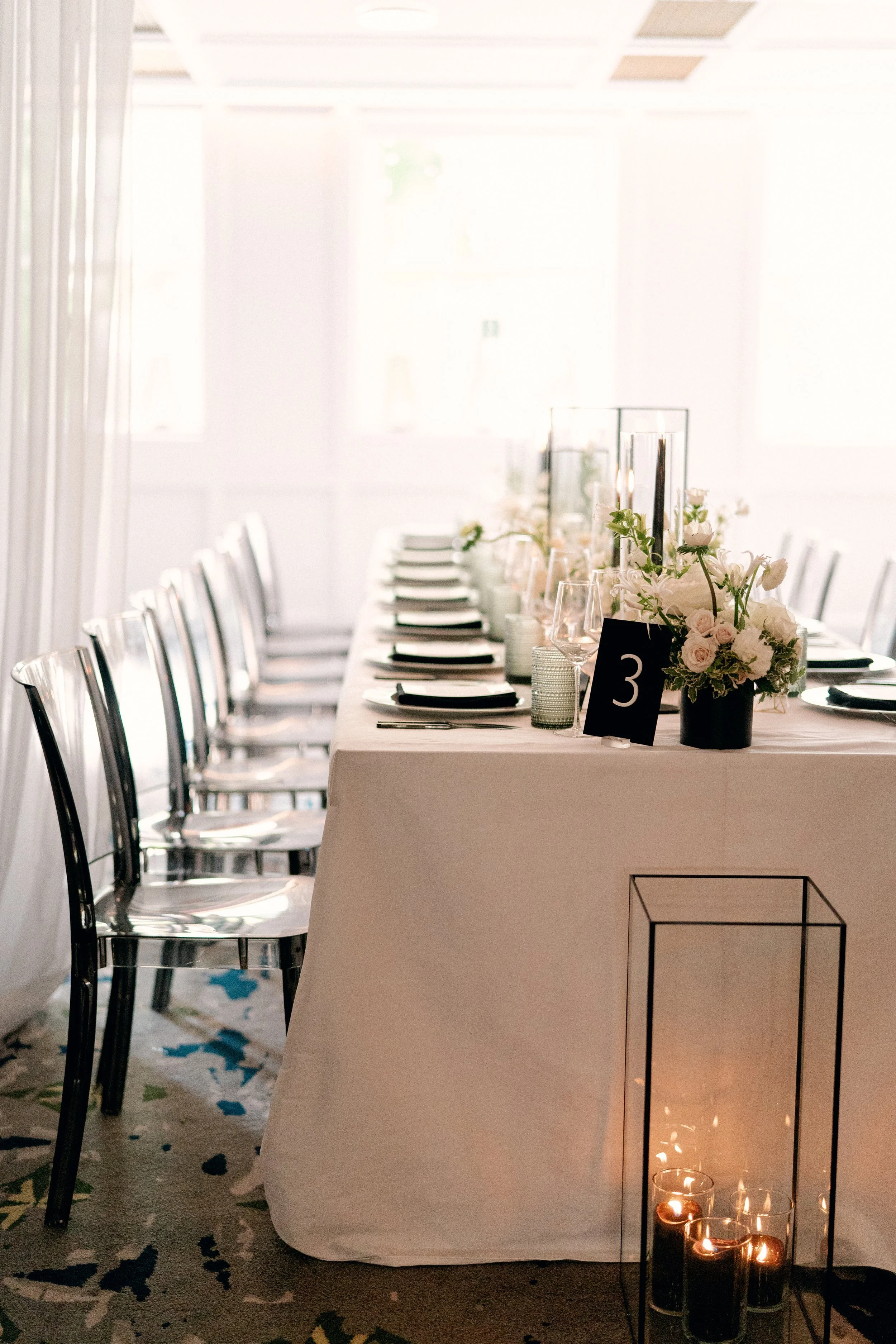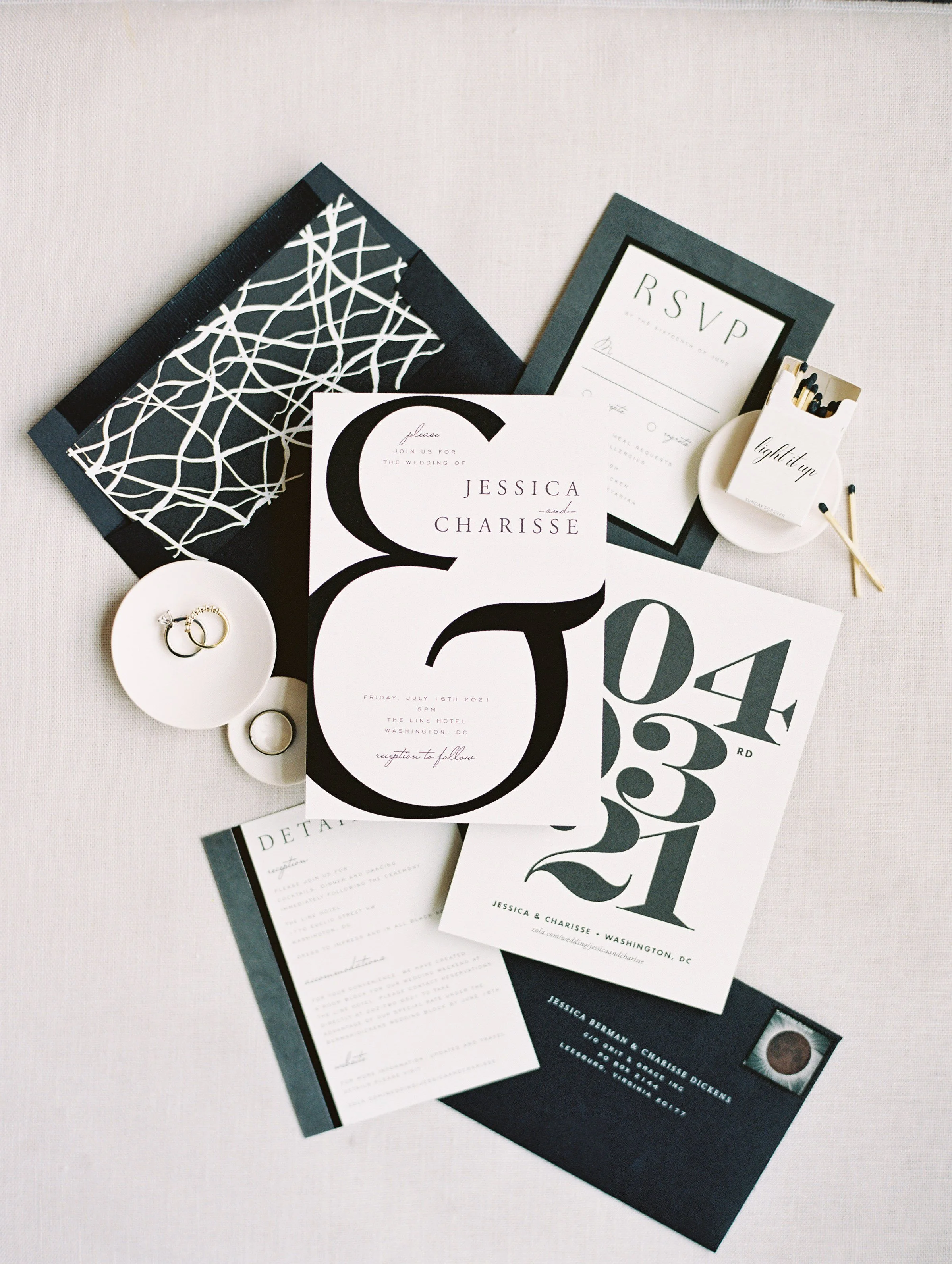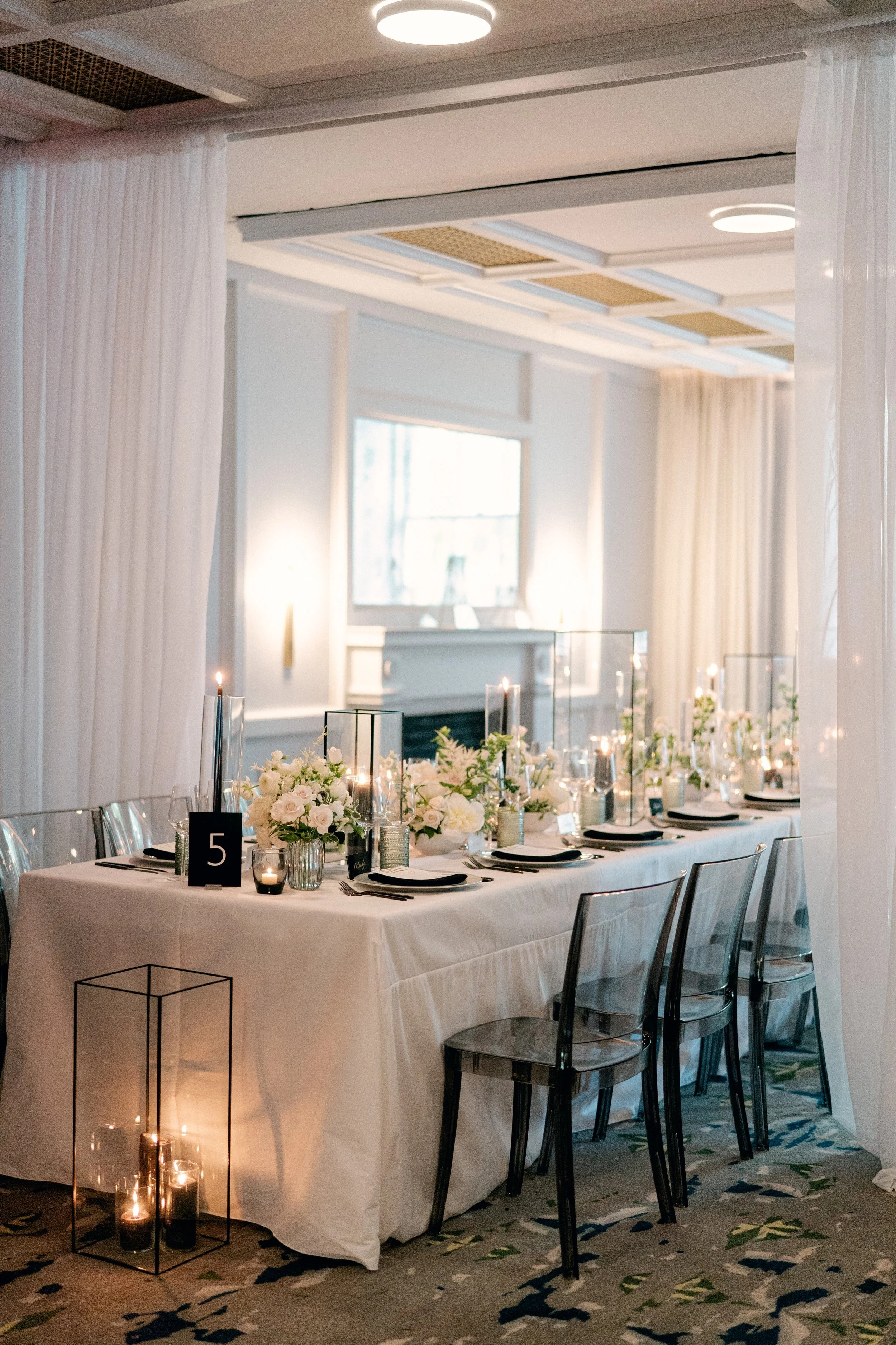 Jessica and Charisse’s chic wedding at The Line Hotel was kept simple, but isn’t that the ultimate sophistication? After their sleek ceremony, guests were led to their seats by a fun escort wall, highlighted with gold lanterns and playful greenery. The intimate dinner exuded modern romance with a touch of whimsey with the mantle installation and touches of black against the white florals. Planning by Laura Christie Britt and photography by Lisa Ziesing for Abby Jiu.