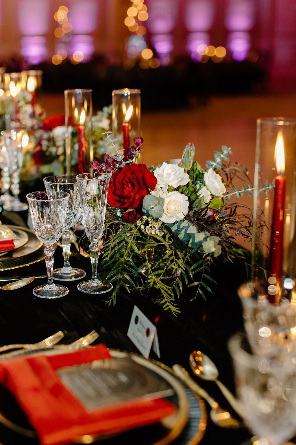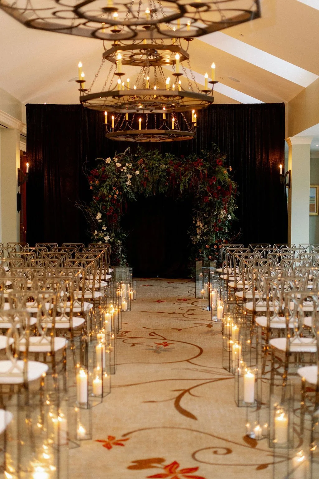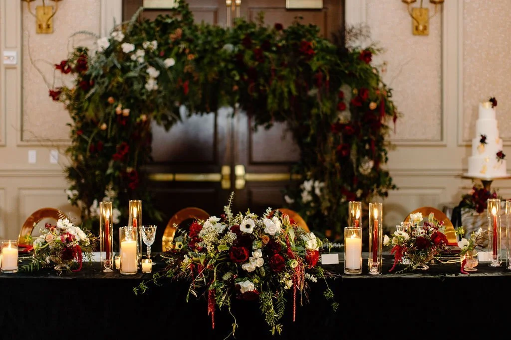 Rachel + Alex’s holiday wedding was beautifully elegant with rich touches. The couple focused on lush, deep details that complimented the winter affair. Along with the velvet and jewel-tones, the showstopper of the day was truly the large arch behind the couple at the ceremony. Planning by Havard Events and Design and photography by Erika Tuesta