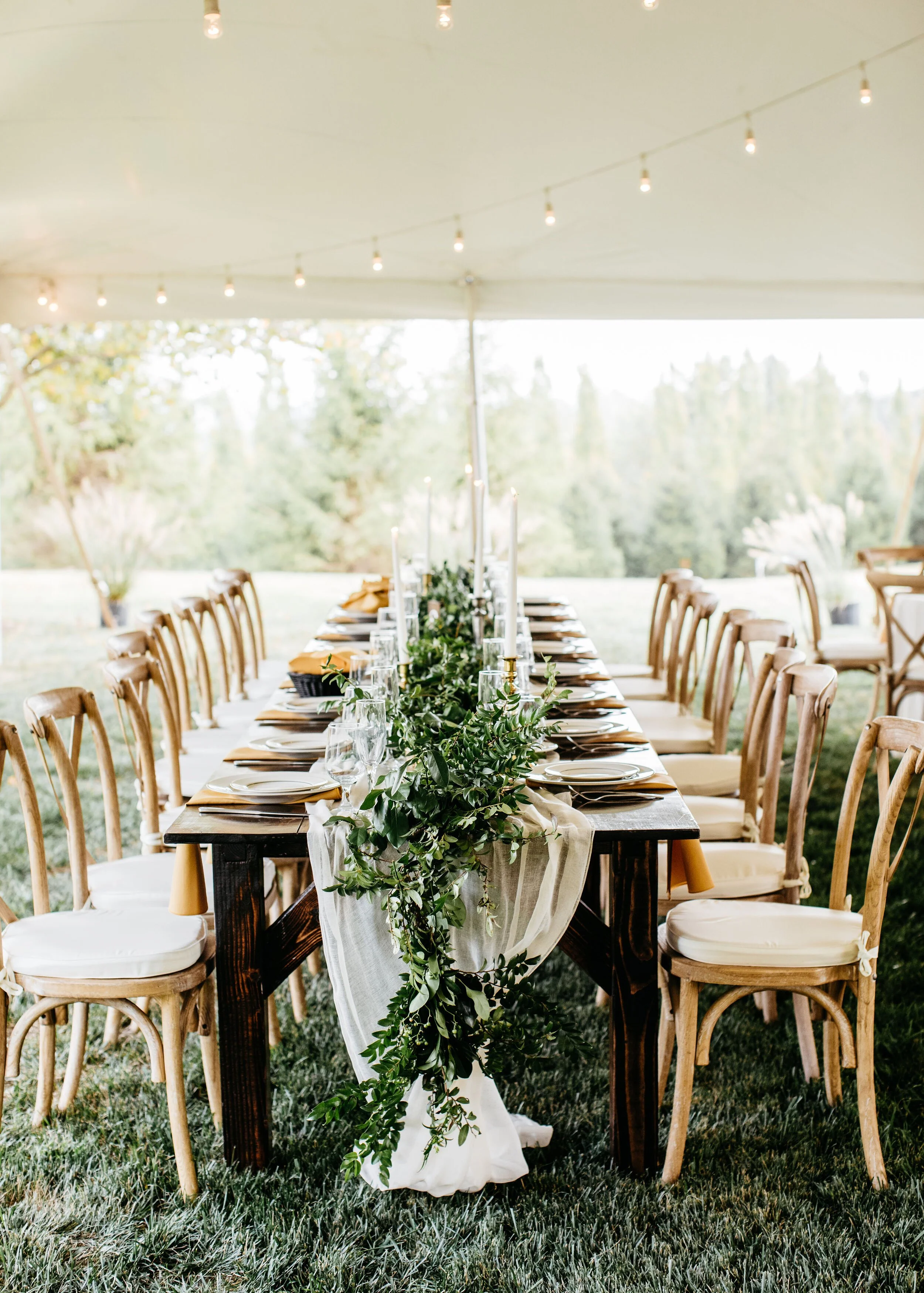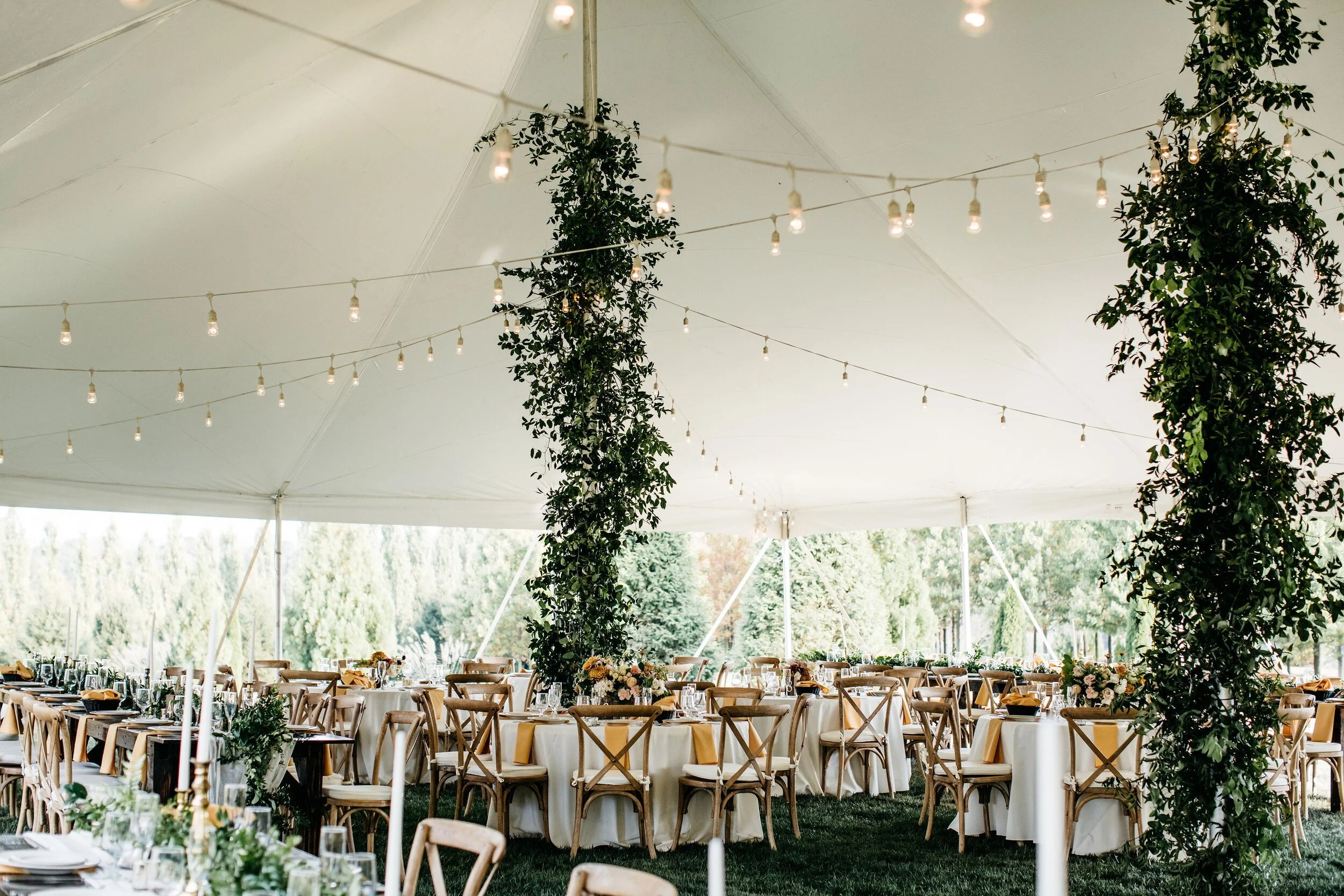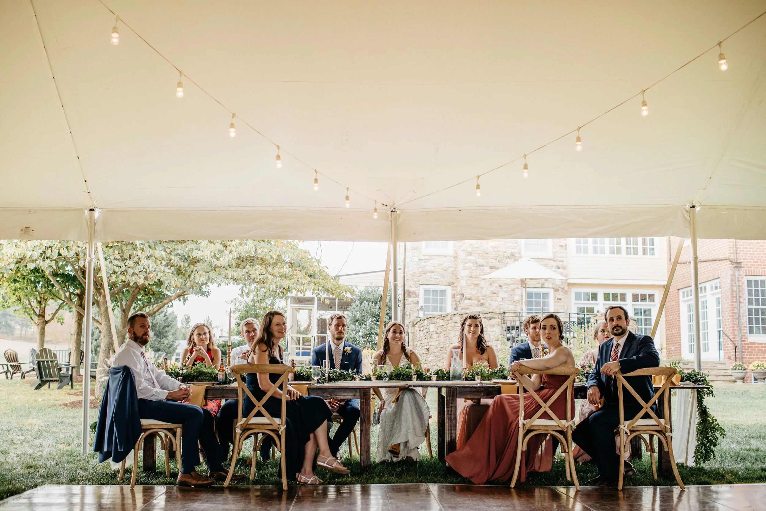 Sophie's sweet cousin Kathleen got married to Andy at her family farm in Burkettsville, MD. It was so wonderful working along with Kim Newton Weddings to make their dream wedding a reality. From the lush greenery climbing up the tent poles to the muted but colorful bouquets, to dancing the night away with family; this wedding goes down on our list of all-time-favorites. Emily Gude captured beautiful photos of this night to be remembered.