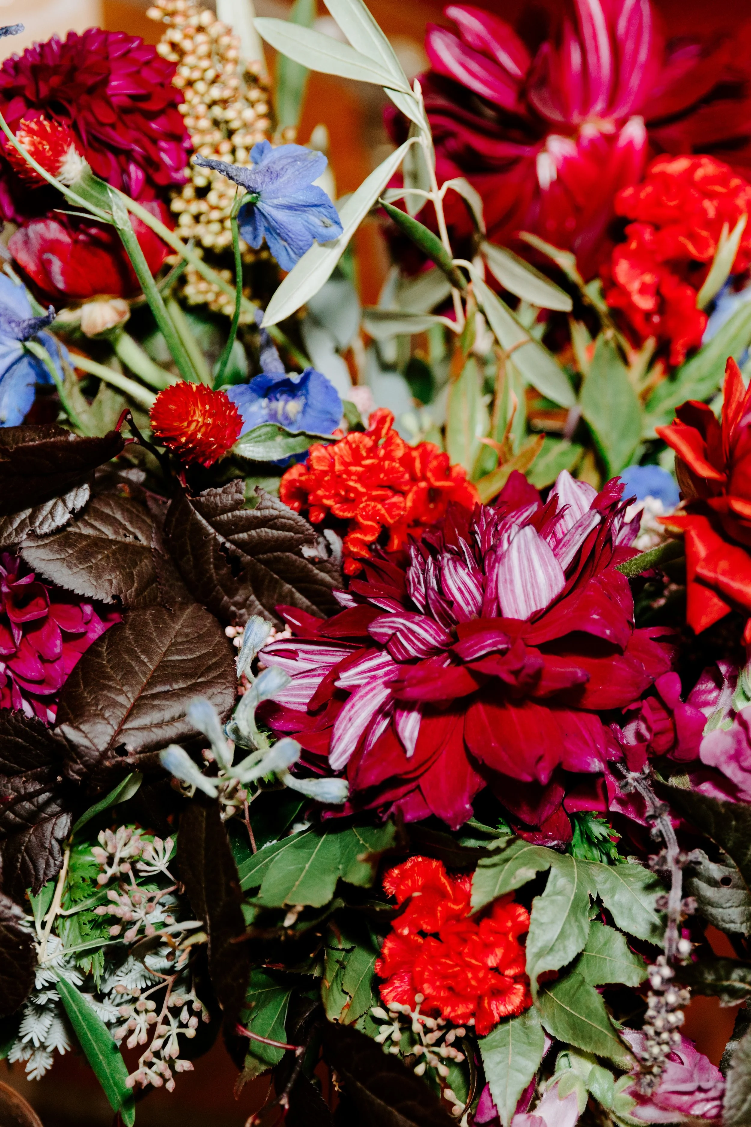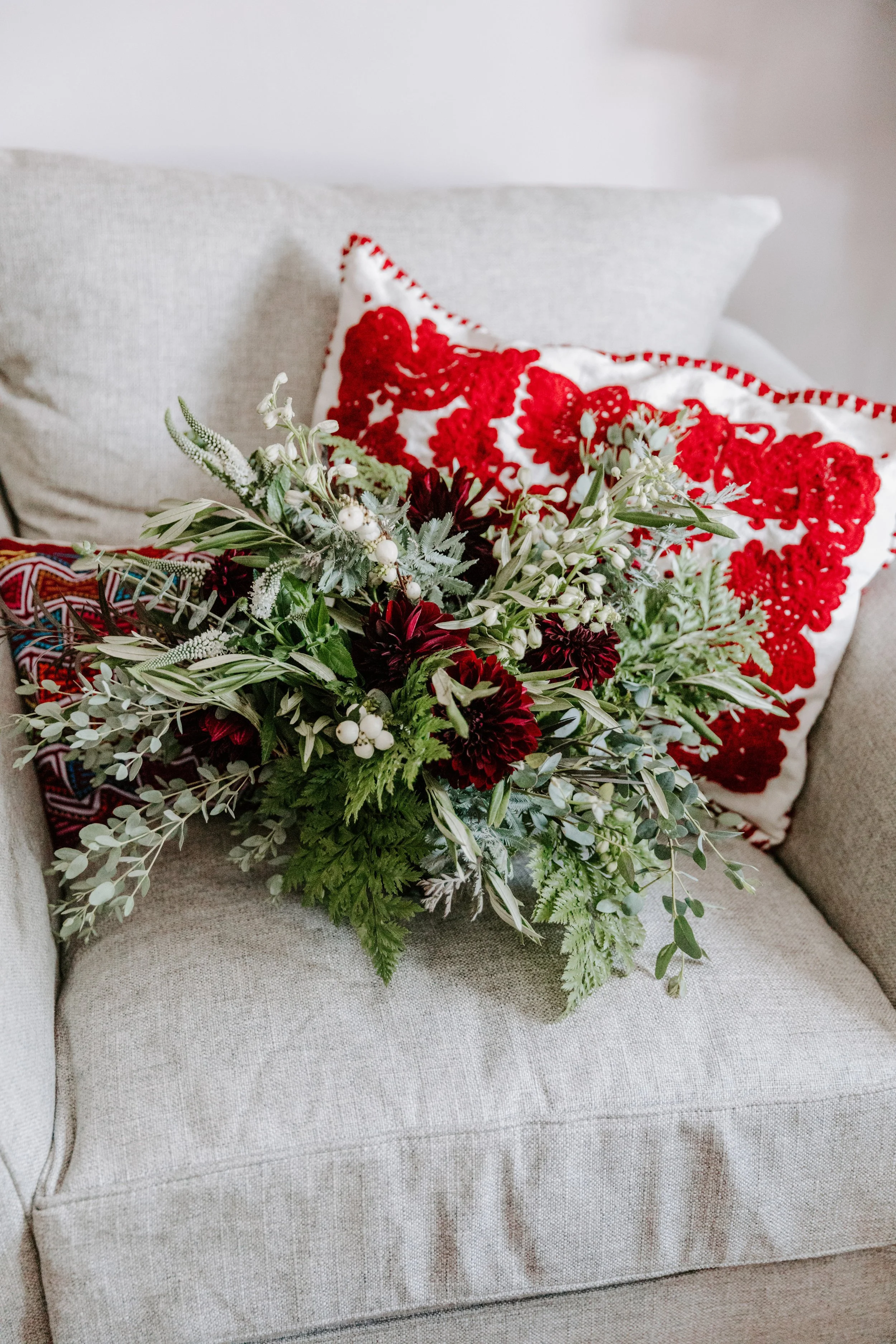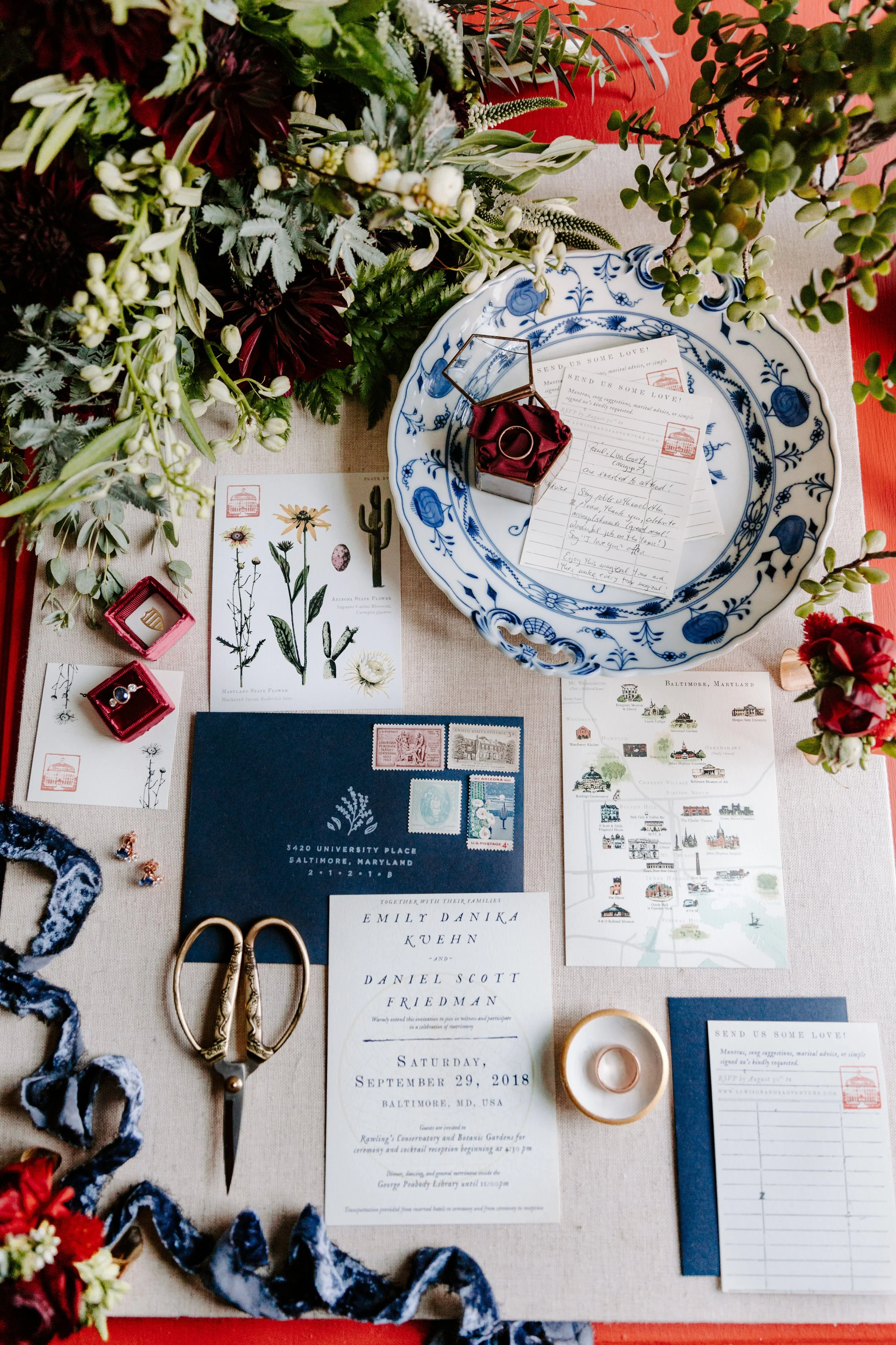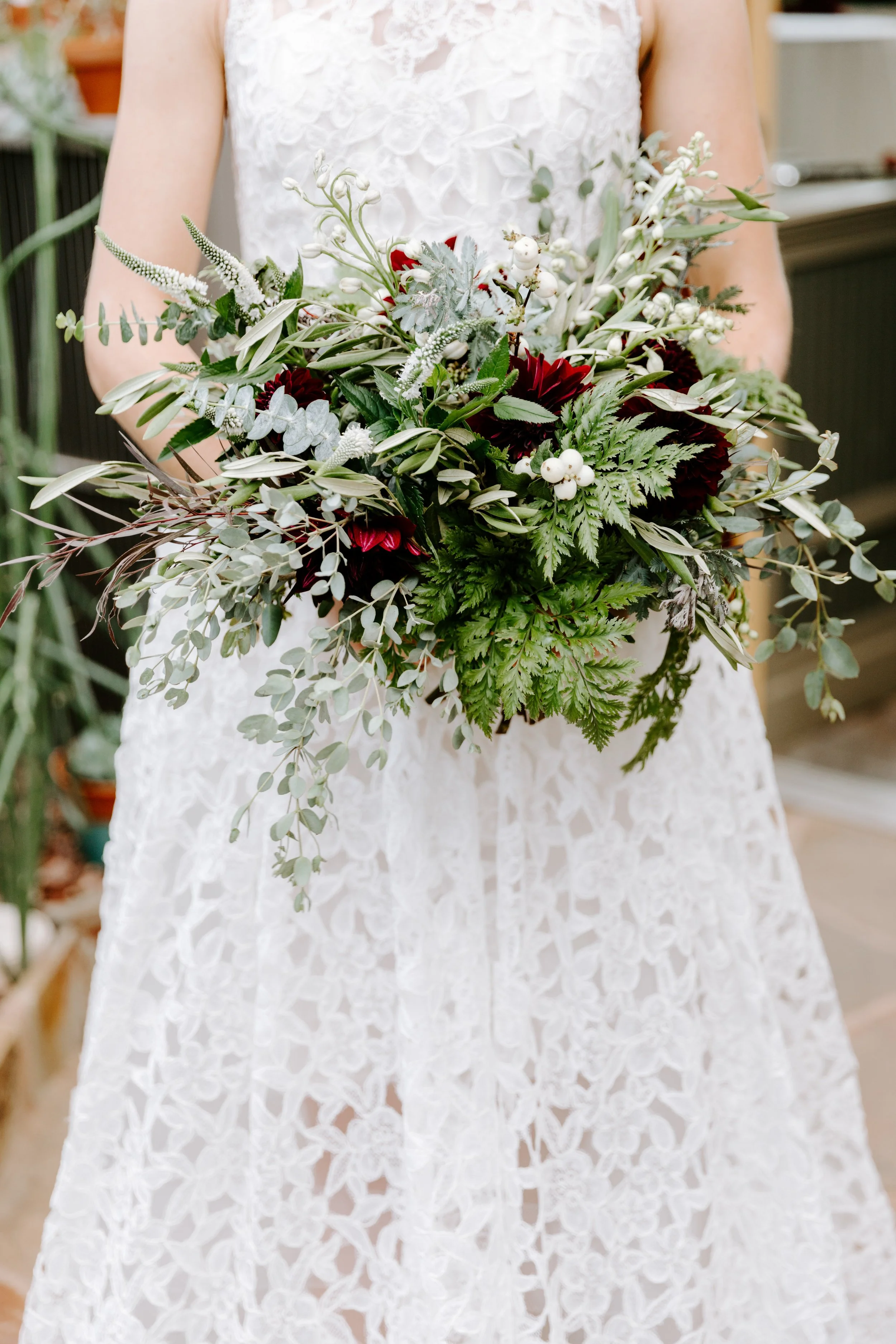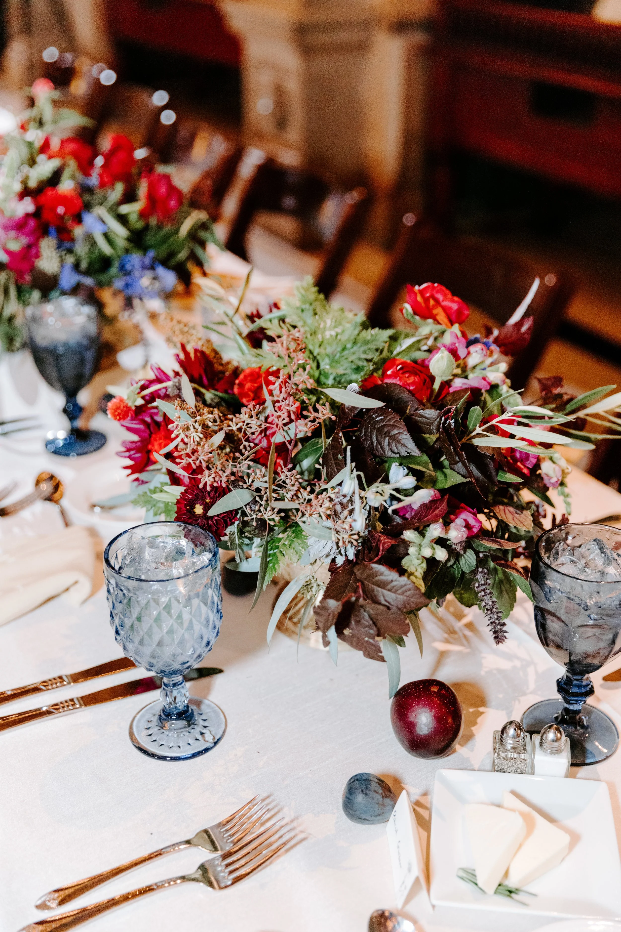 We sourced lots of interesting greenery for E + D’s Baltimore wedding, including lots of fresh herbs and olive branches that still had the olives on them. Emily wanted her bouquets to consist mainly of greenery, and only a few blooms. We really enjoyed designing these unique bouquets and centerpieces, if you look closely you will see the fresh figs and plums gathered at the bases of each centerpiece. This couples day was captured by Alicia Wiley Photography for Satin + Sage Events at the George Peabody Library.
