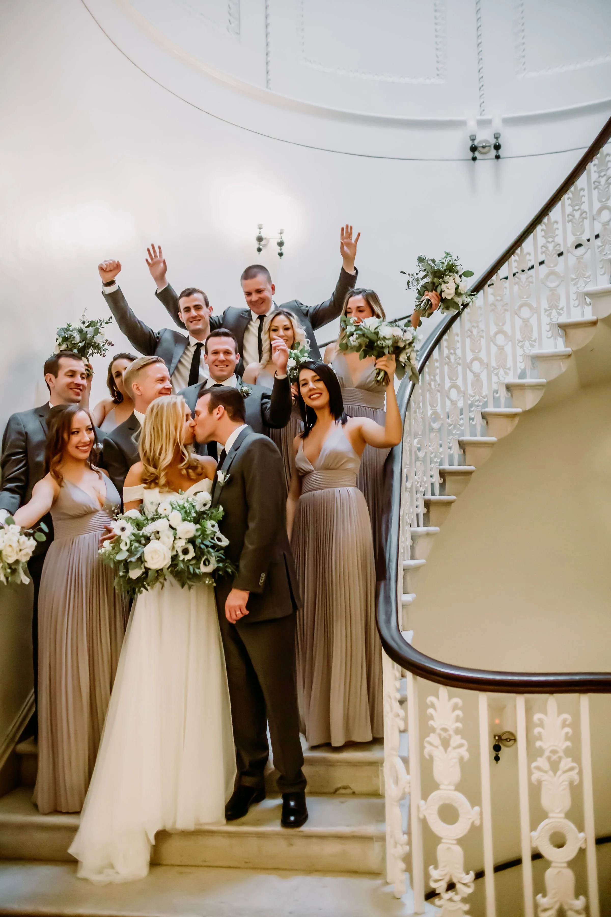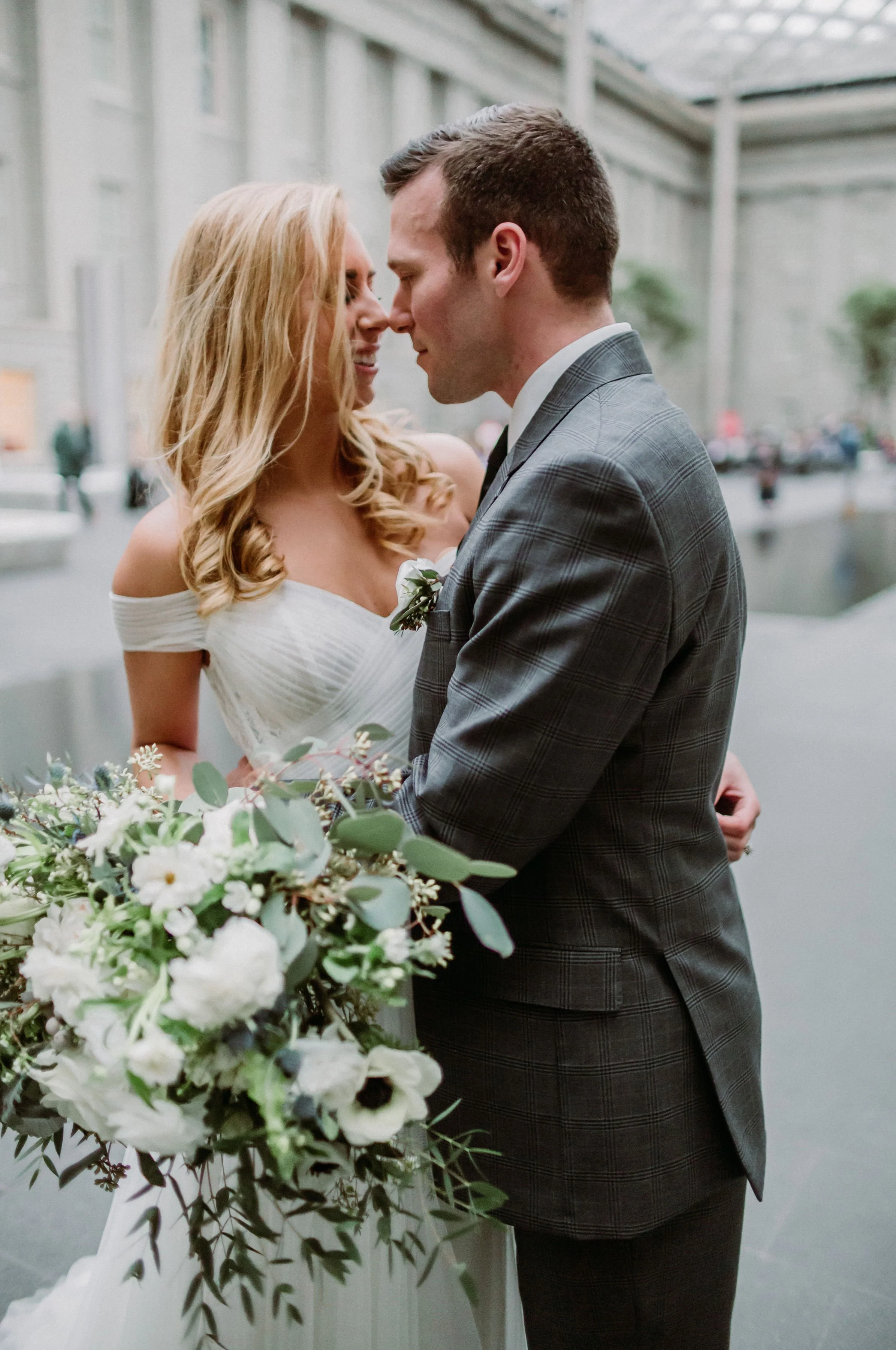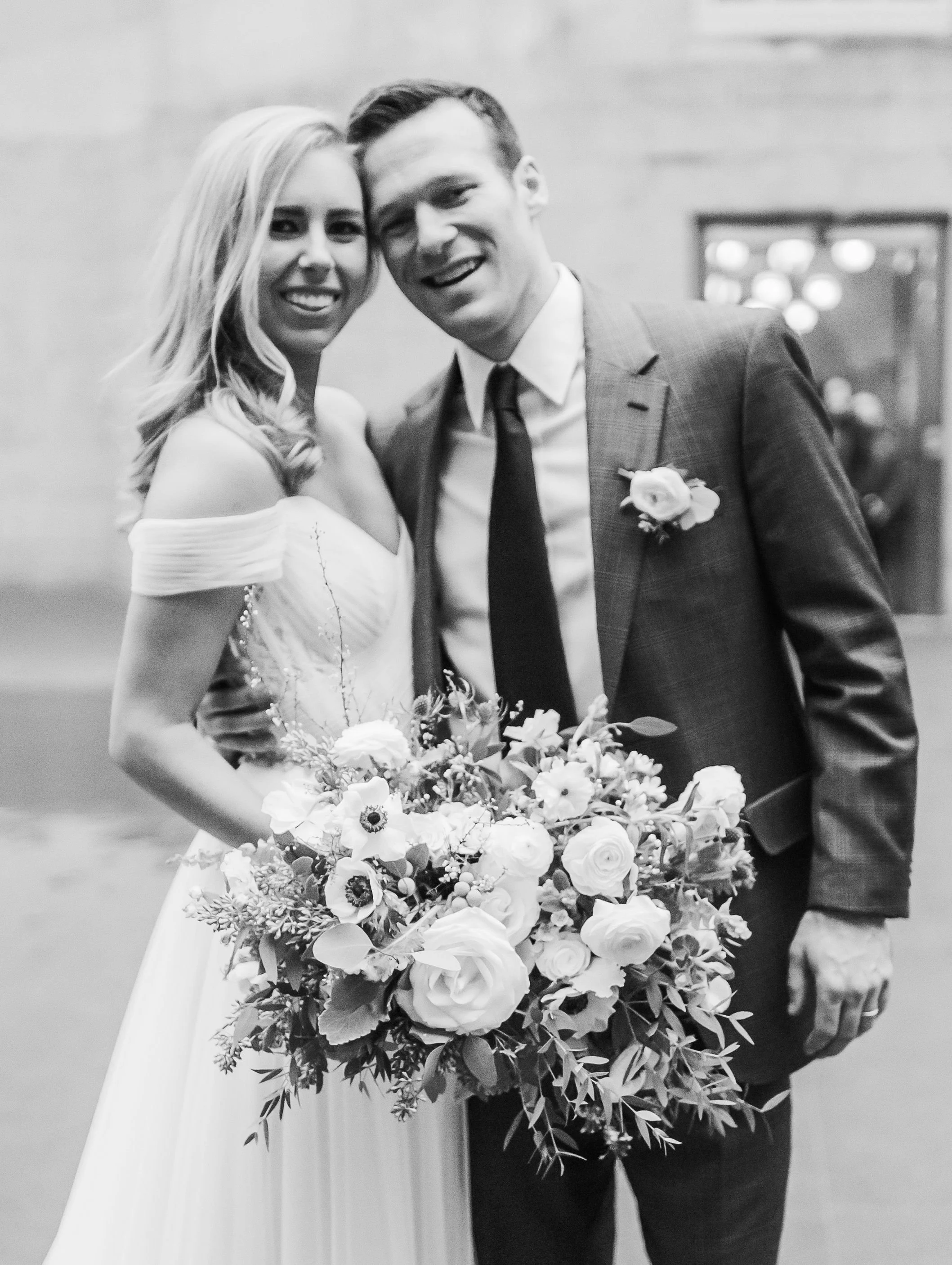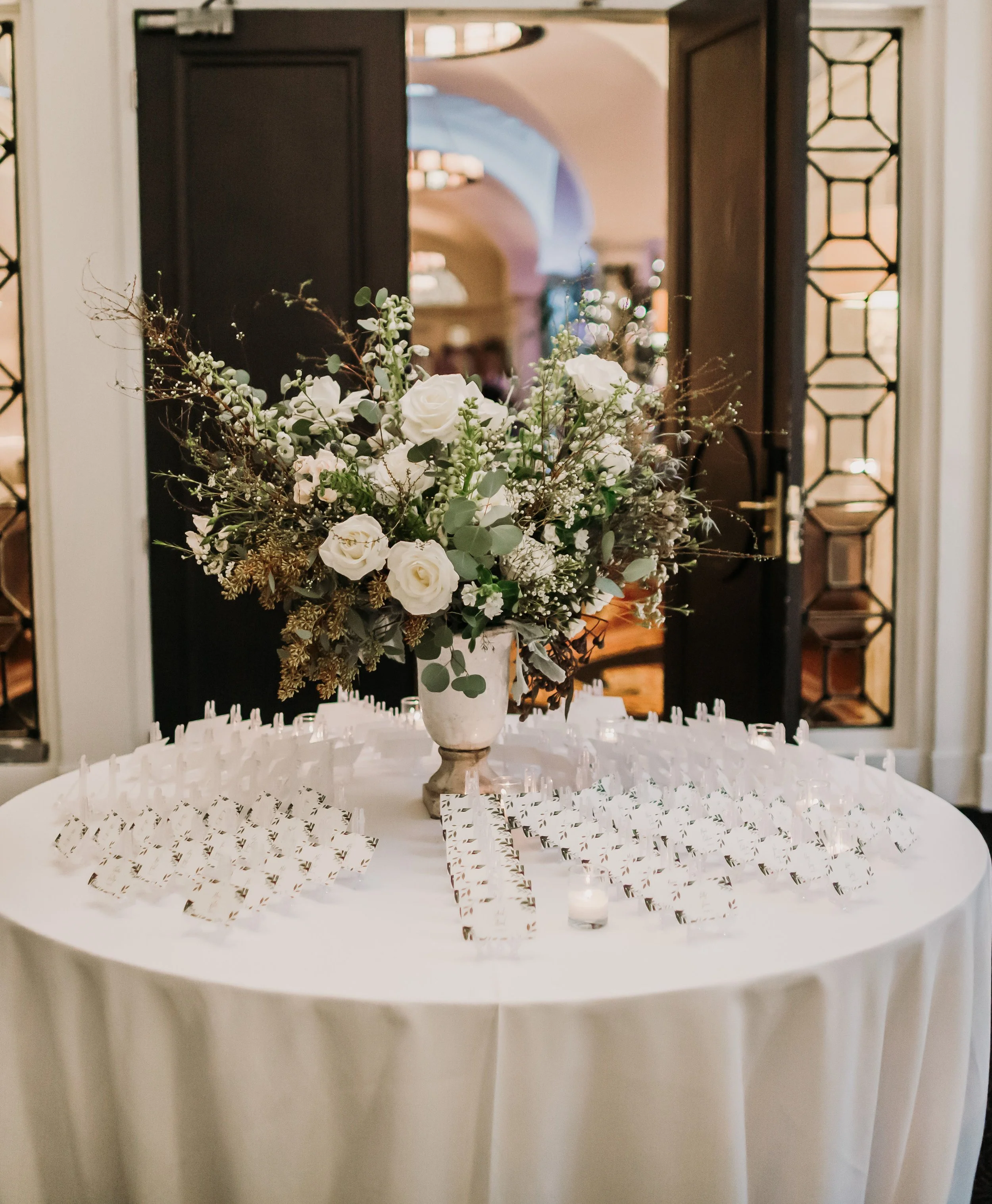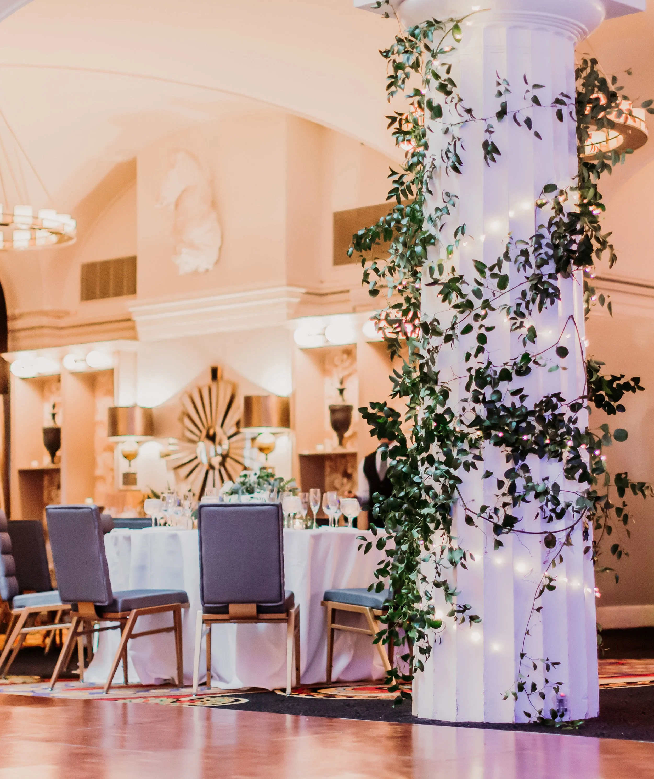 Sarah and Gerald were married at the Hotel Monaco in Washington DC this past February. Sarah was just the sweetest bride and we absolutely loved bringing her vision to life! We draped the four collums surounding the ceremony site in smilax and when the reception started they were lit up with fairy lights.. it was magical.