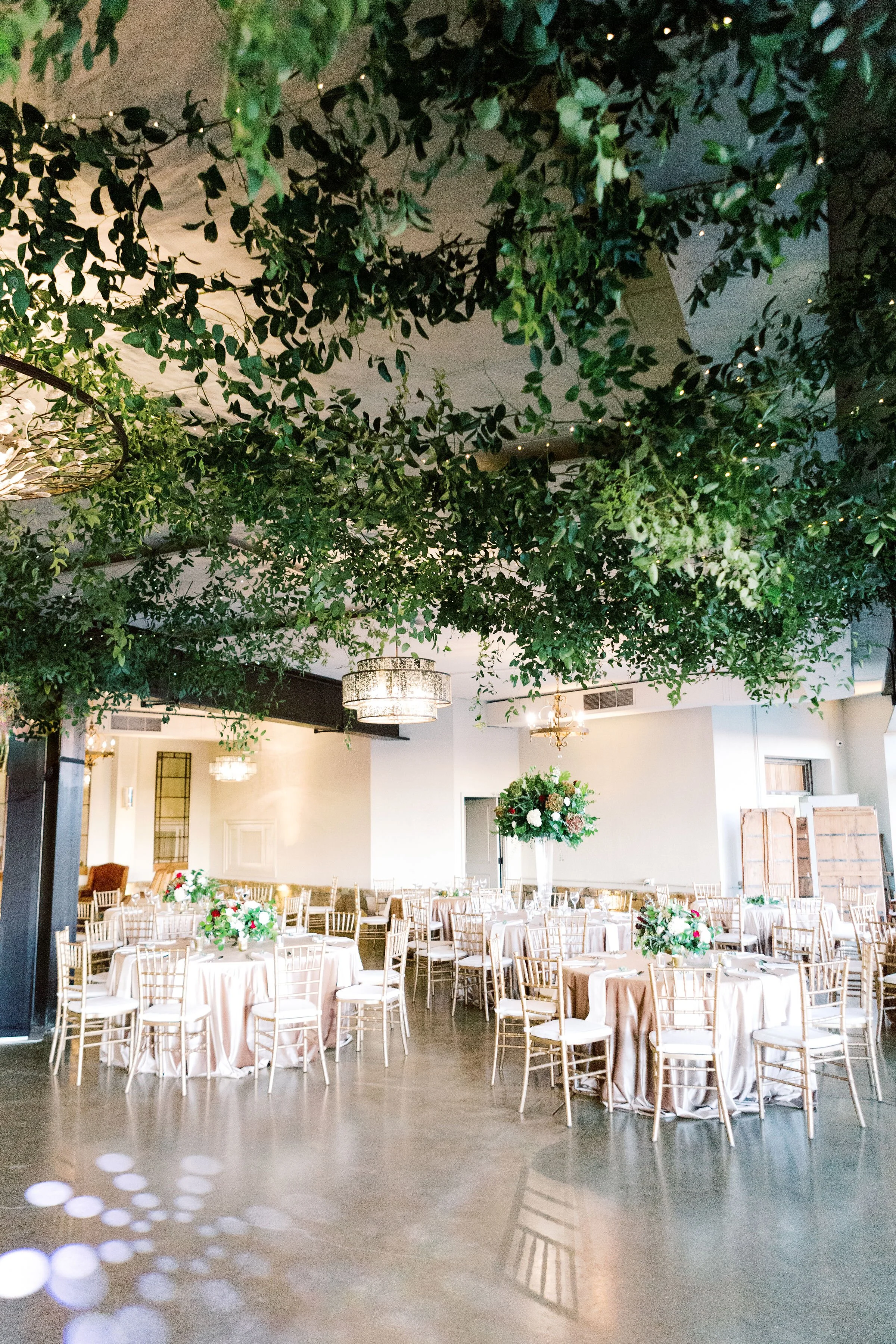 Jamie and Adam’s wedding took place on a brisk afternoon at Stone Tower Winery. They chose a classic wintry palette of white and burgundy. Their wedding celebration was warm, inviting, and filled with candles and greenery. We especially loved creating the dreamy canopy of hanging greenery and fairy lights for the reception space. Planned by Allison Barnes Events and photographed by Kir Tuben Photography.