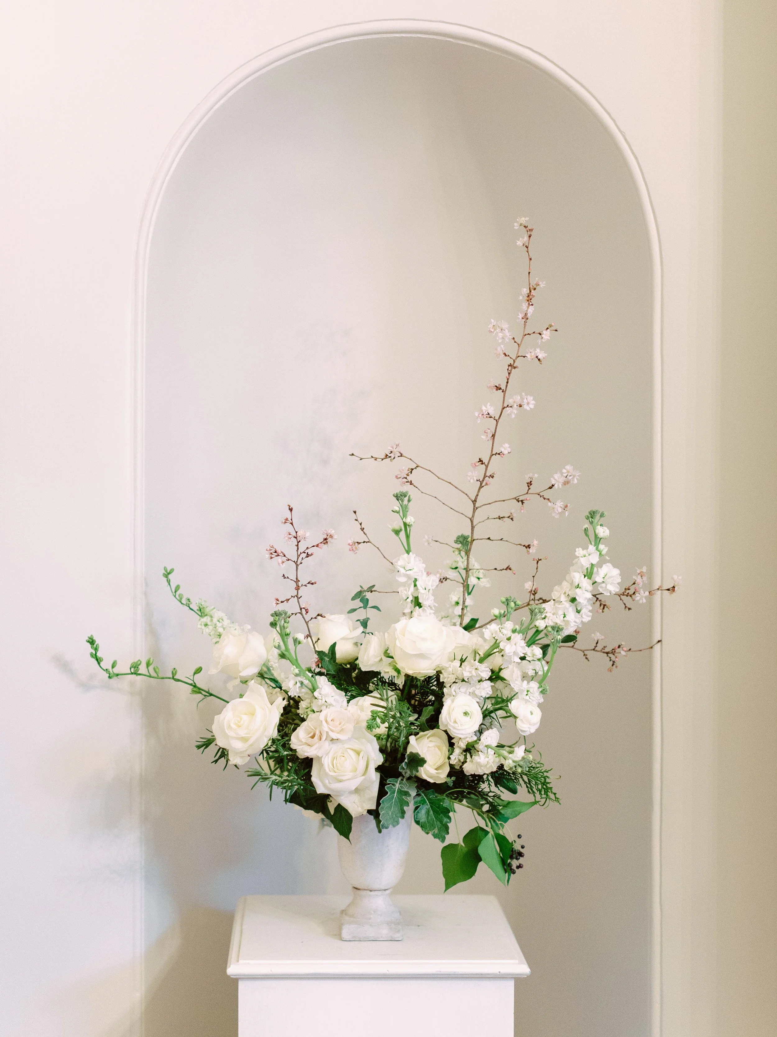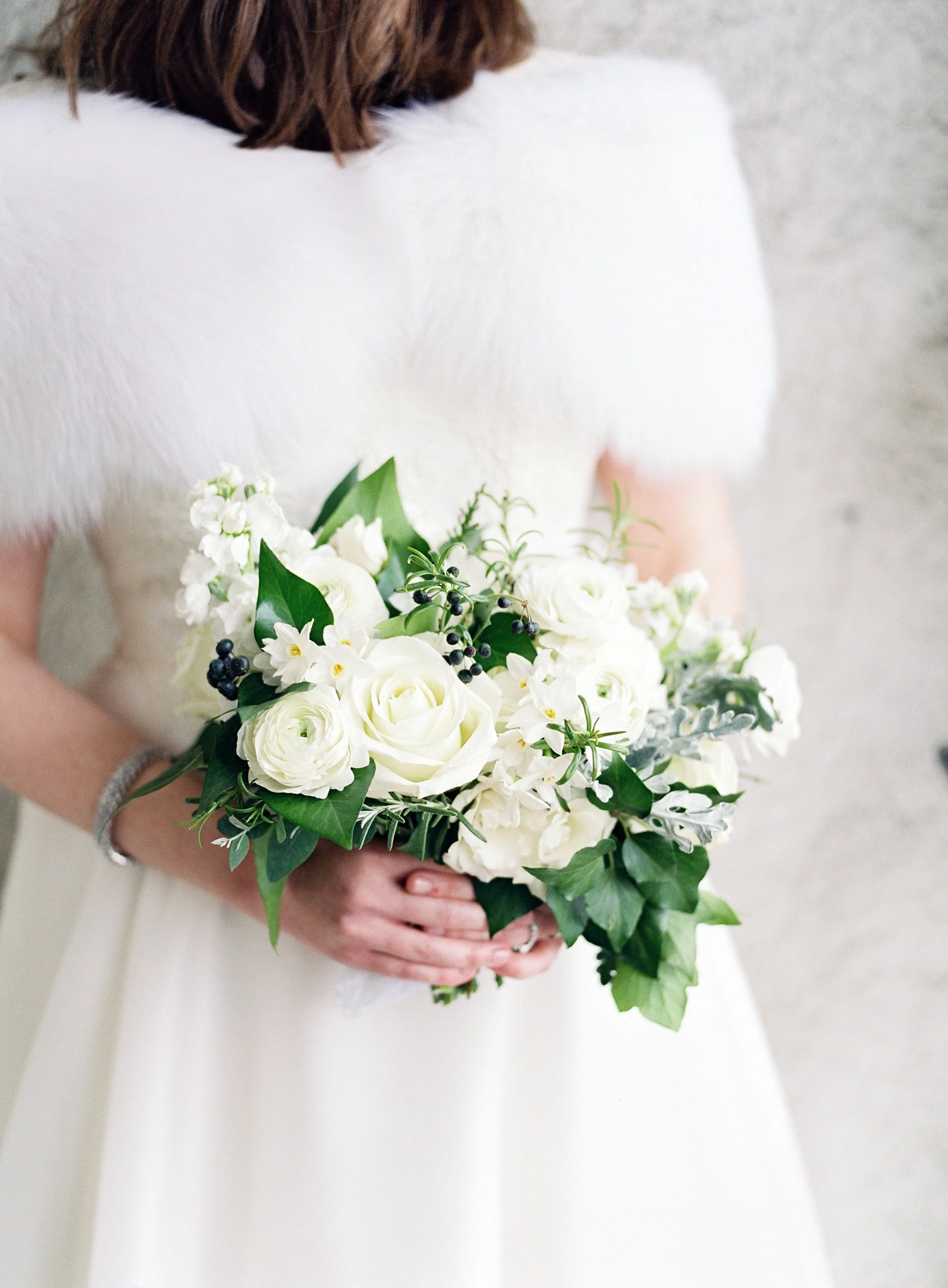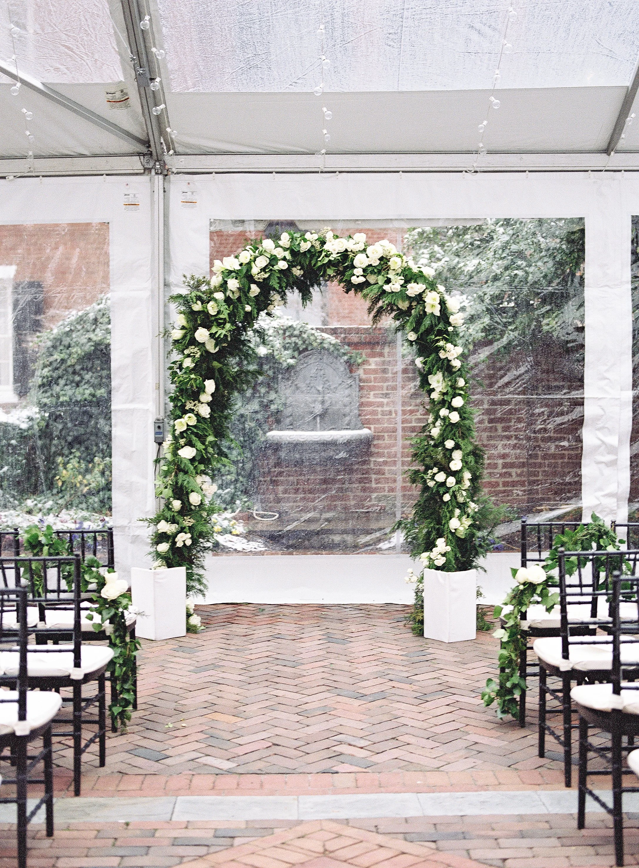 This Luxurious winter wedding at Decatur House in Washington DC was captured by Rachel May Photography for A. Dominick Events. We love the creamy blooms and bright greens that made up this stunning floral arch, as well as the cherry blossoms that brought some warmth into this chilly winter day.