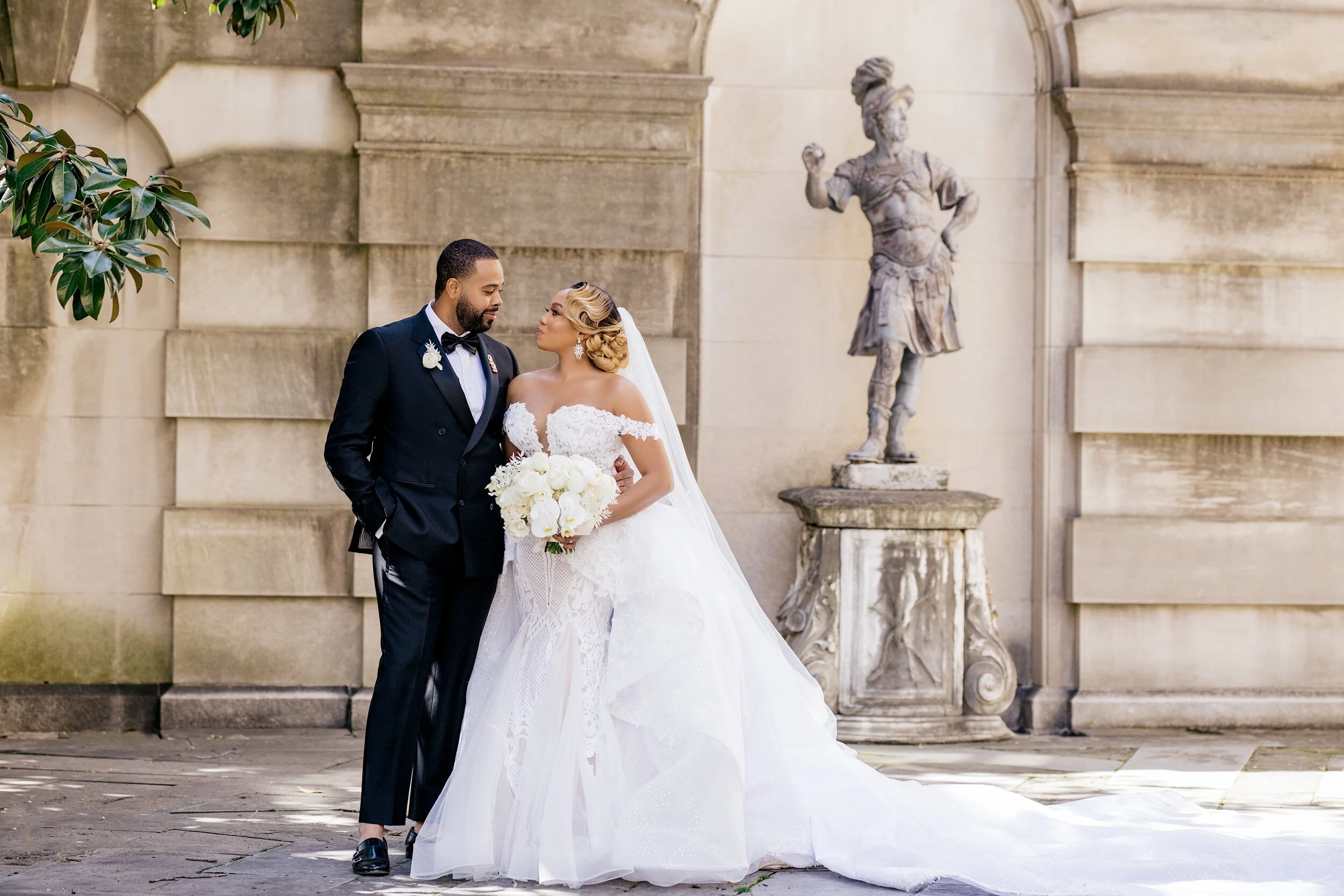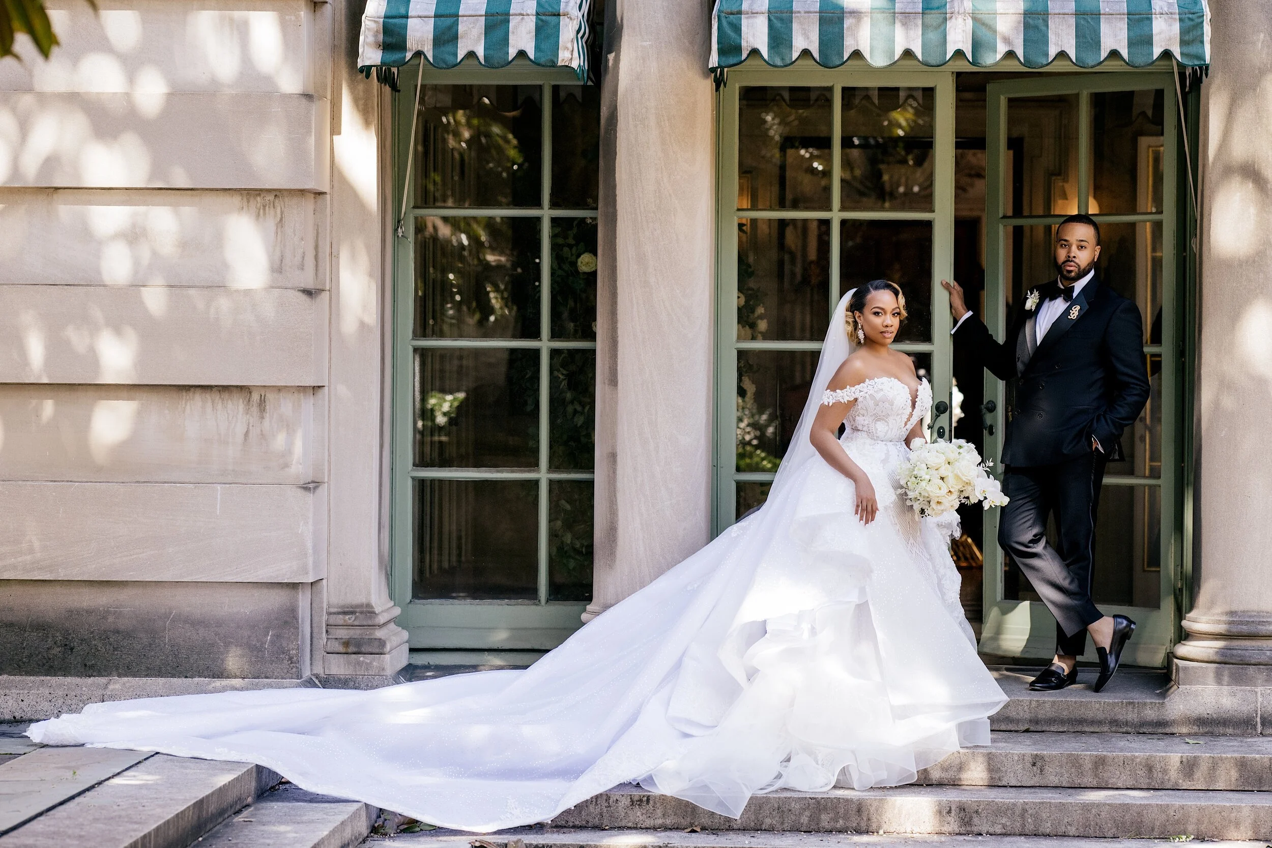 Sheidha + Brandon decided to hold their intimate ceremony at the ever elegant Larz Anderson House in Washington DC. A modern white bouquet with cascading orchids and a striking illusion arbor in the ornate hallway at Anderson were perfect complements. This wedding was featured in Essence Magazine.