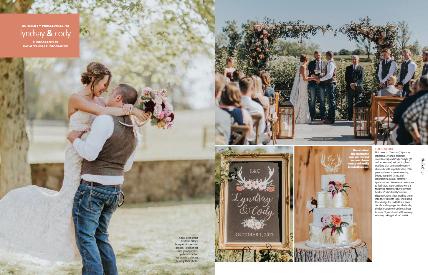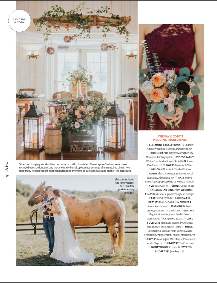 Lyndsay + Cody’s fall wedding at Shadow Creek Weddings and Events was recently printed in The Knot DC, Maryland and Virginia Fall 2018 edition. This couple had a rustic but elegant vision that we enjoyed bringing to life. The day was captured by Hay Alexandra Photography for Elegant Momentz and Laura Dee Events.