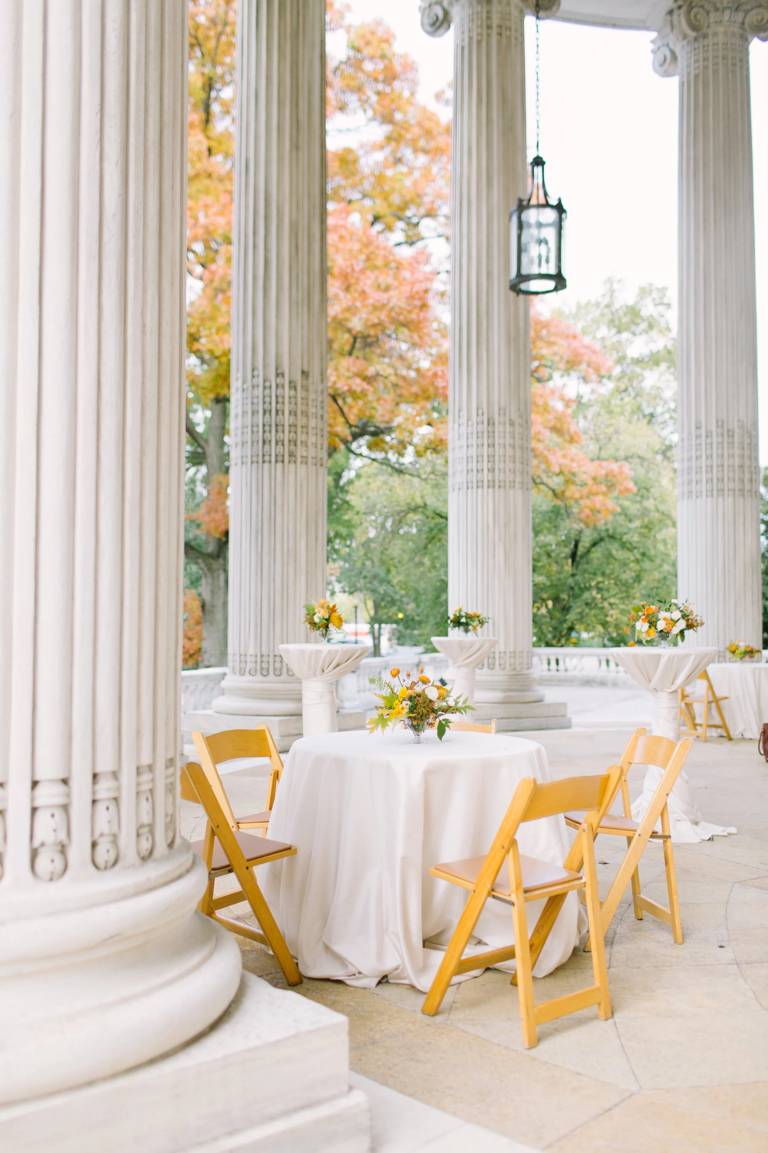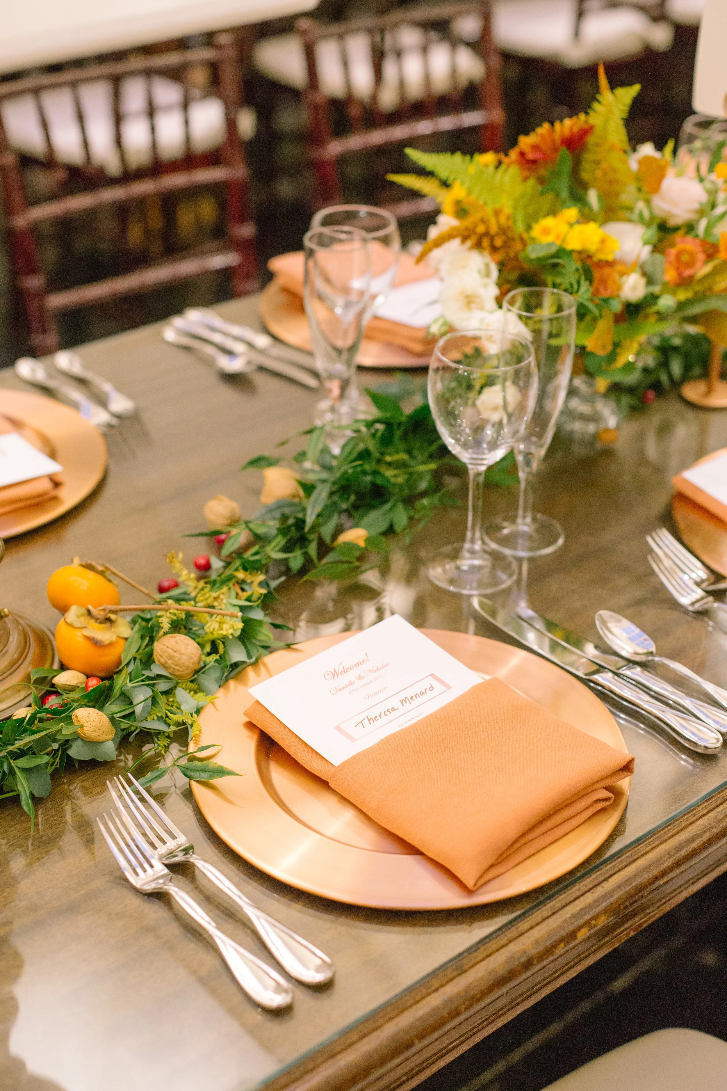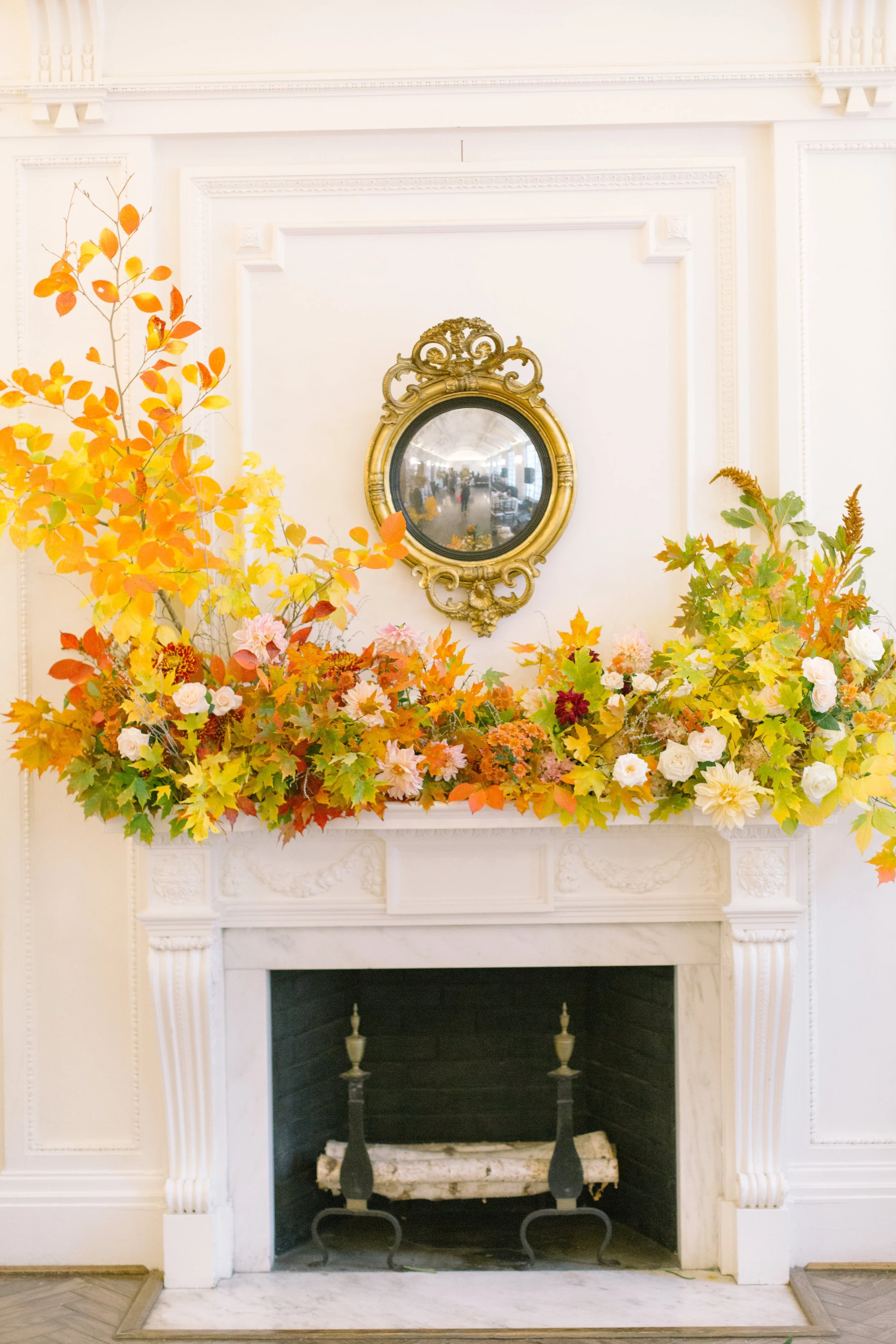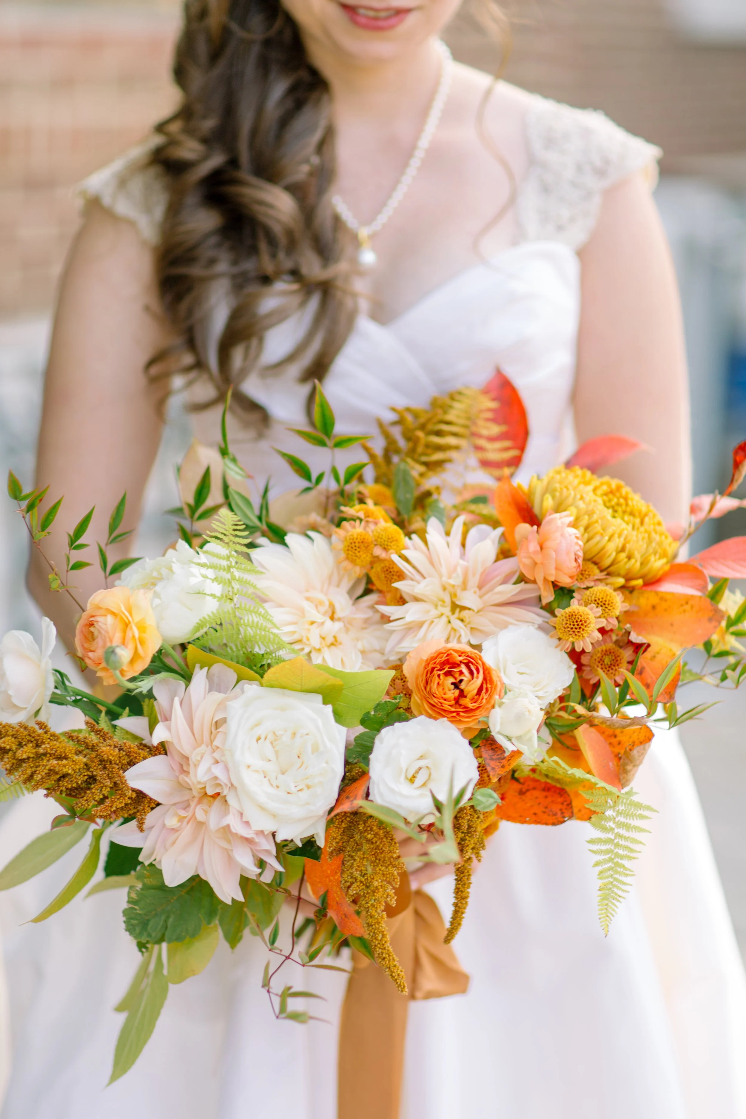 Danielle + Nick gave us so much creative freedom with their autumn wedding flowers! We had a great time bringing their vision to life. We even custom dyed copper silk ribbon, which was used throughout the ceremony and reception. The mantle at DAR Library is iconic and one our favorites to flower.