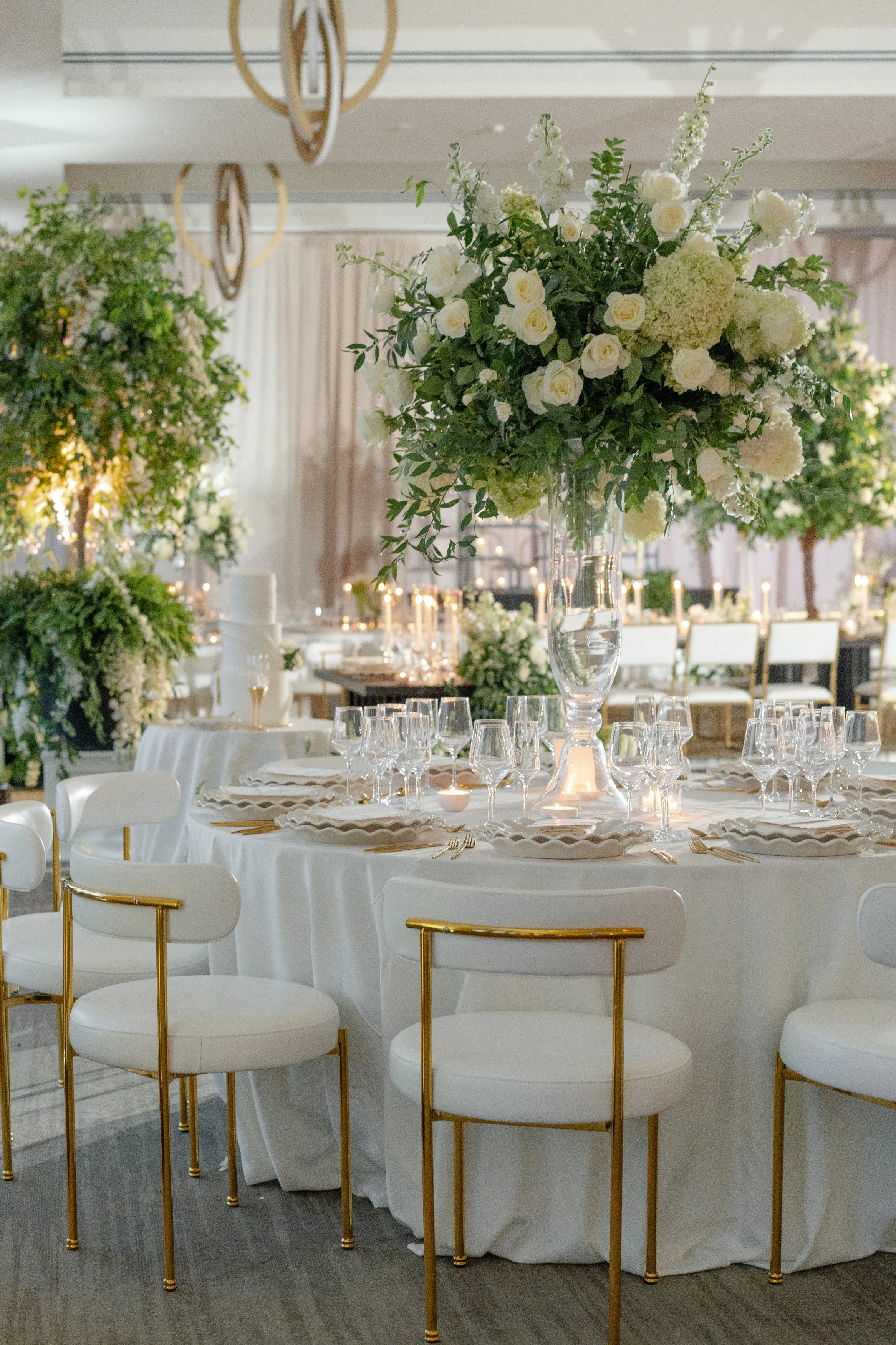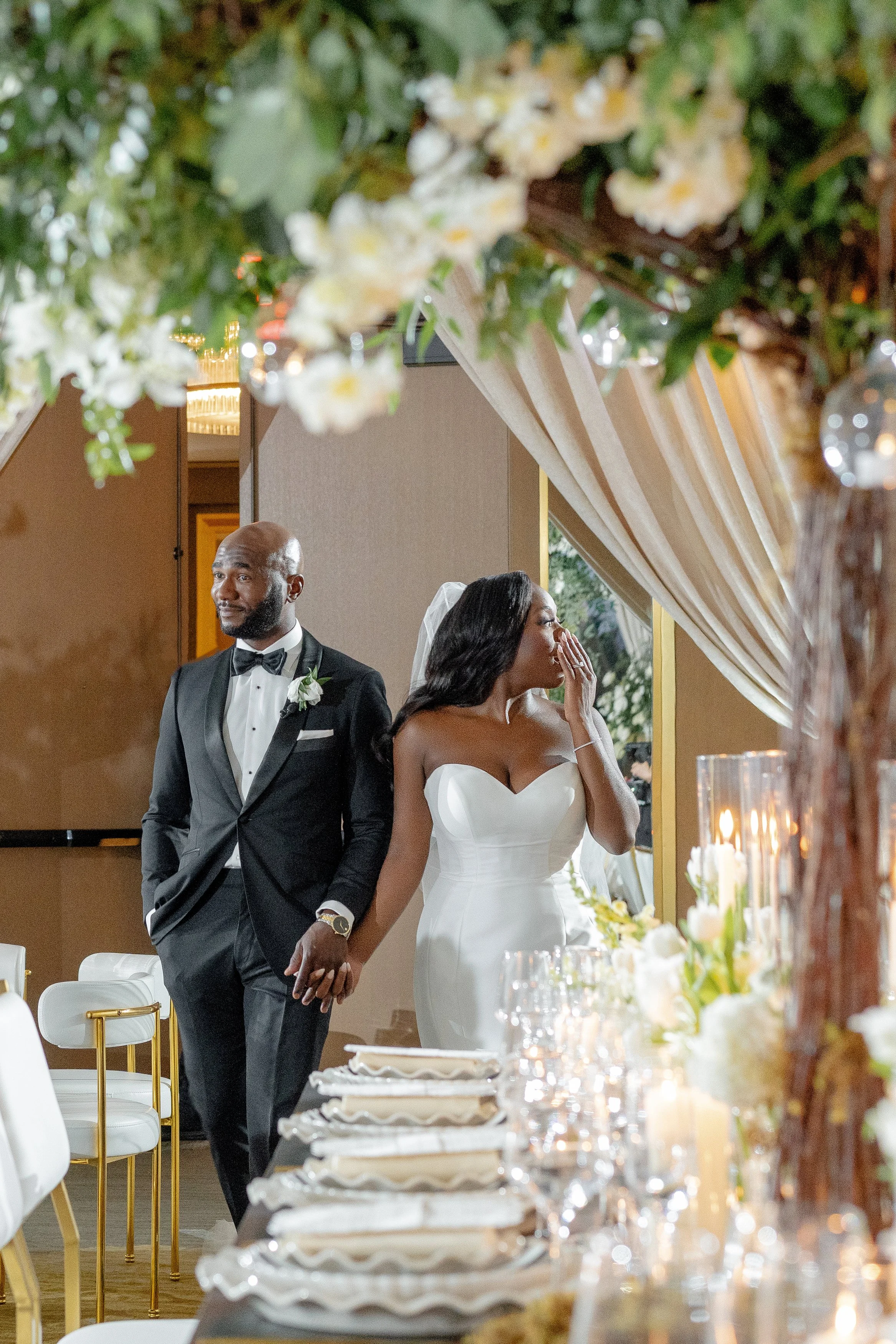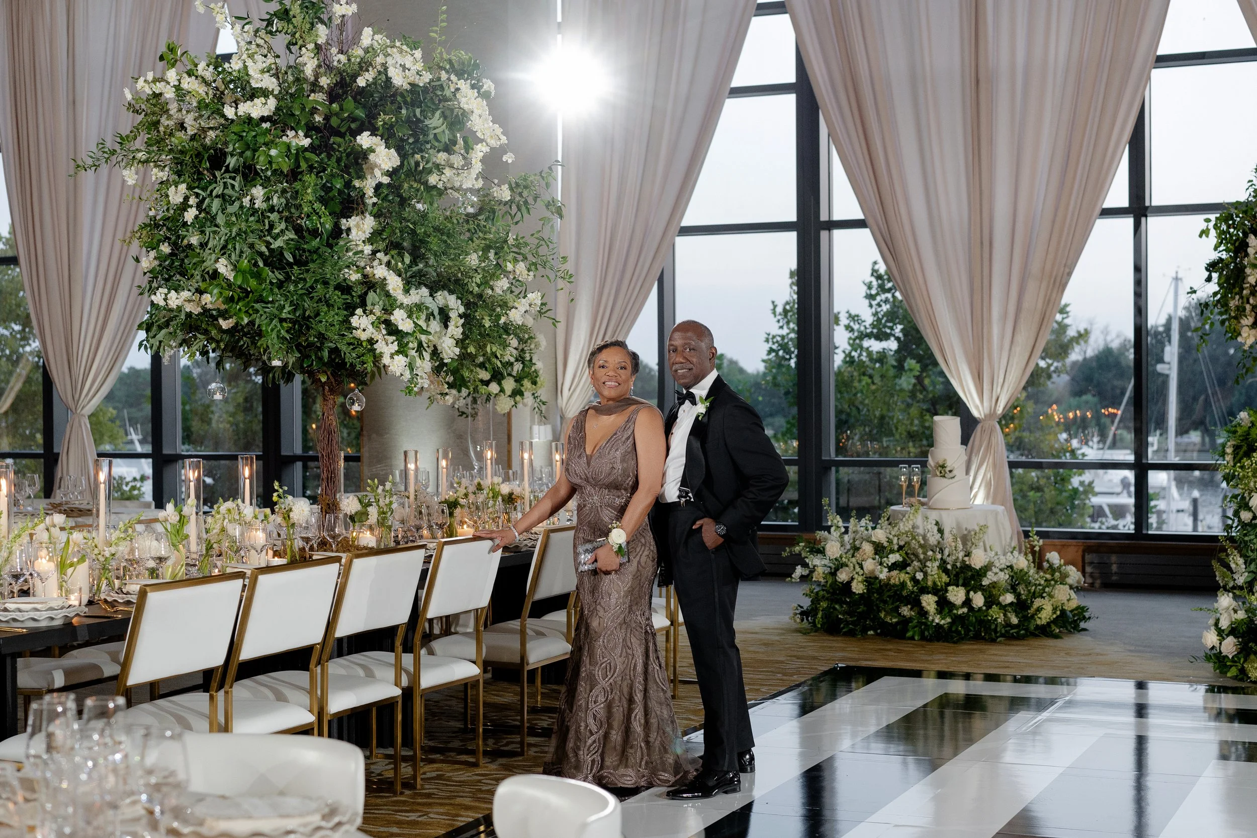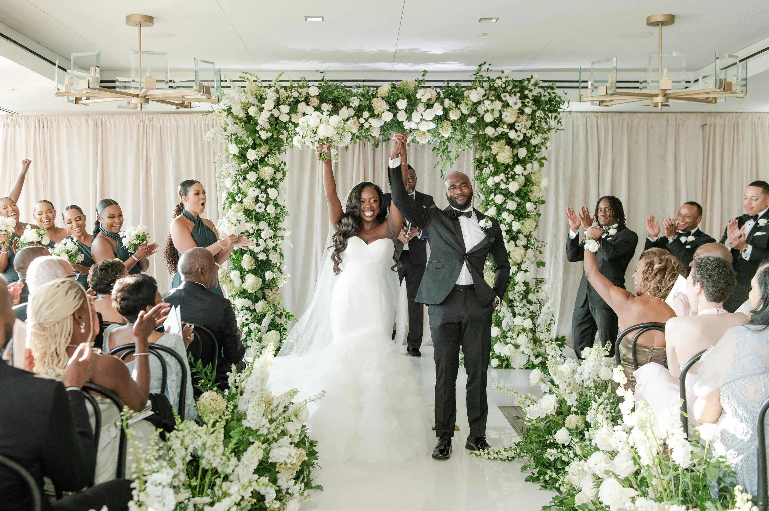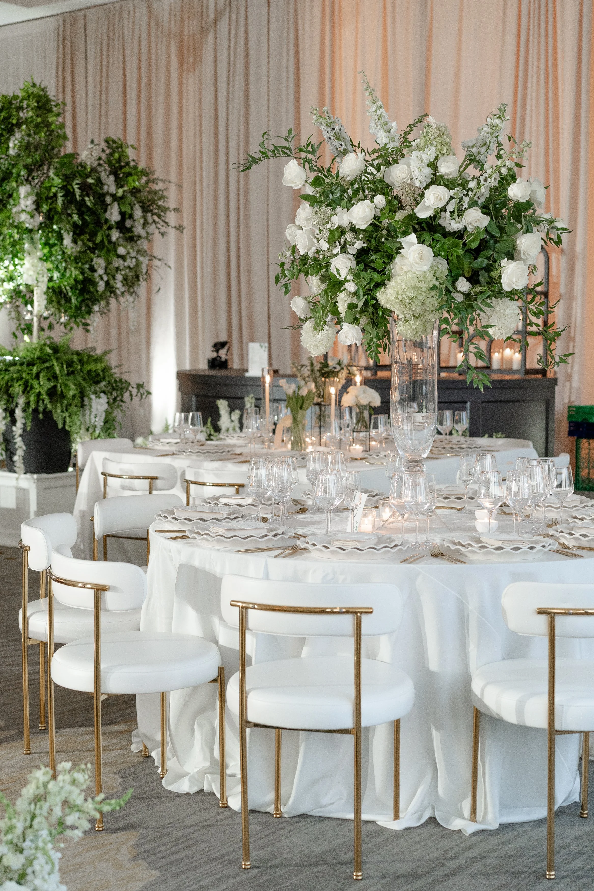 Courtney + Sheldon’s wedding at the InterContinental Washington D.C. embraced a timeless white and green color palette, creating an ambiance of refined sophistication. The aisle, adorned with lush floral arrangements and framed by a stunning floral arch, set the stage for the couple's breathtaking ceremony. The reception continued the luxurious theme with towering centerpieces and candlelit tables, perfectly complementing the serene and romantic atmosphere. Planning by B Astonished Events and photography by Terri Baskin Photography.