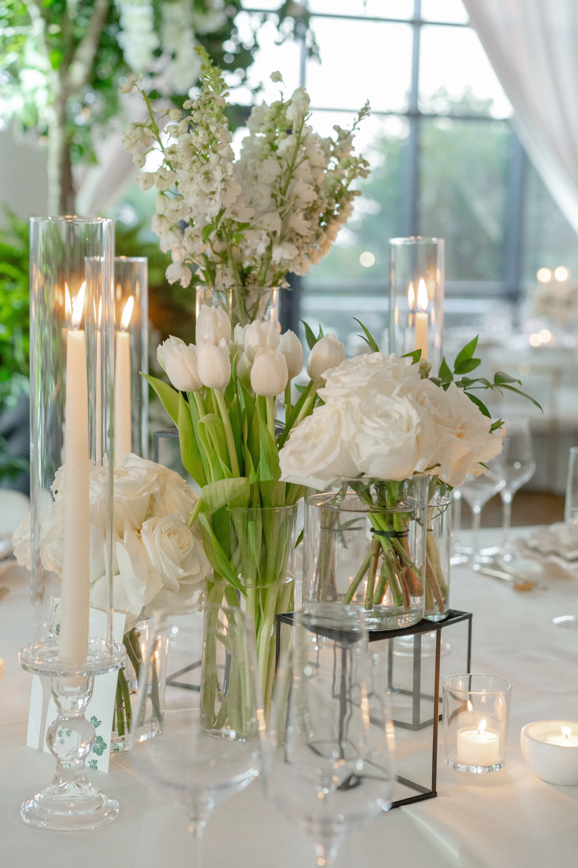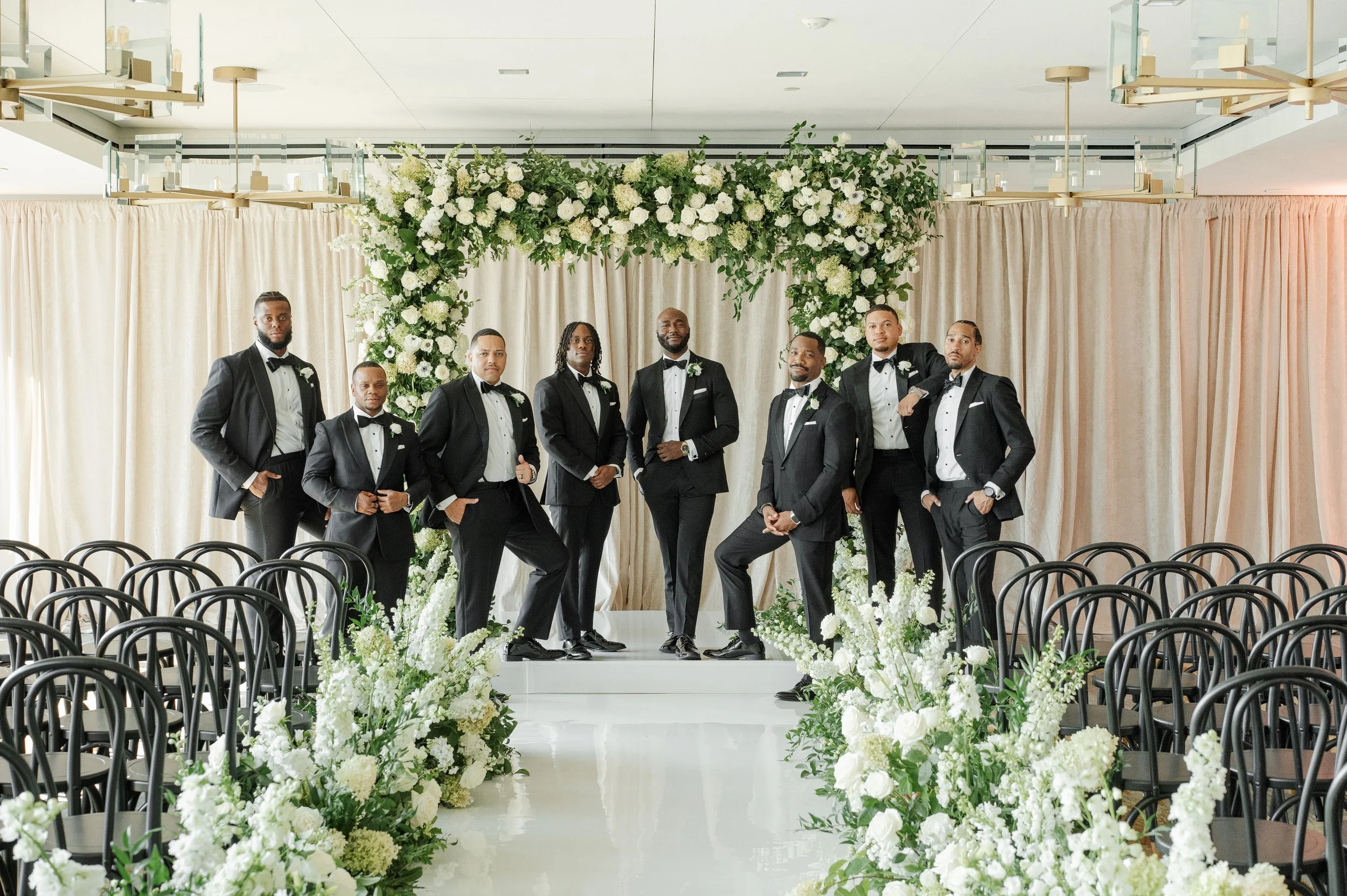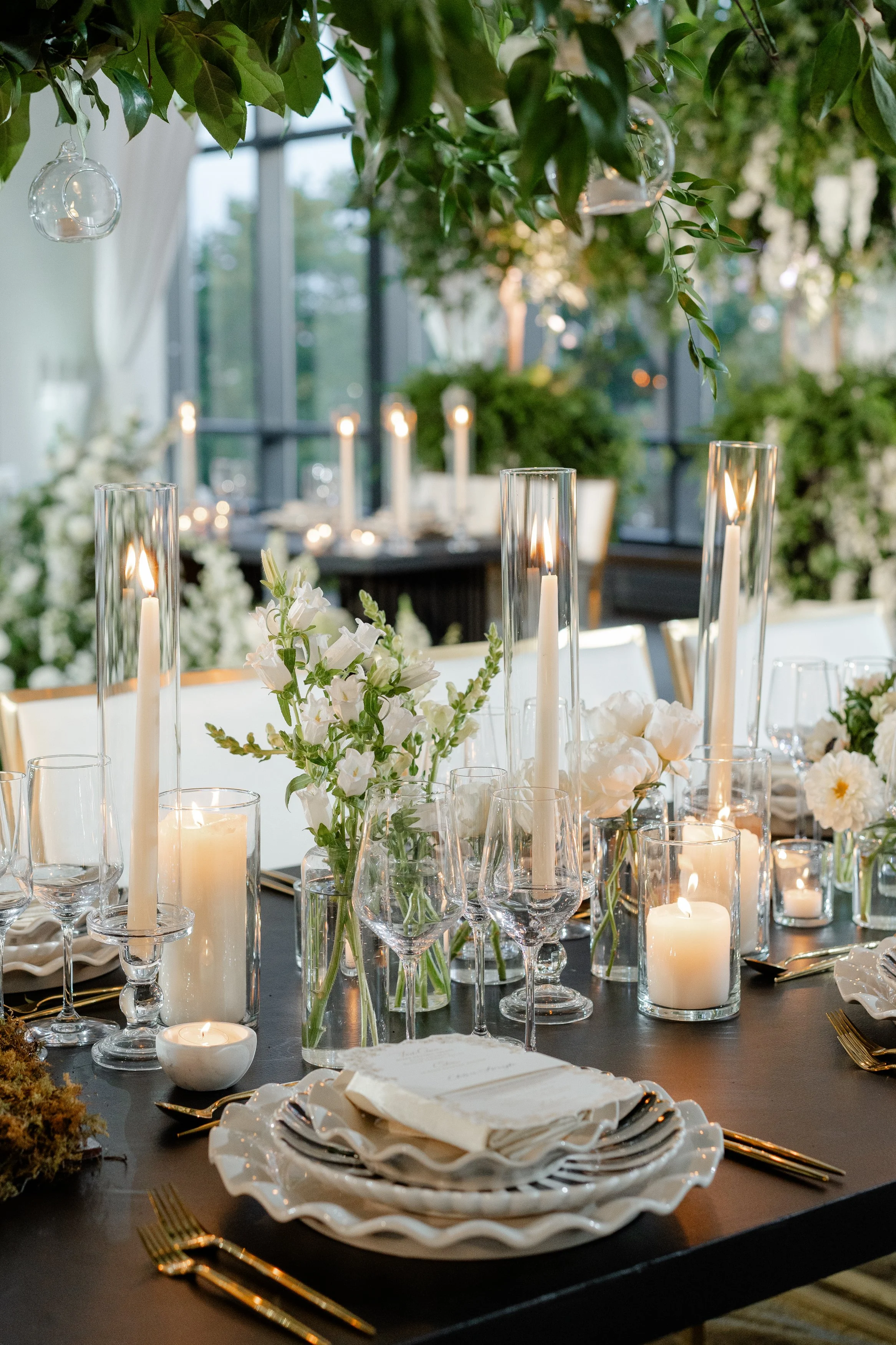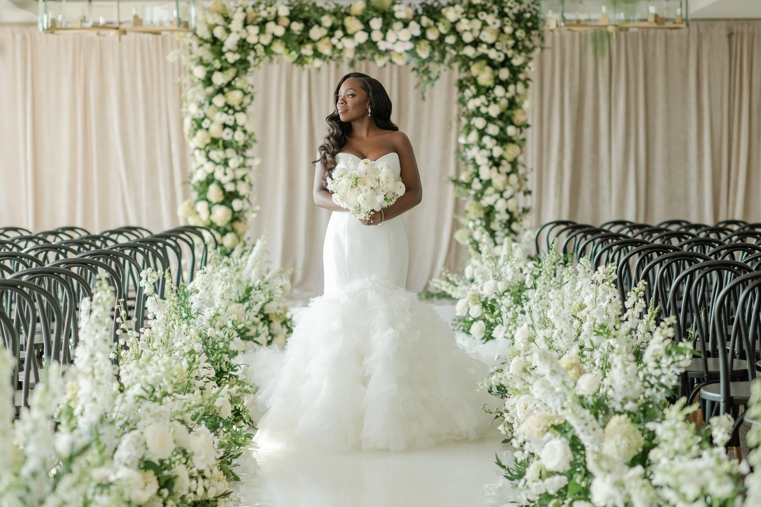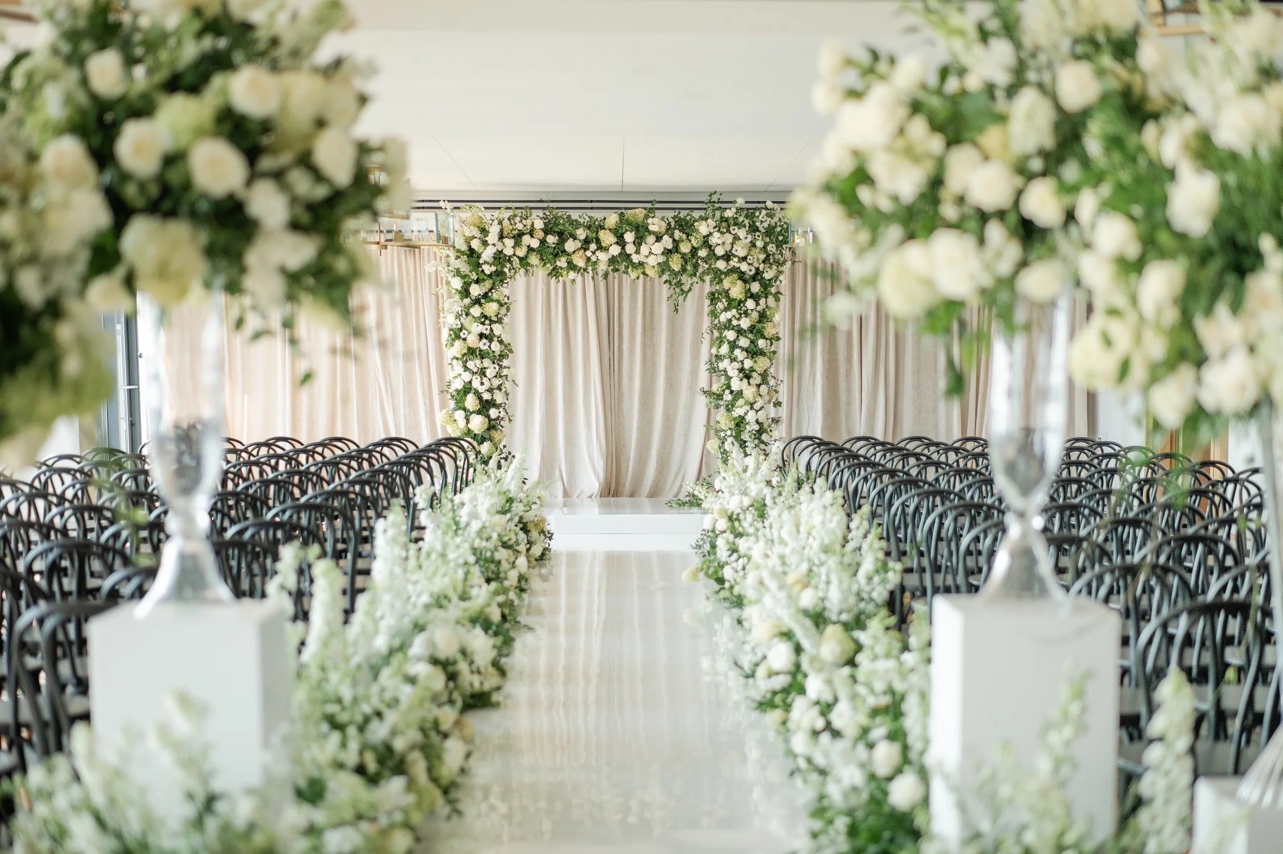 Courtney + Sheldon’s wedding at the InterContinental Washington D.C. embraced a timeless white and green color palette, creating an ambiance of refined sophistication. The aisle, adorned with lush floral arrangements and framed by a stunning floral arch, set the stage for the couple's breathtaking ceremony. The reception continued the luxurious theme with towering centerpieces and candlelit tables, perfectly complementing the serene and romantic atmosphere. Planning by B Astonished Events and photography by Terri Baskin Photography.
