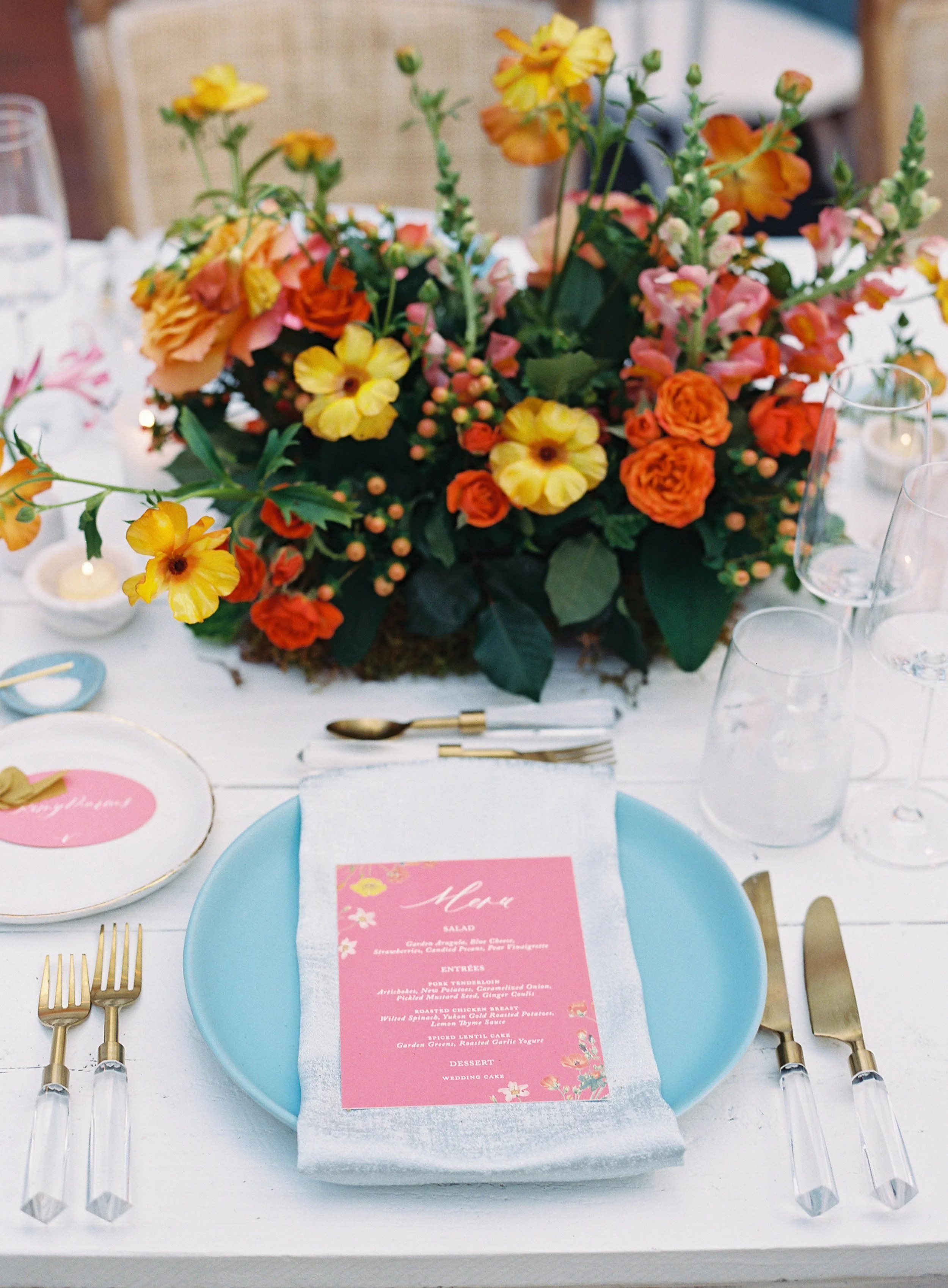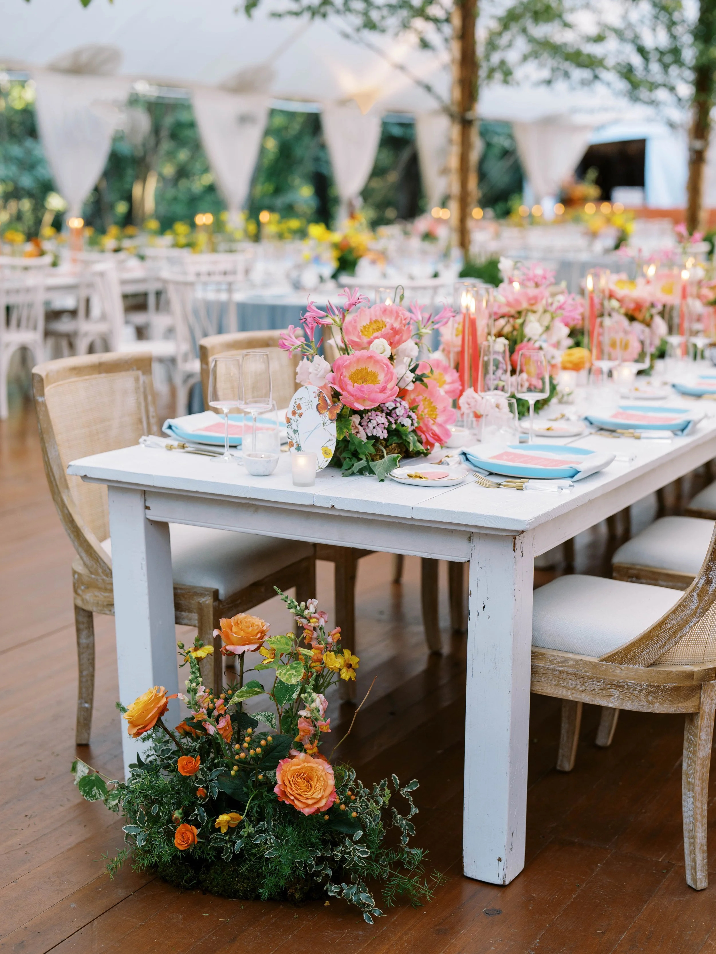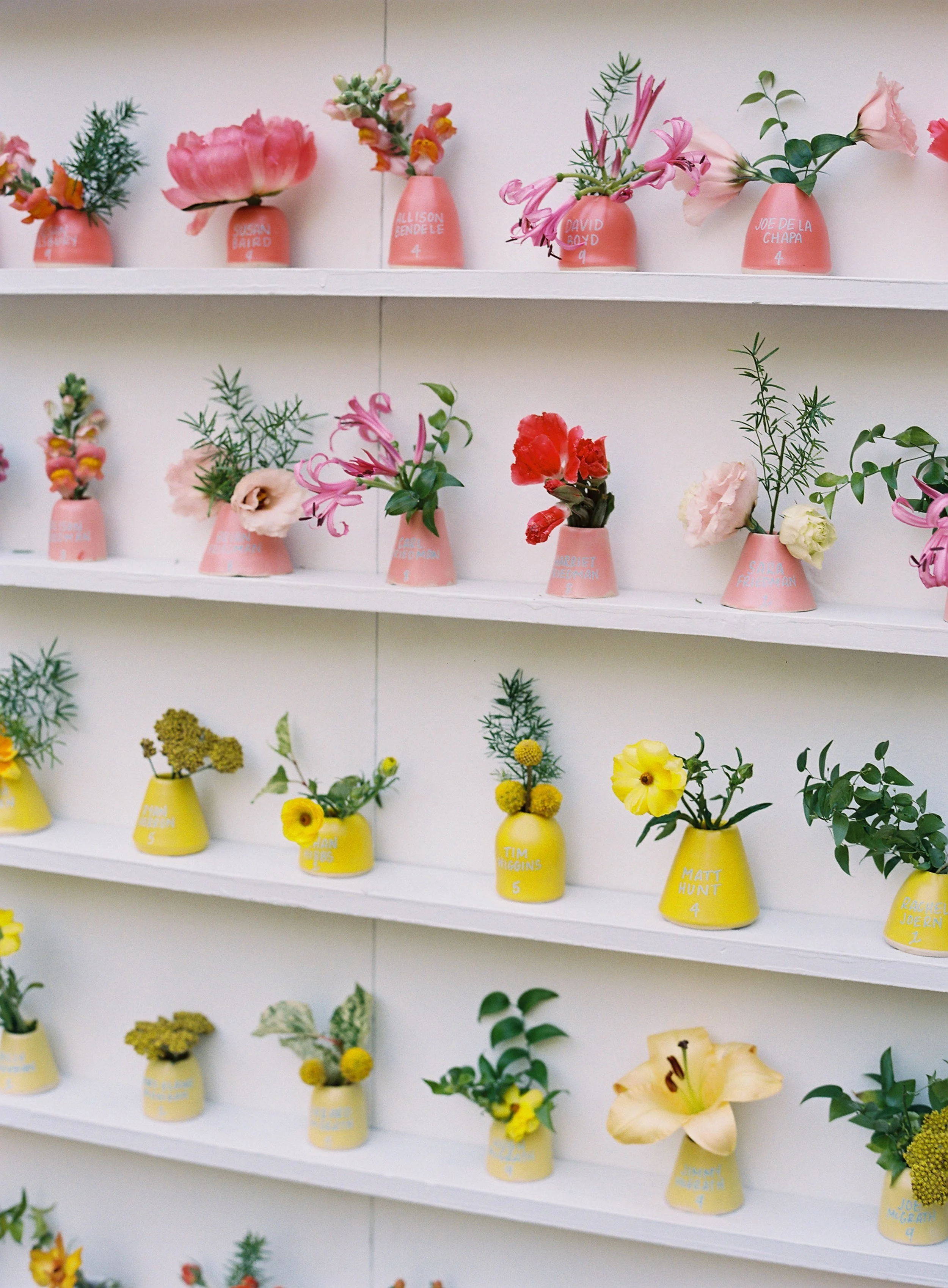 Emily and Brian’s colorful wedding incorporated fun pops of cheerful pinks, corals, and yellows. We loved helping to create that huge escort display filled with bud vases and were in awe the way those trees transformed the space. Planning by Kim Newton Weddings and photography by Ashley Cox Photography.