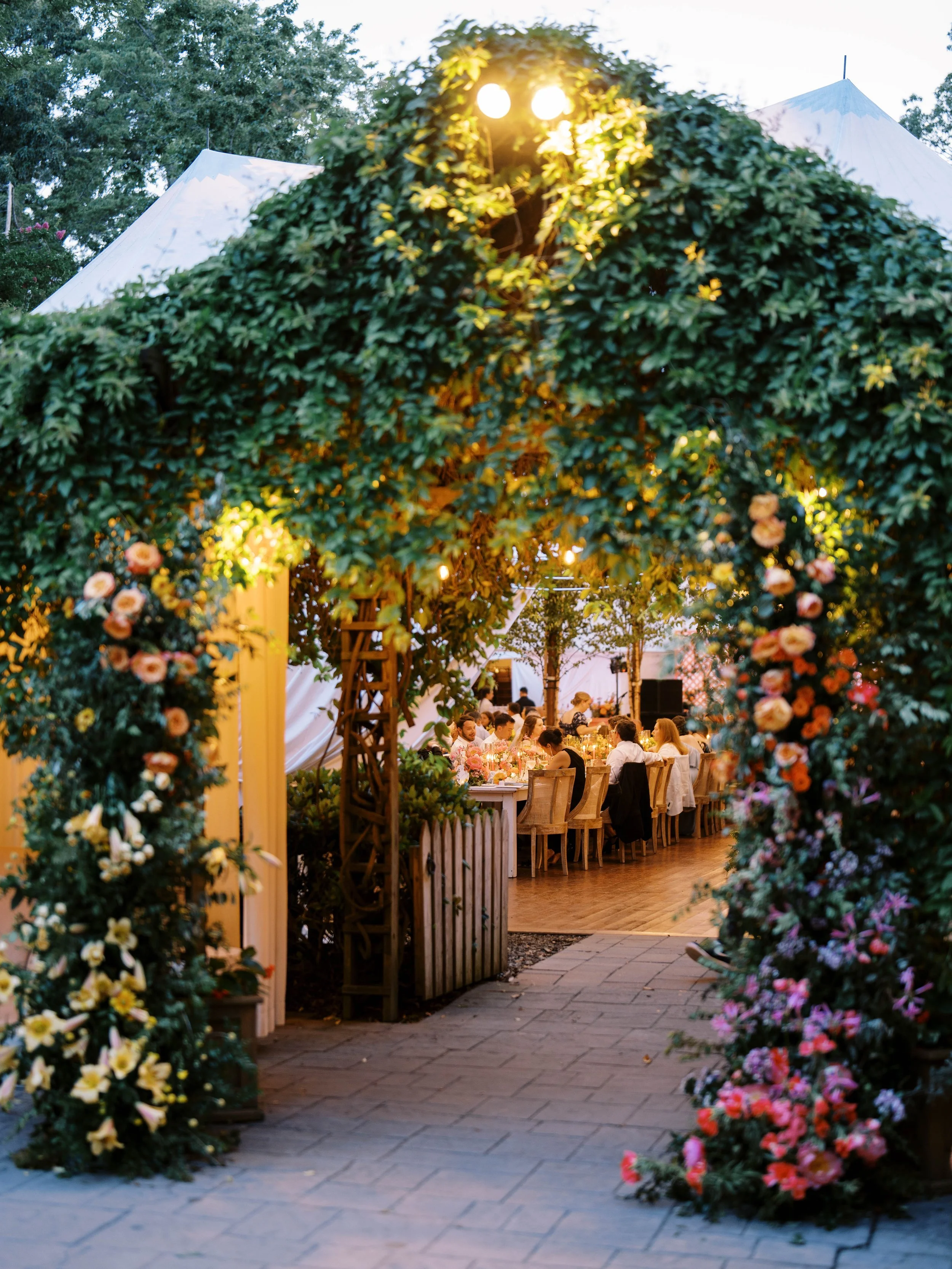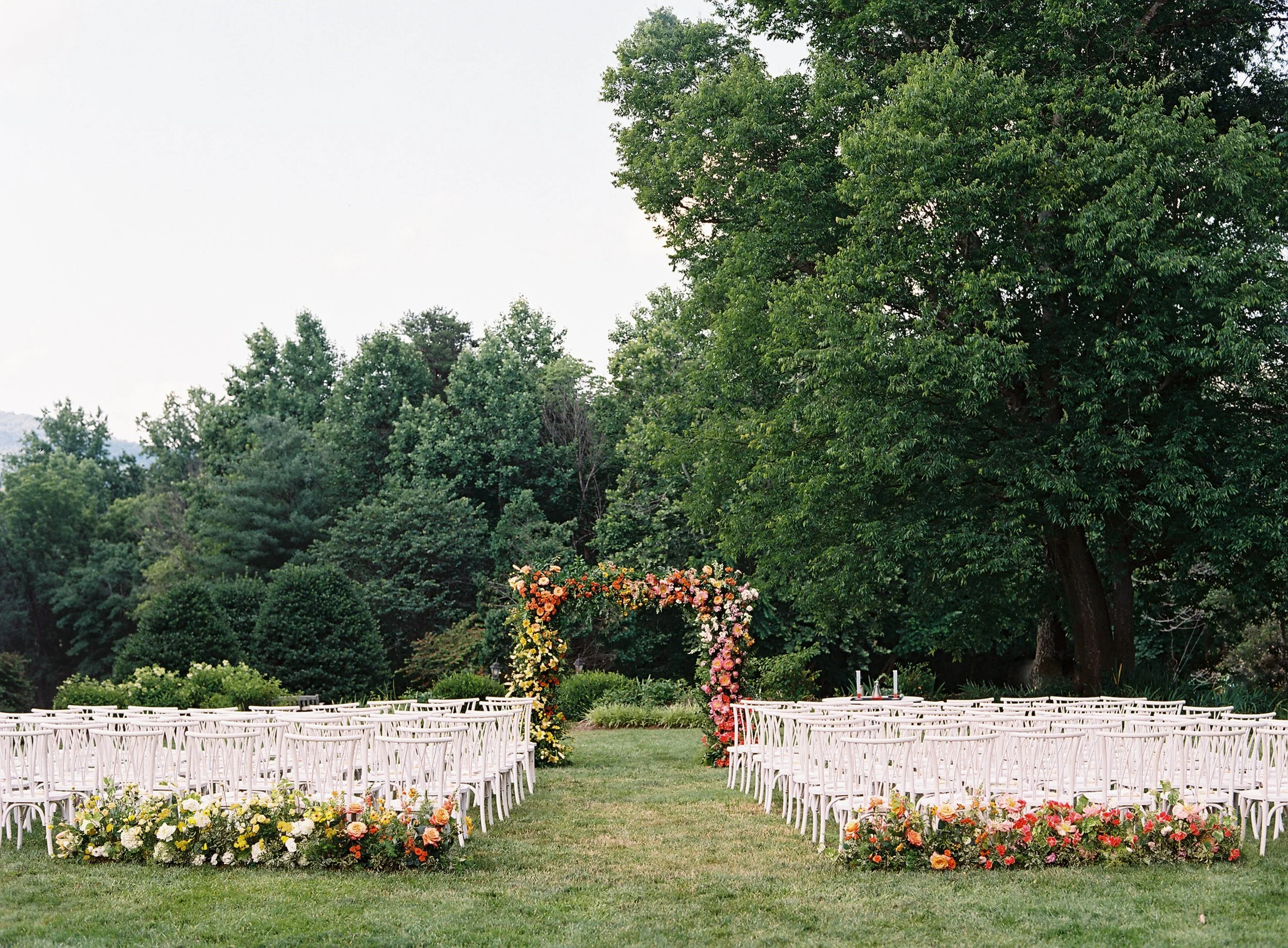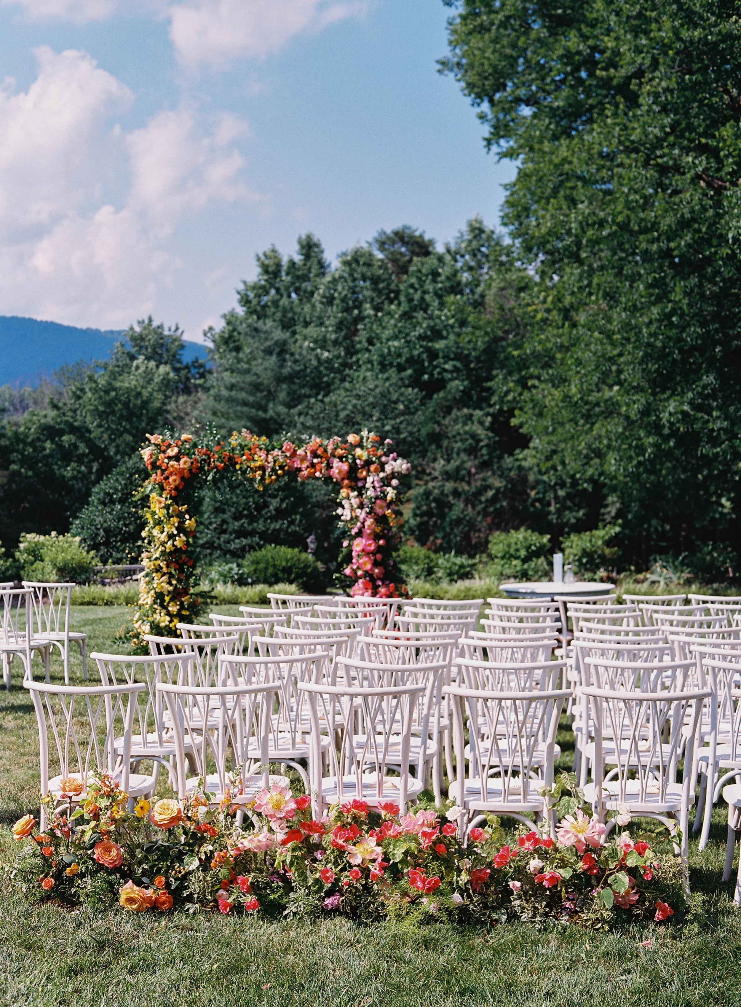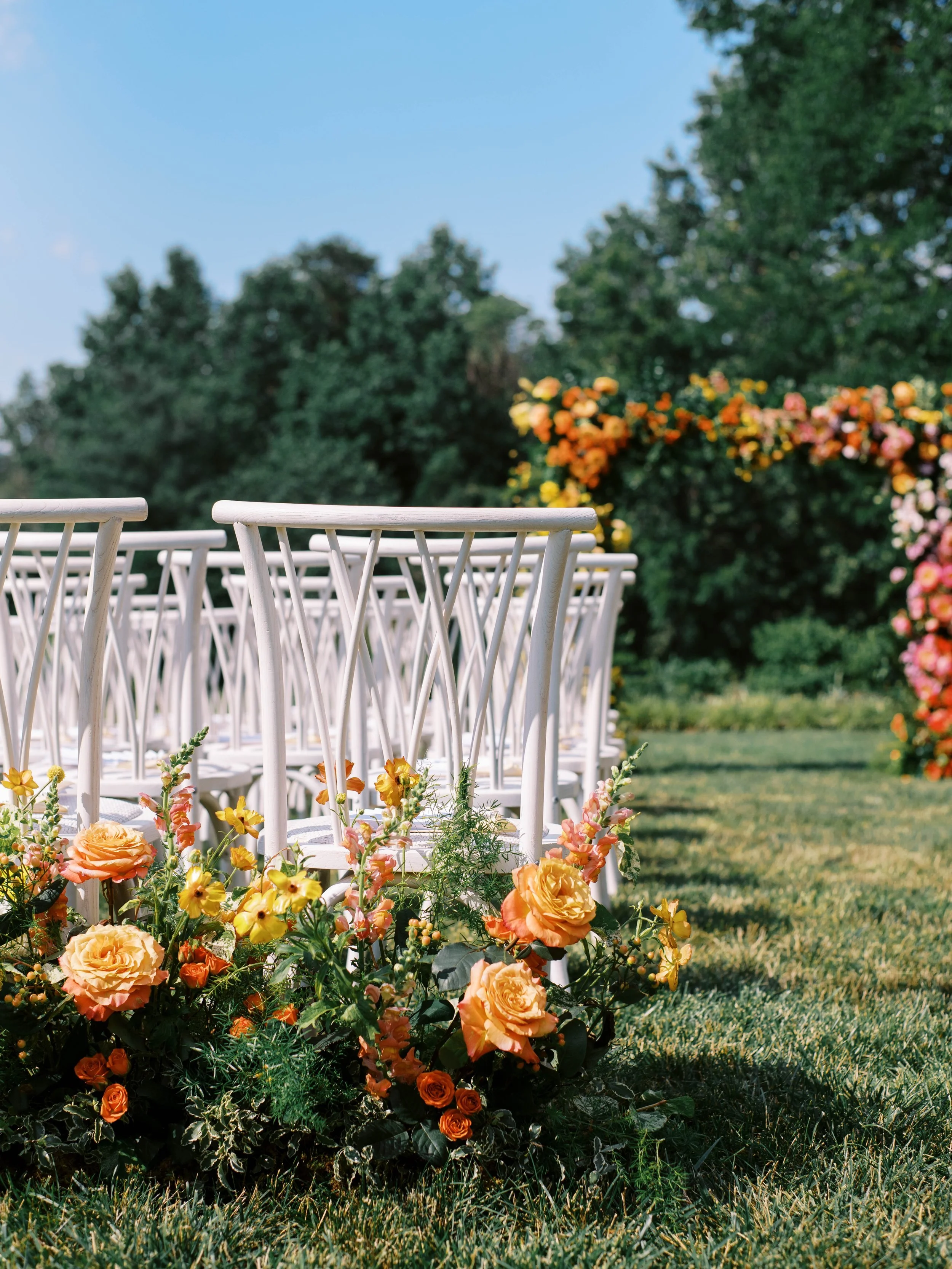 Emily and Brian’s colorful wedding incorporated fun pops of cheerful pinks, corals, and yellows. We loved helping to create that huge escort display filled with bud vases and were in awe the way those trees transformed the space. Planning by Kim Newton Weddings and photography by Ashley Cox Photography.