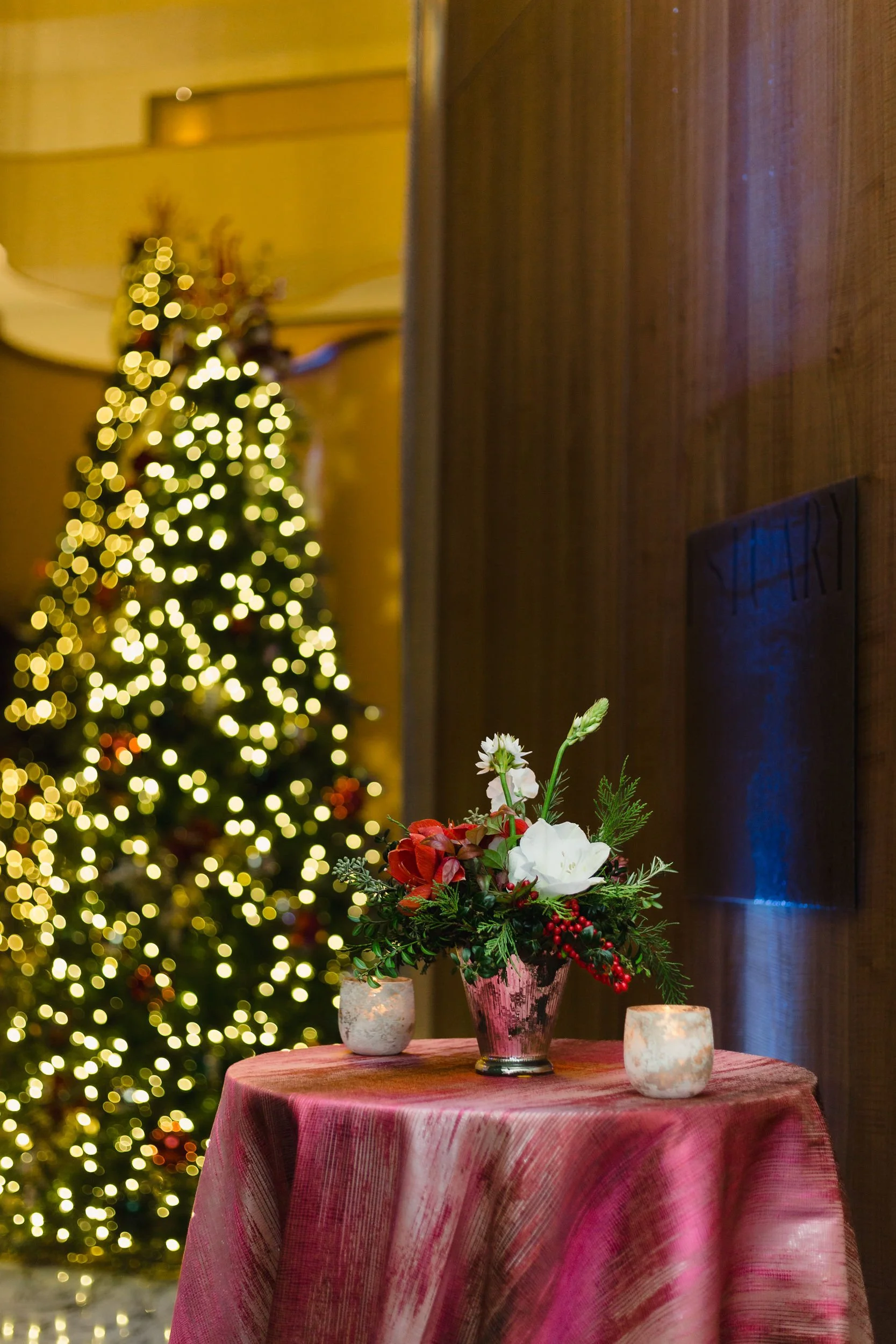 In collaboration with EVOKE DC, our holiday event design at the Conrad Hotel embraced festive warmth and refined style. We crafted rich seasonal arrangements featuring deep greens, whites, and metallic accents—perfect for a chic winter corporate gathering.