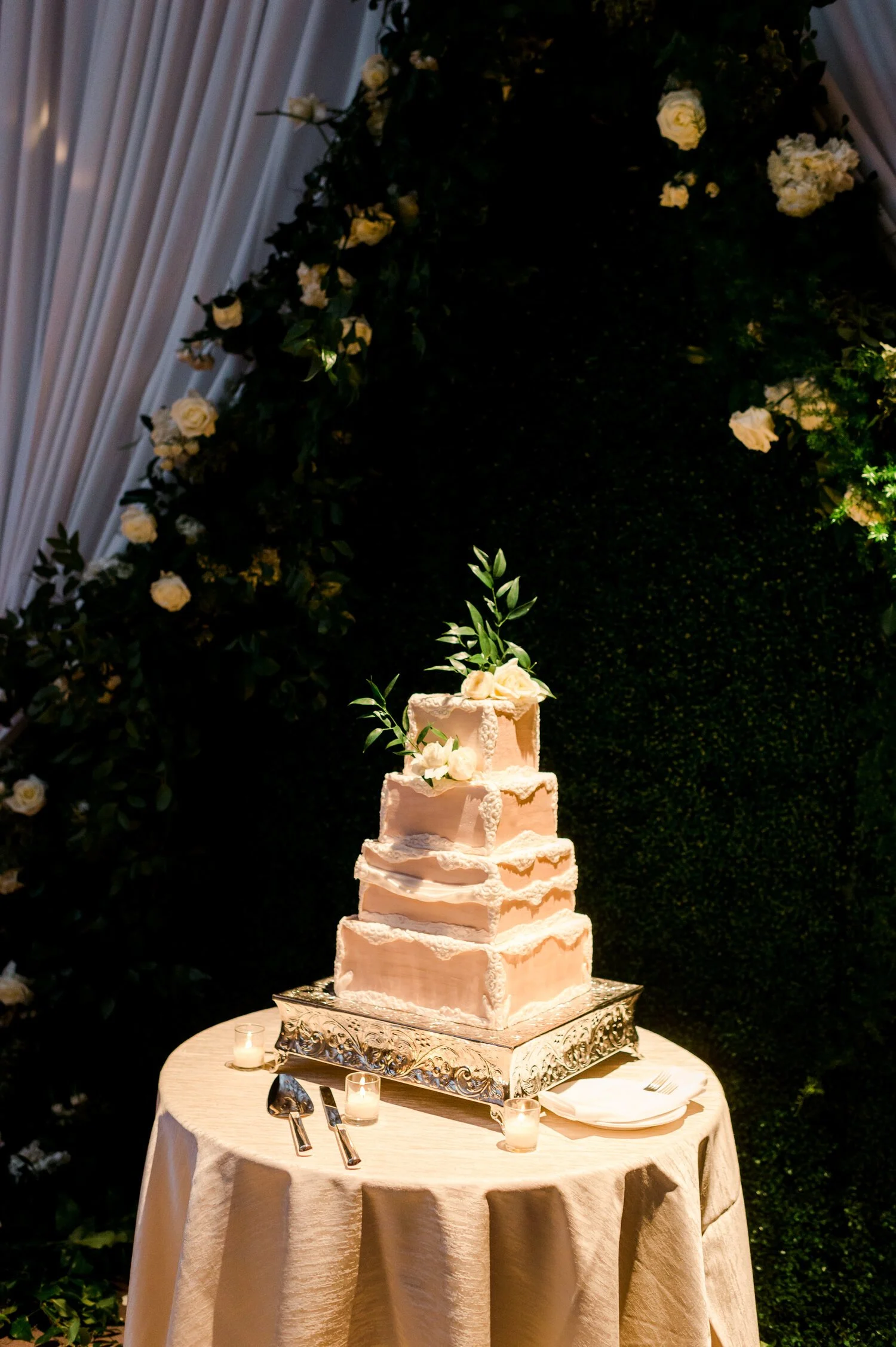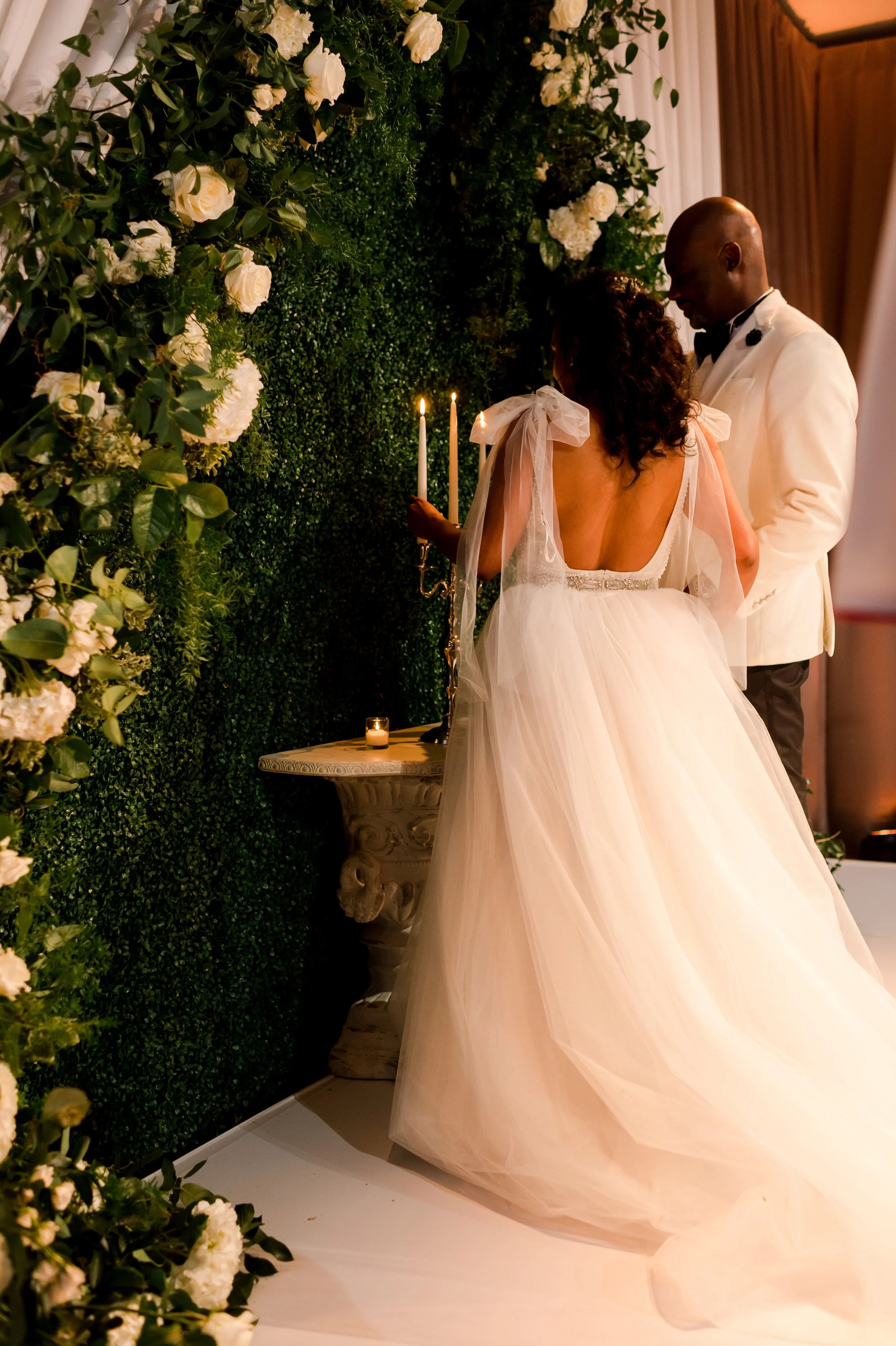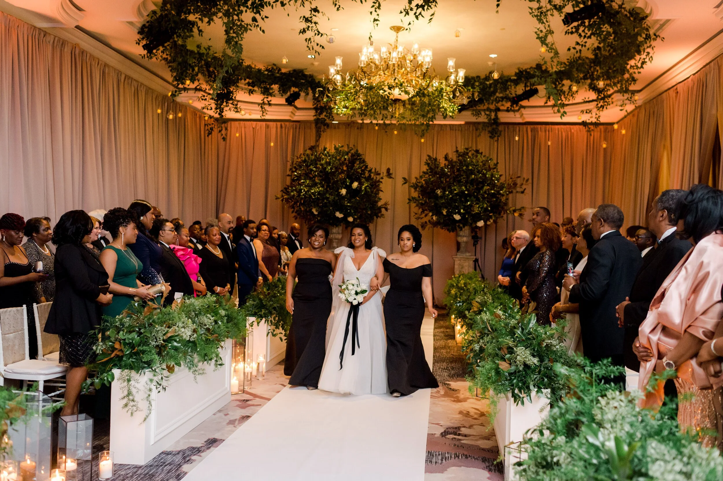 Denita + John’s southern-inspired wedding at the Ritz-Carlton was featured on Martha Stewart Weddings. Lush boxes filled with greenery lined the aisles as candles illuminated the walkway. Greenery was hung from the alcoves and chandeliers bringing a natural garden-feel to the guests. Crystal candelabras and candles galore lined the reception tables with floral accents throughout. This day was planned by Strawberry Milk Events with Lisa Ziesing photographing for Abby Jiu.