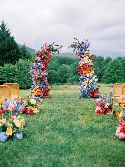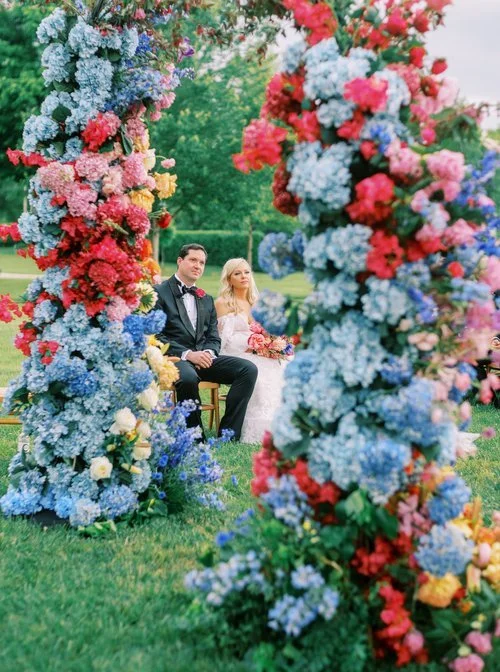 Kristy and Brian‘s wedding at The Inn at Little Washington was fun and whimsical with touches of hot air balloons everywhere. We used bright pink peonies, cool blue hydrangeas, and architectural lilies to create a fun and funky ceremony arch. Planning by Grit & Grace and photography by Perry Vaile Photography.